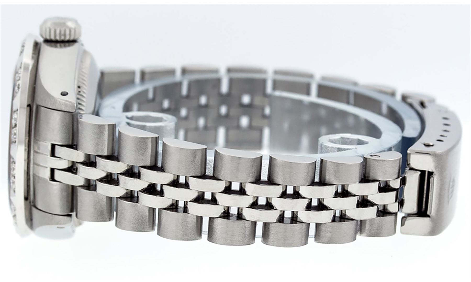 One Ladies Stainless Steel Rolex Datejust Polished Bright with Satin Finish, Serviced & Electronically Tested, Stainless Steel Case: 26mm, Stainless Steel Crown, Custom Bezel: New 18K White Gold Pyramid Diamond Bezel, Diamond Count: 24 Diamonds In Dial. Total Weight .50 Carat, Clarity: SI-VS, Color: G to H. Custom Crystal: New Scratch Resistant Synthetic Sapphire Cyclops Lens. Custom Hands: New Luminescent Hands. Movement: Automatic Winding Movement. Custom Dial: Slate Grey Diamond Dial. Diamond Count: 10 Diamonds In Dial. Clarity: SI-VS, Color: G to H. Date Window: 3 O'Clock Position Date Display, Model: Datejust. Condition: G-6 Extra Fine. Bracelet: Stainless Steel Jubilee Band With Rolex Crown On Buckle. Bright Polish & Satin Finish. Band Length: 6.0 Inch Length, Adjustable. Standard Clasp, With Rolex Logo. This Watch Has Been Serviced Time Tested And Is In Excellent Condition It Is Free Of All Scratches And Dents.