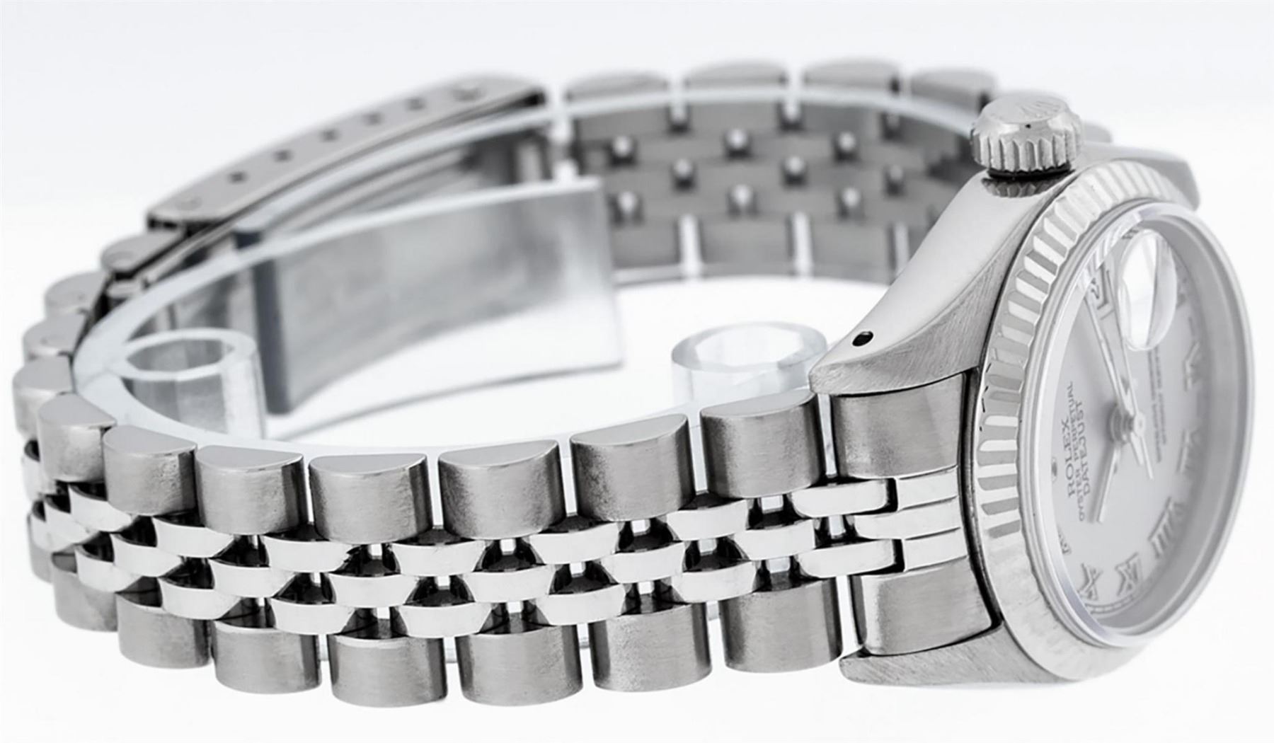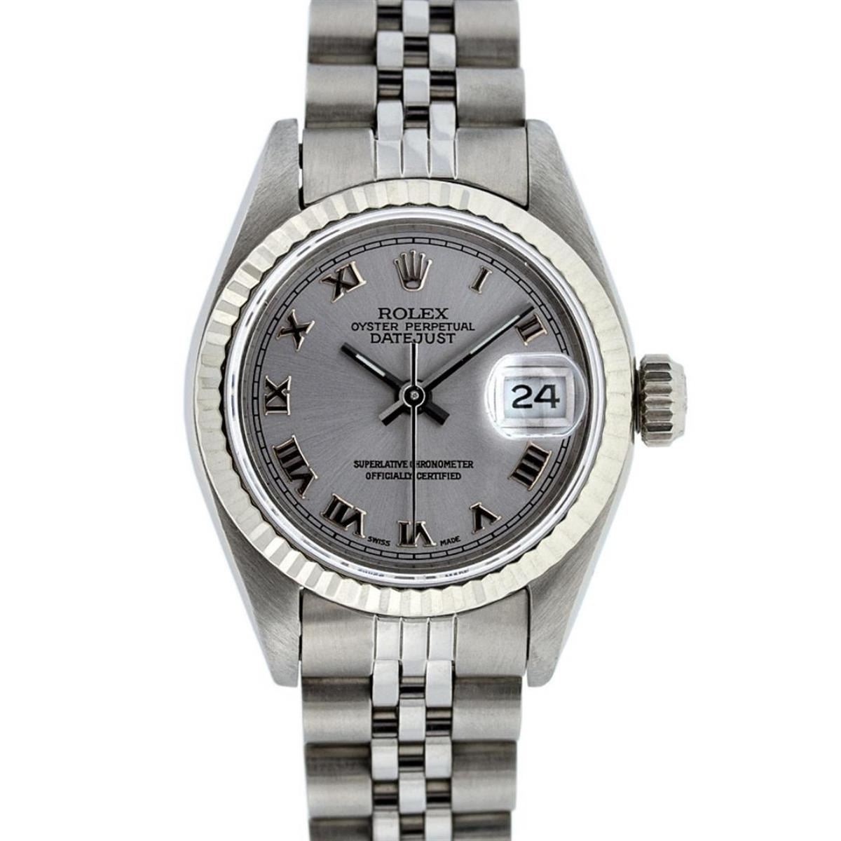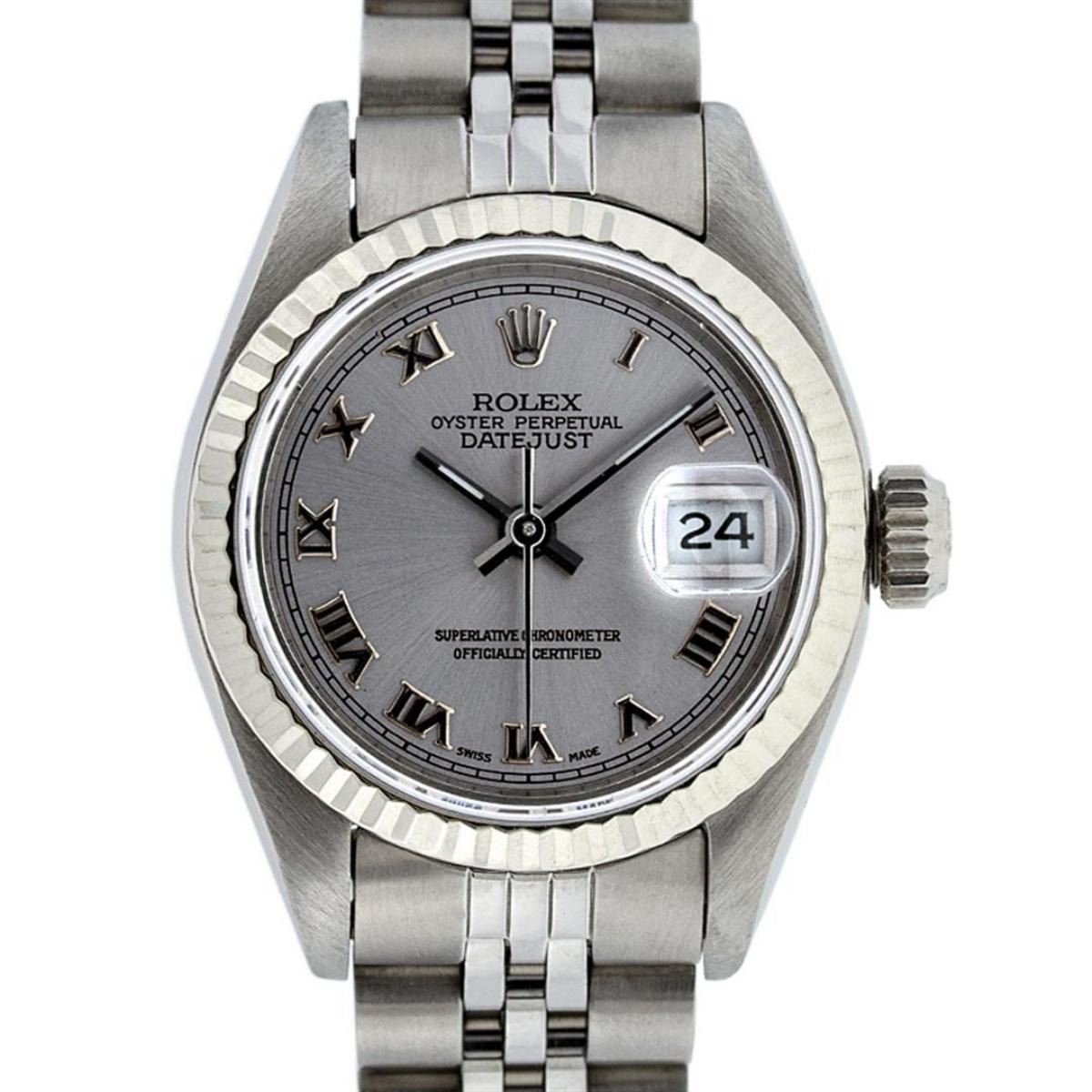 One Ladies Stainless Steel Rolex Datejust Polished Bright with Satin Finish, Serviced & Electronically Tested, Stainless Steel Case: 26mm, Stainless Steel Crown, Bezel: 14K White Gold Bezel. Custom Crystal: New Acrylic Cyclops Lens. Custom Hands: New Luminescent Hands. Movement: Automatic Winding Movement . Custom Dial: Refinished Slate Grey Roman Dial. Date Window: 3 O'Clock Position Date Display, Model: Datejust. Condition: G-6 Extra Fine. Bracelet: Stainless Steel Jubilee Band. Bright Polish & Satin Finish. 6.0 Inch Length, Adjustable. Standard Clasp, With Rolex Logo. This Watch Has Been Serviced Time Tested And Is In Excellent Condition It Is Free Of All Scratches And Dents.