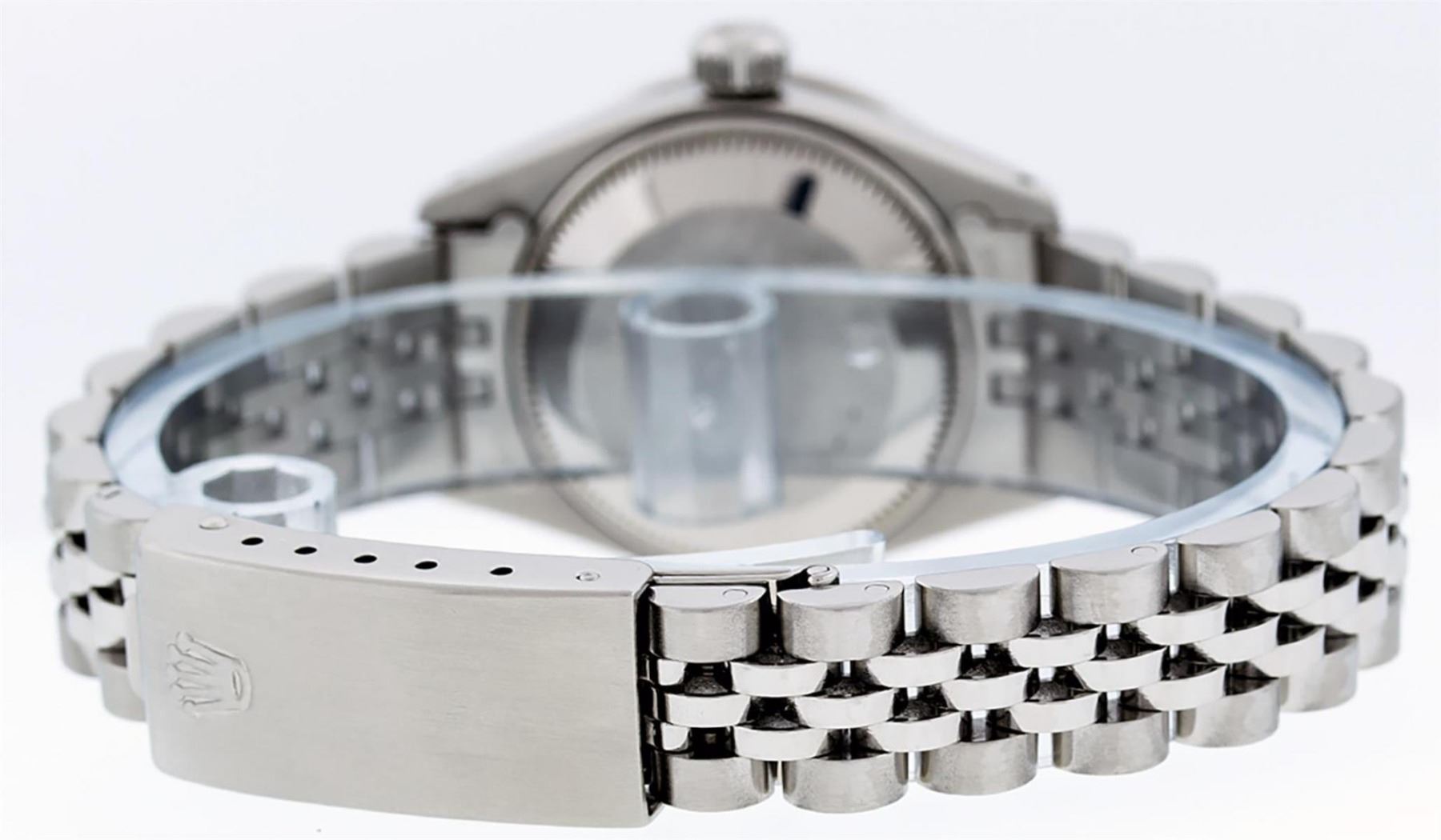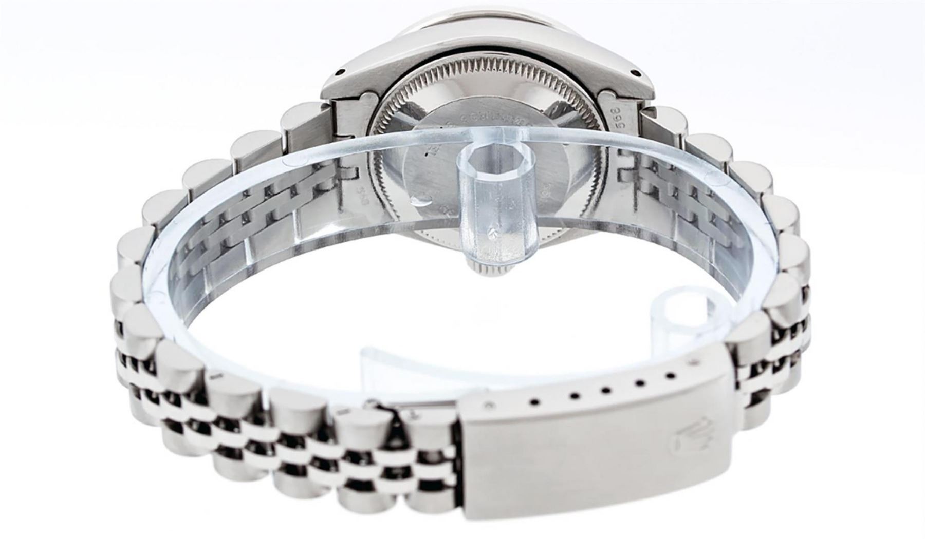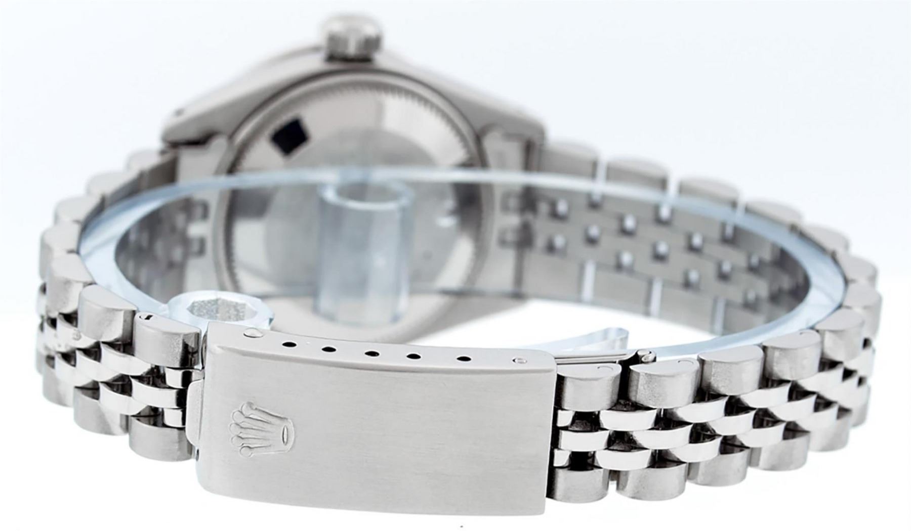 One Ladies Stainless Steel Rolex Datejust Polished Bright with Satin Finish, Serviced & Electronically Tested, Stainless Steel Case: 26mm, Stainless Steel Crown, Bezel: 14K White Gold Bezel. Custom Crystal: New Acrylic Cyclops Lens. Custom Hands: New Luminescent Hands. Movement: Automatic Winding Movement . Custom Dial: Refinished Slate Grey Roman Dial. Date Window: 3 O'Clock Position Date Display, Model: Datejust. Condition: G-6 Extra Fine. Bracelet: Stainless Steel Jubilee Band. Bright Polish & Satin Finish. 6.0 Inch Length, Adjustable. Standard Clasp, With Rolex Logo. This Watch Has Been Serviced Time Tested And Is In Excellent Condition It Is Free Of All Scratches And Dents.