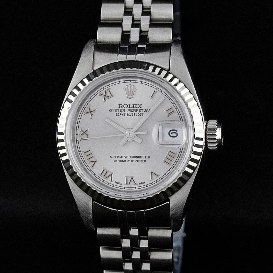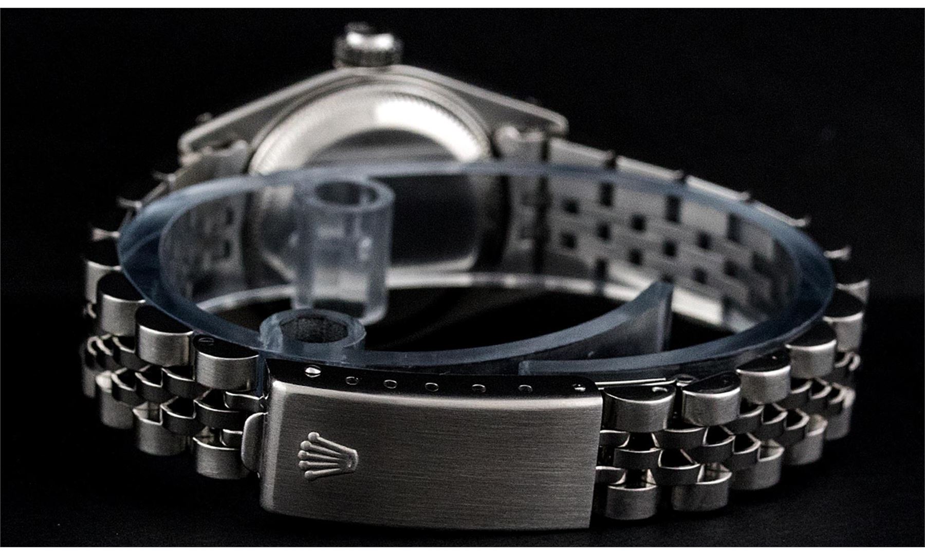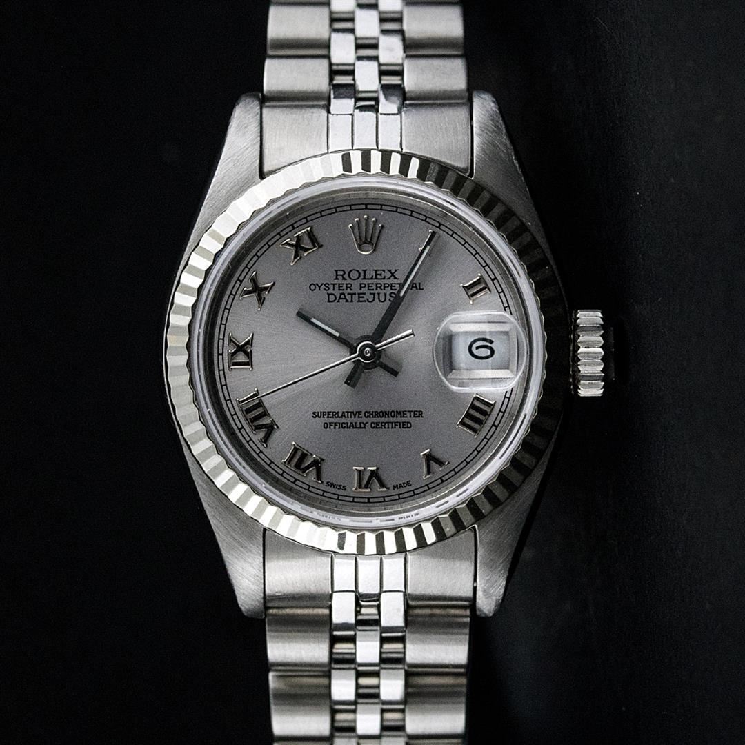 One Ladies Stainless Steel Rolex Datejust Polished Bright with Satin Finish, Serviced & Electronically Tested, Rolex Stainless Steel Case: 26mm, Rolex Stainless Steel Crown, Rolex Bezel: 14K White Gold Bezel. Custom Crystal: New With Cyclops Lens. Custom Hands: New Luminescent Hands. Rolex Movement: Automatic Winding Movement. Custom Dial: Slate Grey Roman. Date Window: 3 O'Clock Position Date Display, Model: Datejust. Condition: G-6 Extra Fine. Rolex Bracelet: Stainless Steel Jubilee Band. Bright Polish & Satin Finish. 6.0 Inch Length, Adjustable. Standard Clasp, With Rolex Logo. This Pre Owned Watch Has Been Serviced Time Tested And Is In Excellent Condition It Is Free Of All Scratches And Dents.