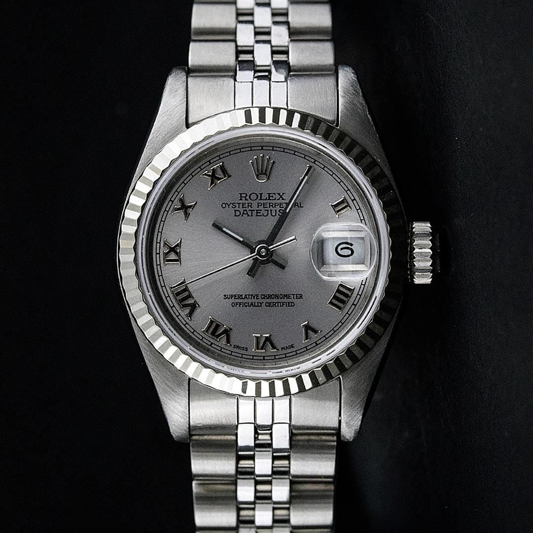 One Ladies Pre Owned Stainless Steel Rolex Polished Bright with Satin Finish, Serviced & Electronically Tested, Rolex Stainless Steel Case: 26mm, Rolex Stainless Steel Crown, Rolex Bezel: 14K White Gold Bezel. Custom Crystal: New Sapphire With Date Window. Custom Hands: New Luminescent Hands. Rolex Movement: Automatic Winding Movement. Custom Dial: Slate Grey Roman With Square Track. Date Window: 3 O'Clock Position Date Display, Model: Datejust. Condition: G-6 Extra Fine. Rolex Bracelet: Stainless Steel Jubilee Band. Bright Polish & Satin Finish. 6.0 Inch Length, Adjustable. Standard Clasp, With Rolex Logo. This Pre Owned Watch Has Been Serviced Time Tested And Is In Excellent Condition It Is Free Of All Scratches And Dents.