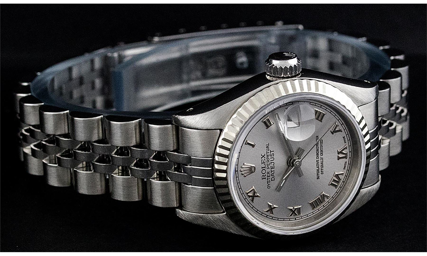 One Ladies Pre Owned Stainless Steel Rolex Polished Bright with Satin Finish, Serviced & Electronically Tested, Rolex Stainless Steel Case: 26mm, Rolex Stainless Steel Crown, Rolex Bezel: 14K White Gold Bezel. Custom Crystal: New Sapphire With Date Window. Custom Hands: New Luminescent Hands. Rolex Movement: Automatic Winding Movement. Custom Dial: Slate Grey Roman With Square Track. Date Window: 3 O'Clock Position Date Display, Model: Datejust. Condition: G-6 Extra Fine. Rolex Bracelet: Stainless Steel Jubilee Band. Bright Polish & Satin Finish. 6.0 Inch Length, Adjustable. Standard Clasp, With Rolex Logo. This Pre Owned Watch Has Been Serviced Time Tested And Is In Excellent Condition It Is Free Of All Scratches And Dents.