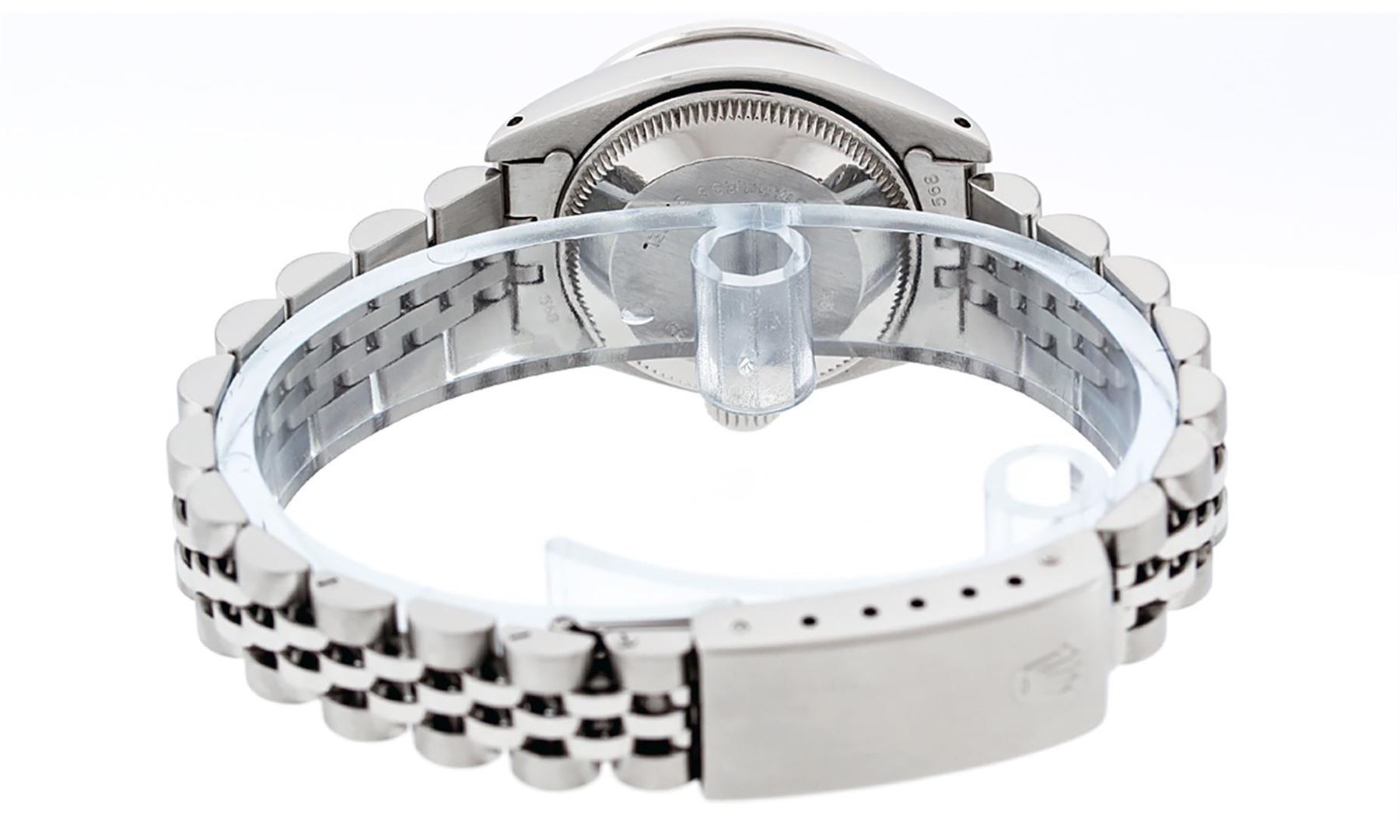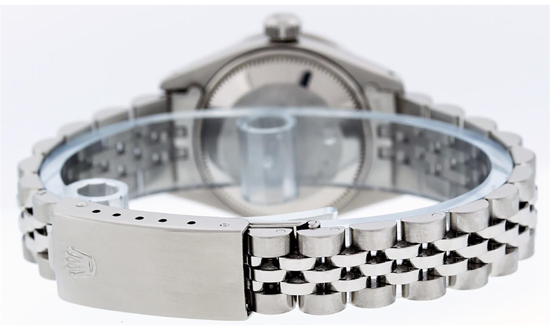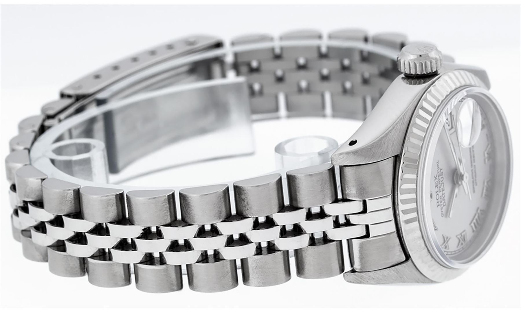 One Ladies Pre Owned Stainless Steel Rolex Polished Bright with Satin Finish, Serviced & Electronically Tested, Rolex Stainless Steel Case: 26mm, Rolex Stainless Steel Crown, Rolex Bezel: 14K White Gold Bezel. Custom Crystal: New Sapphire With Date Window. Custom Hands: New Luminescent Hands. Rolex Movement: Automatic Winding Movement. Custom Dial: Slate Grey Roman With Square Track. Date Window: 3 O'Clock Position Date Display, Model: Datejust. Condition: G-6 Extra Fine. Rolex Bracelet: Stainless Steel Jubilee Band. Bright Polish & Satin Finish. 6.0 Inch Length, Adjustable. Standard Clasp, With Rolex Logo. This Pre Owned Watch Has Been Serviced Time Tested And Is In Excellent Condition It Is Free Of All Scratches And Dents.