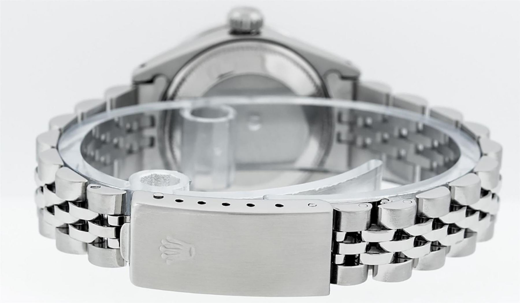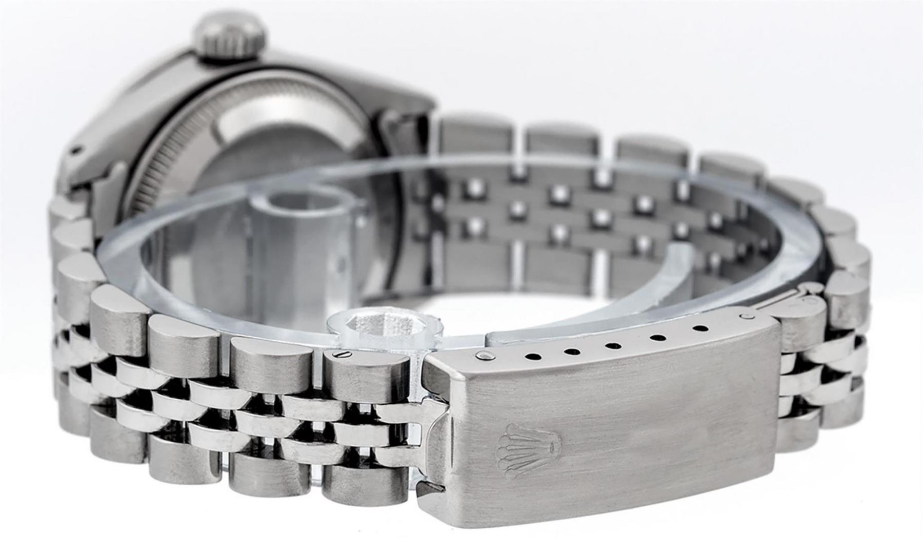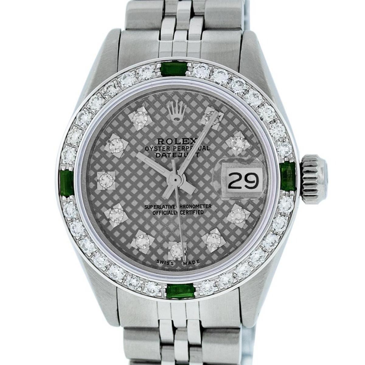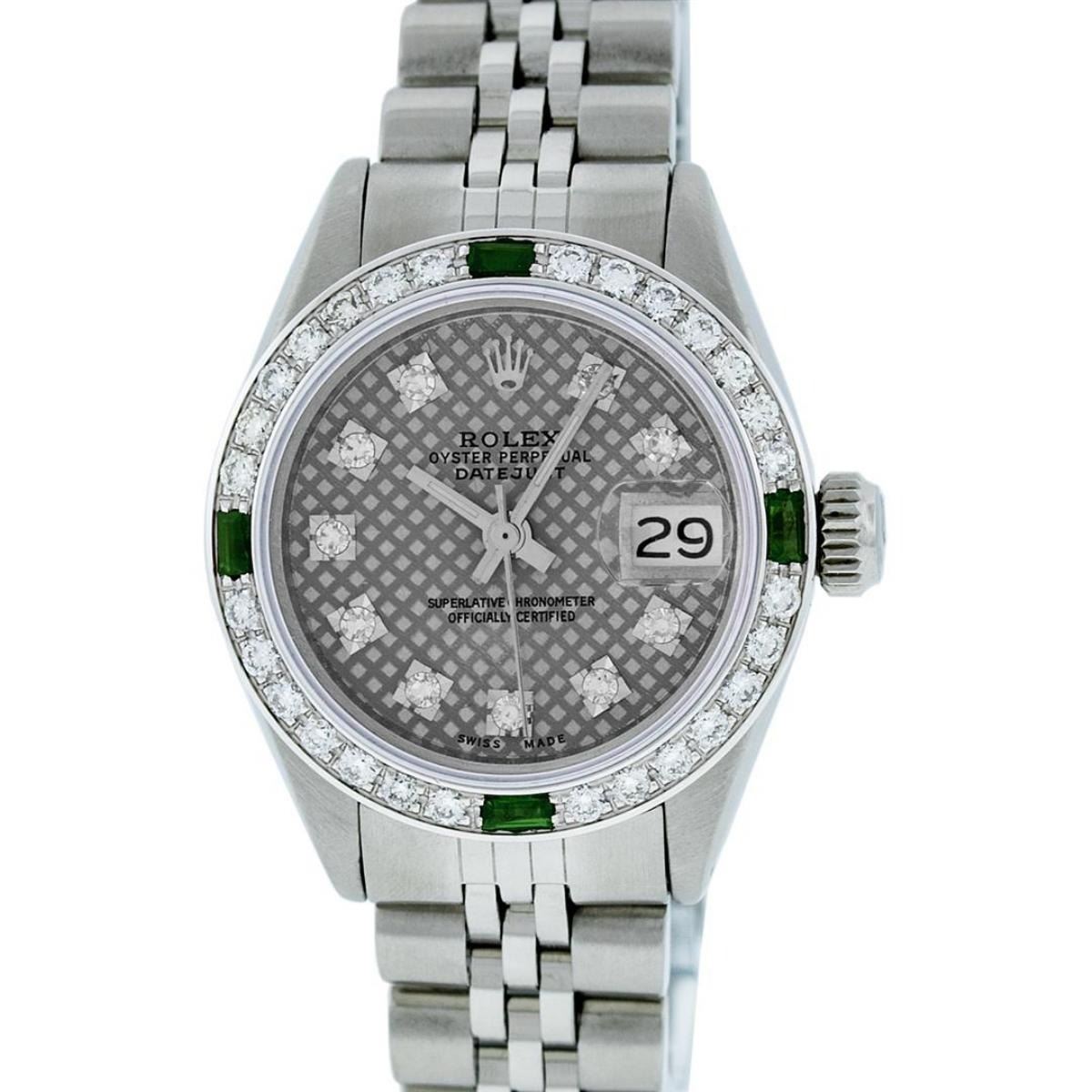 One Ladies Stainless Steel Rolex Datejust Polished Bright with Satin Finish, Serviced & Electronically Tested, Stainless Steel Case: 26mm, Stainless Steel Crown, Custom Bezel: New 18K White Emerald Beadset Diamond Bezel, Diamond + Gem Count: 28 Diamonds + 4 Emeralds. Total Weight .70 Carat, Clarity: SI-VS, Color: G to H. Custom Crystal: New Scratch Resistant Synthetic Sapphire Cyclops Lens. Custom Hands: New Luminescent Hands. Movement: Automatic Winding Movement. Custom Dial: Slate Grey Stamp With Single Cut Diamond Hour Markers, 10 Diamonds in Dial, G To H In Color, Clarity: SI-VS. Date Window: 3 O'Clock Position Date Display, Model: Datejust. Condition: G-6 Extra Fine. Bracelet: Stainless Steel Jubilee Band. Bright Polish & Satin Finish. 6.0 Inch Length, Adjustable. Standard Clasp, With Rolex Logo. This Watch Has Been Serviced Time Tested And Is In Excellent Condition It Is Free Of All Scratches And Dents.