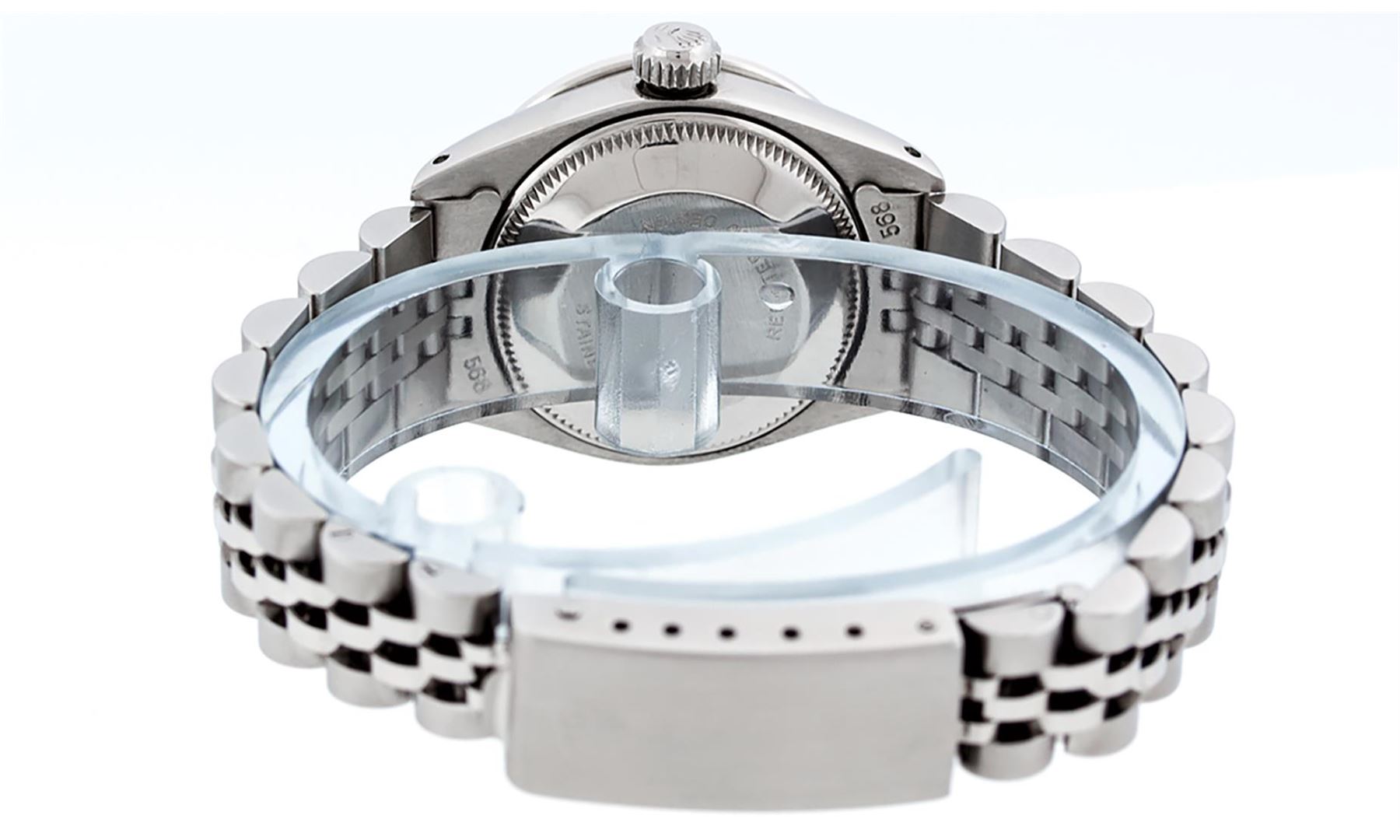 One Ladies Stainless Steel Rolex Datejust Polished Bright with Satin Finish, Serviced & Electronically Tested, Stainless Steel Case: 26mm, Stainless Steel Crown, Custom Bezel: New 18K White Emerald Beadset Diamond Bezel, Diamond + Gem Count: 28 Diamonds + 4 Emeralds. Total Weight .70 Carat, Clarity: SI-VS, Color: G to H. Custom Crystal: New Scratch Resistant Synthetic Sapphire Cyclops Lens. Custom Hands: New Luminescent Hands. Movement: Automatic Winding Movement. Custom Dial: Slate Grey Stamp With Single Cut Diamond Hour Markers, 10 Diamonds in Dial, G To H In Color, Clarity: SI-VS. Date Window: 3 O'Clock Position Date Display, Model: Datejust. Condition: G-6 Extra Fine. Bracelet: Stainless Steel Jubilee Band. Bright Polish & Satin Finish. 6.0 Inch Length, Adjustable. Standard Clasp, With Rolex Logo. This Watch Has Been Serviced Time Tested And Is In Excellent Condition It Is Free Of All Scratches And Dents.