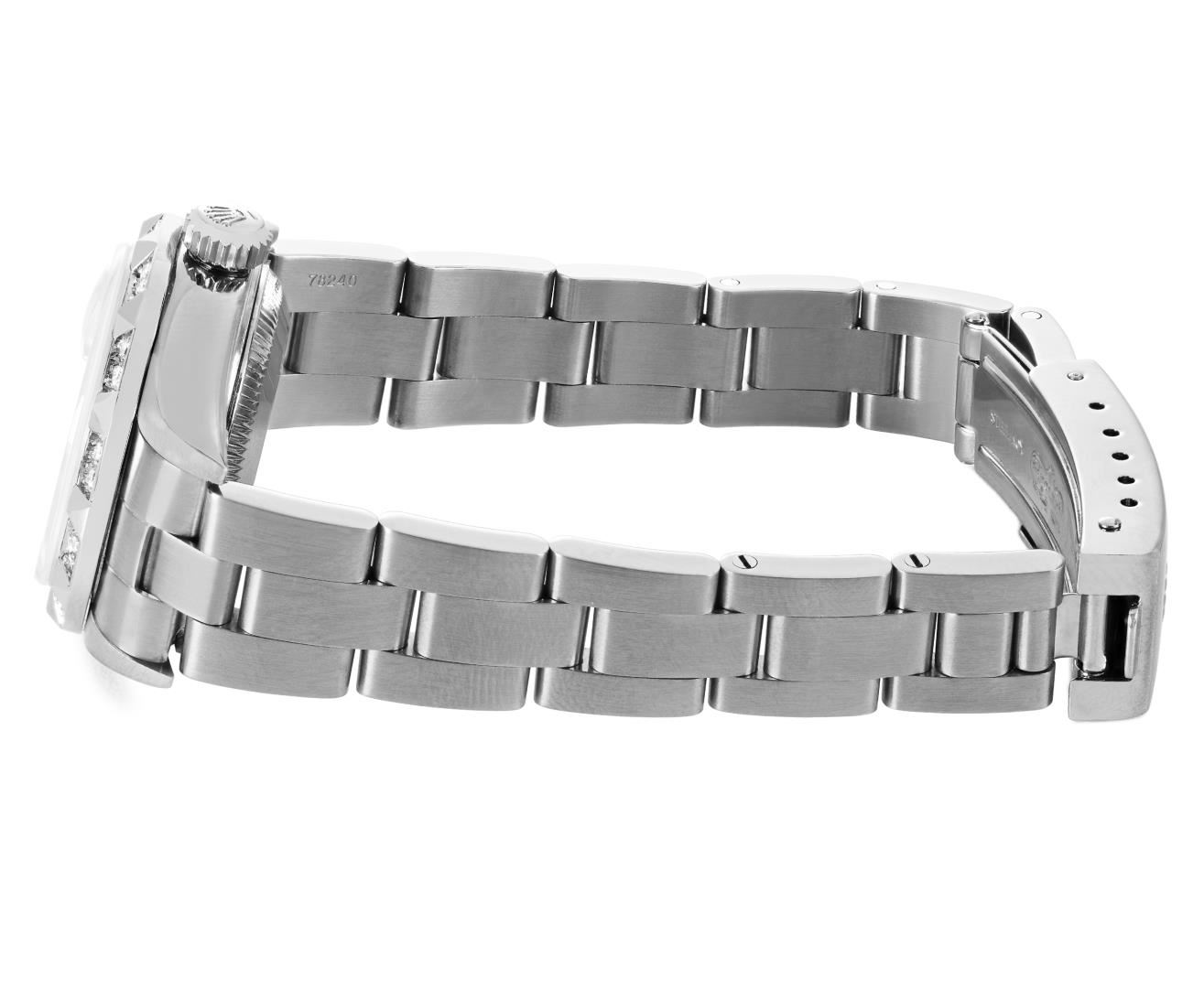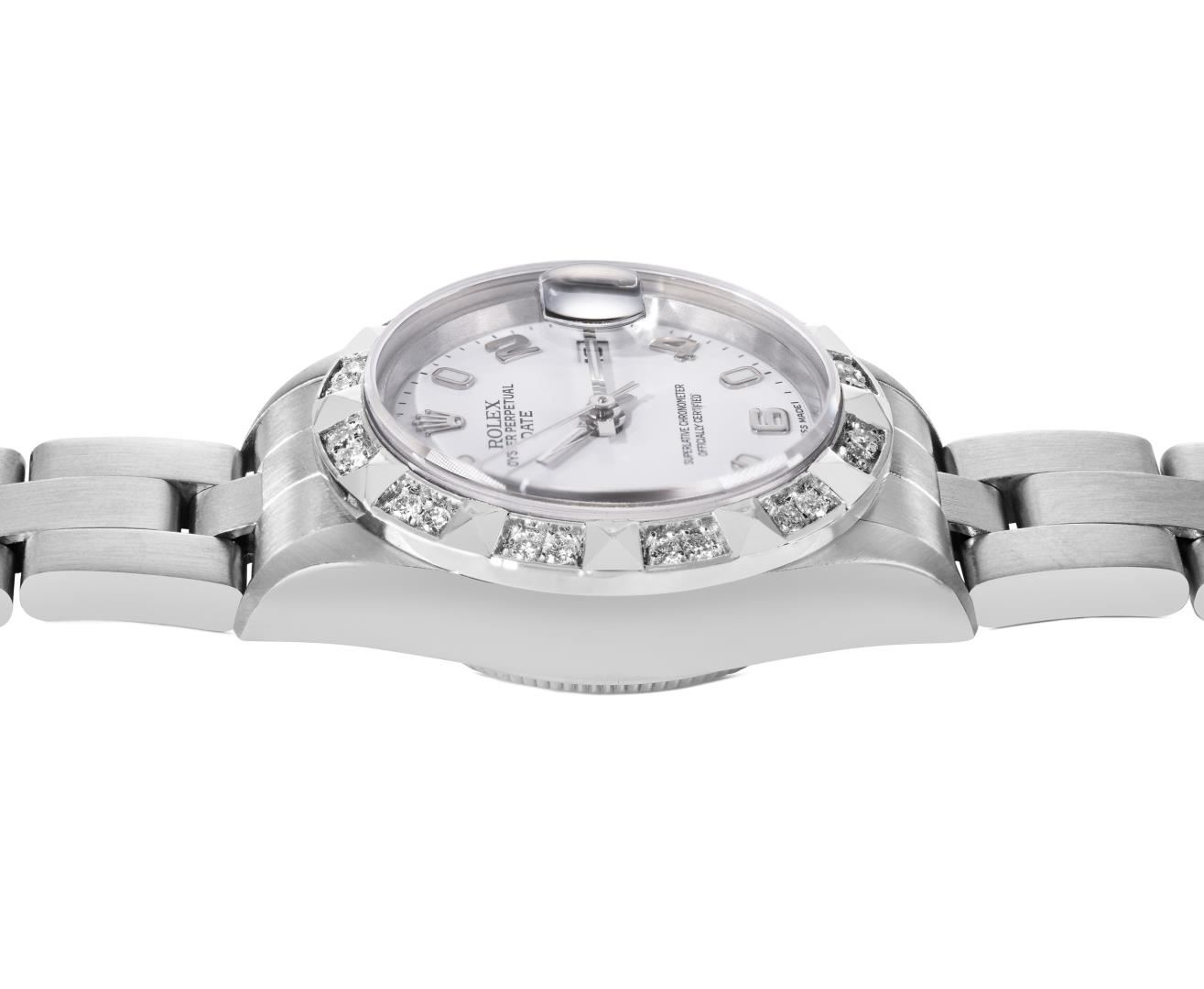One Rolex Ladies Pre Owned Quickset Stainless Steel Date Wristwatch Polished Bright with Satin Finish, Serviced & Electronically Tested, Stainless Steel Case: 26mm, Stainless Steel Crown, Custom Bezel: New 18K White Gold Pyramid Diamond Bezel, Diamond Count: 24 Diamonds On Bezel. Custom Crystal: New Sapphire With Magnified Date Window. Custom Hands: New Luminescent Hands. Rolex Movement: 2235 Automatic Winding Movement. Rolex Dial: Factory White Arabic Dial With Luminous Index Hour Markers With a Dash Track. Date Window: 3 O'Clock Position Date Display, Model: Quickset Date. Condition: G-6 Extra Fine. Rolex Bracelet: Stainless Steel Oyster Band. Bright Polish And Satin Finish. 6.0 Inch Length, Adjustable. Standard Clasp, With Rolex Logo. This Watch Has Been Serviced Time Tested And Is In Excellent Condition. It Is Free Of All Scratches And Dents. This Watch Comes With A Rolex Box.