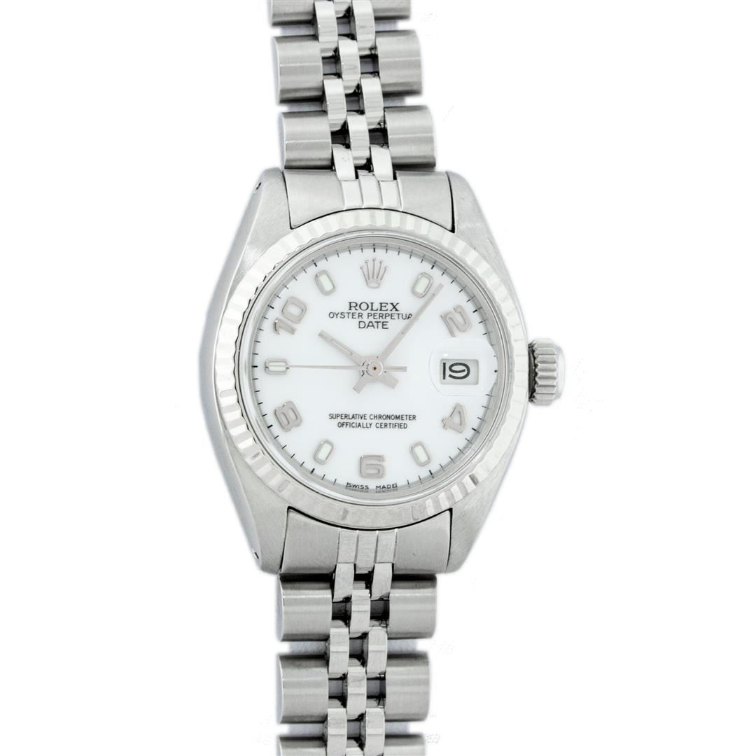 One Ladies Pre Owned Stainless Steel Rolex Polished Bright with Satin Finish, Serviced & Electronically Tested, Rolex Stainless Steel Case: 26mm, Rolex Stainless Steel Crown, Rolex Bezel: 14K White Gold Fluted Bezel. Custom Crystal: New With Magnified Date Window. Custom Hands: New Luminescent Hands. Rolex Movement: Automatic Winding Movement. Rolex Dial: White Arabic Dial With Dash Track, Date Window: 3 O'Clock Position Date Display, Model: Datejust. Condition: G-6 Extra Fine. Rolex Bracelet: Stainless Steel Jubilee Band. Bright Polish & Satin Finish. 6.0 Inch Length, Adjustable. Standard Clasp, With Rolex Logo. This Watch Has Been Serviced Time Tested And Is In Excellent Condition It Is Free Of All Scratches And Dents.