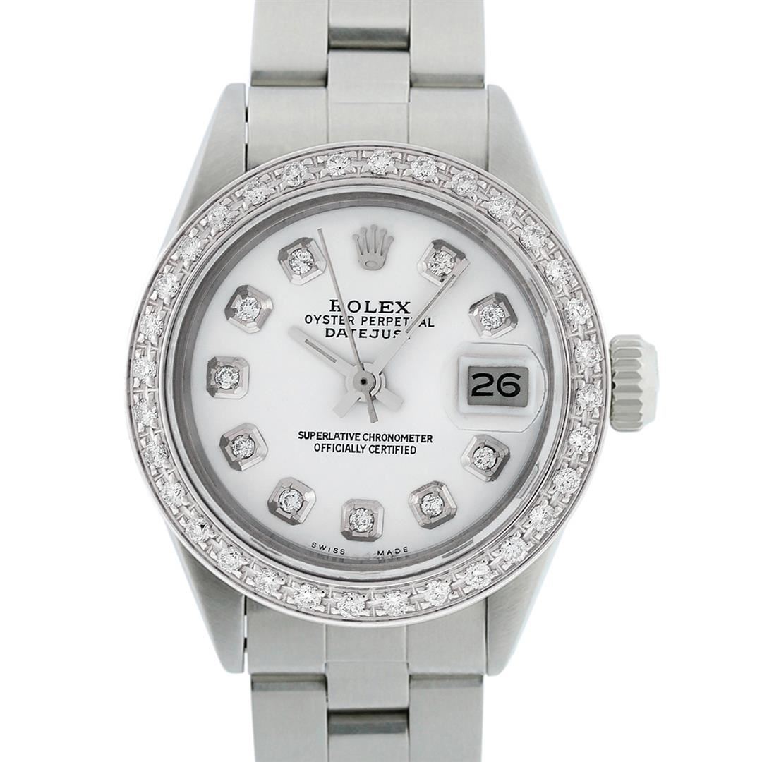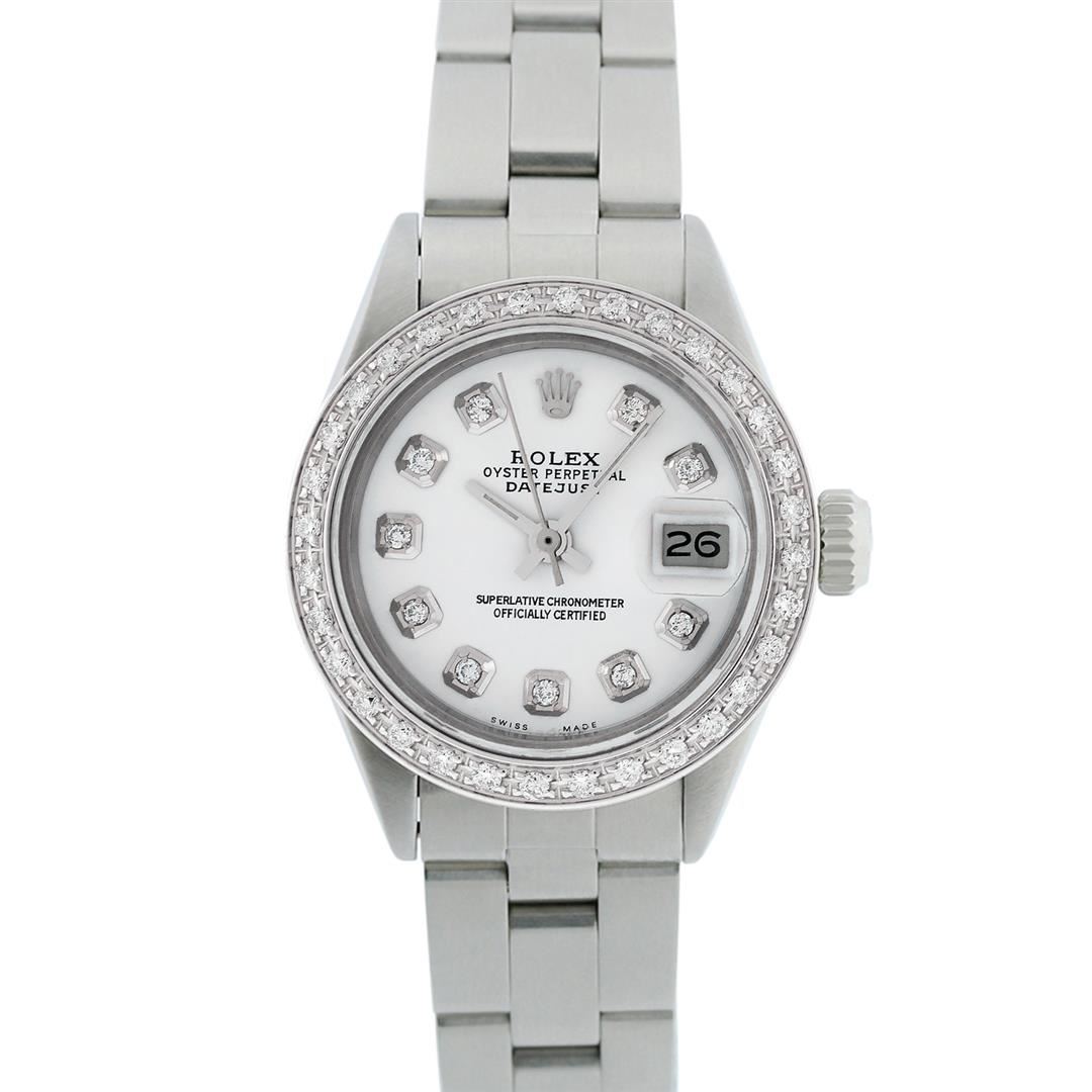 One Ladies Pre Owned Stainless Steel Rolex Datejust Polished Bright with Satin Finish, Serviced & Electronically Tested, Stainless Steel Case: 26mm, Stainless Steel Crown, Custom Bezel: New 18K White Gold Beadset Diamond Bezel, Diamond Count: 32 Diamonds, Clarity: SI-VS, Color: G to H. Custom Crystal: New Sapphire With Date Window. Custom Hands: New Luminescent Hands. Rolex Movement: Automatic Winding Movement. Custom Dial: Refinished To White With Custom Added Diamonds, Diamond Count: 10 Diamonds In Dial, Color: G To H, Clarity: SI-VS. Date Window: 3 O'Clock Position Date Display, Model: Datejust. Condition: G-6 Extra Fine. Rolex Bracelet: Stainless Steel Oyster Band. Bright Polish & Satin Finish. 6.0 Inch Length, Adjustable. Standard Clasp, With Rolex Logo. This Watch Has Been Serviced Time Tested And Is In Excellent Condition It Is Free Of All Scratches And Dents.