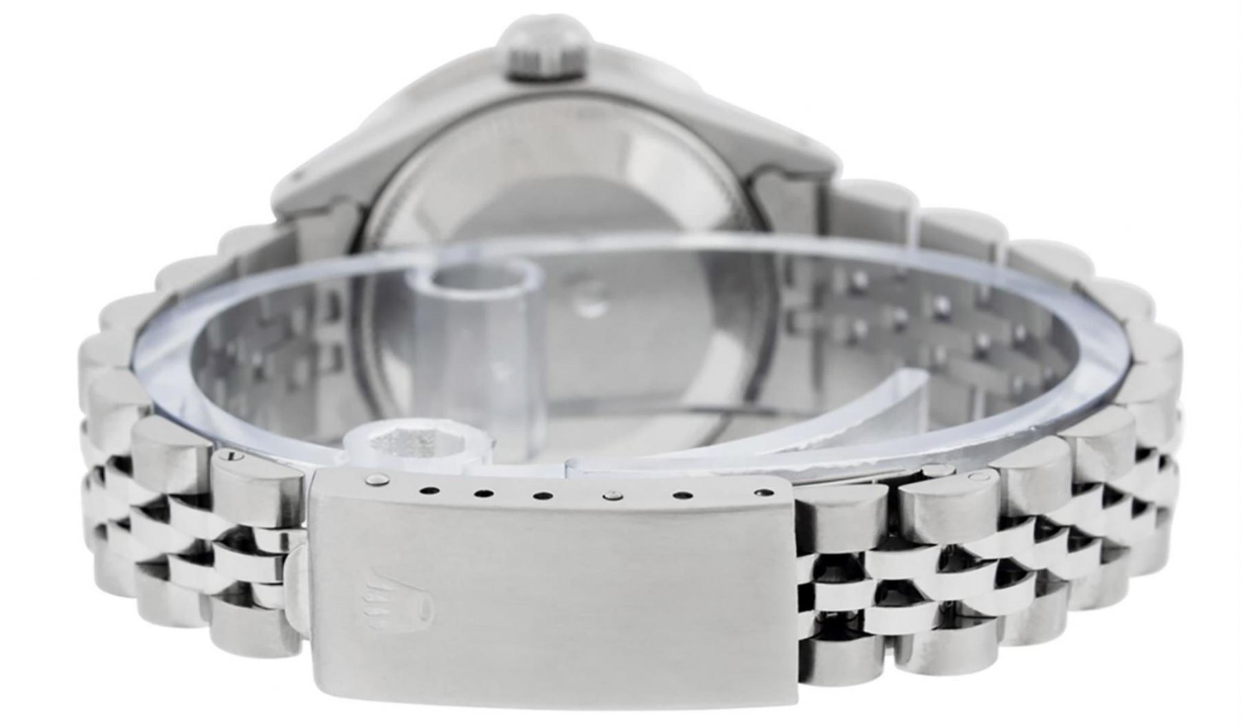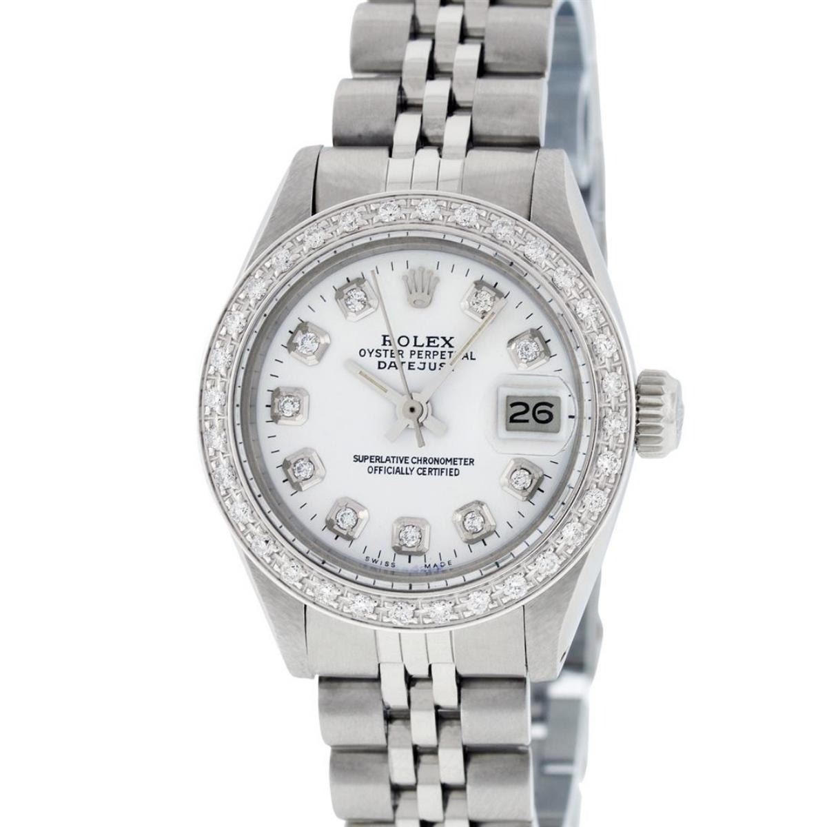 One Ladies Stainless Steel Rolex Datejust Polished Bright with Satin Finish, Serviced & Electronically Tested, Stainless Steel Case: 26mm, Stainless Steel Crown, Custom Bezel: New 18K White Gold Beadset Diamond Bezel, Diamond Count: 32 Diamonds, Total Weight .70 Carat, Clarity: SI-VS, Color: G to H. Custom Crystal: New Synthetic Sapphire Cyclops Lens. Custom Hands: New Luminescent Hands. Movement: Automatic Winding Movement. Custom Dial: White Diamond Dial, Diamond Count: 10 Diamonds In Dial, Color: G To H, Clarity: SI-VS. Date Window: 3 O'Clock Position Date Display, Model: Datejust. Condition: G-6 Extra Fine. Bracelet: Stainless Steel Jubilee. Bright Polish & Satin Finish. 6.0 Inch Length, Adjustable. Standard Clasp, With Rolex Logo. This Watch Has Been Serviced Time Tested And Is In Excellent Condition It Is Free Of All Scratches And Dents.