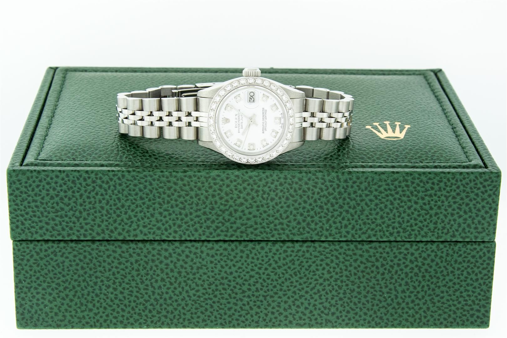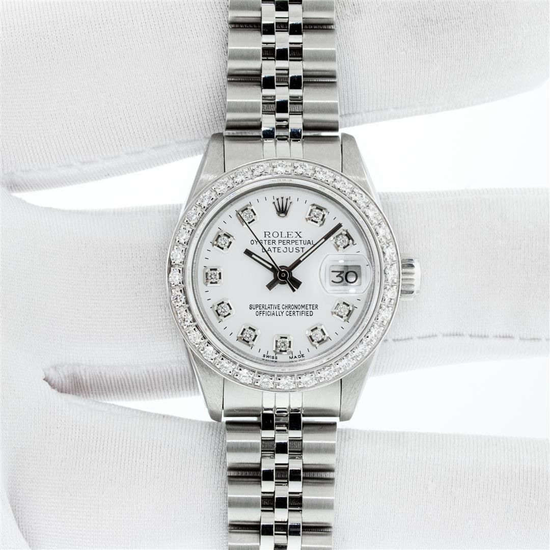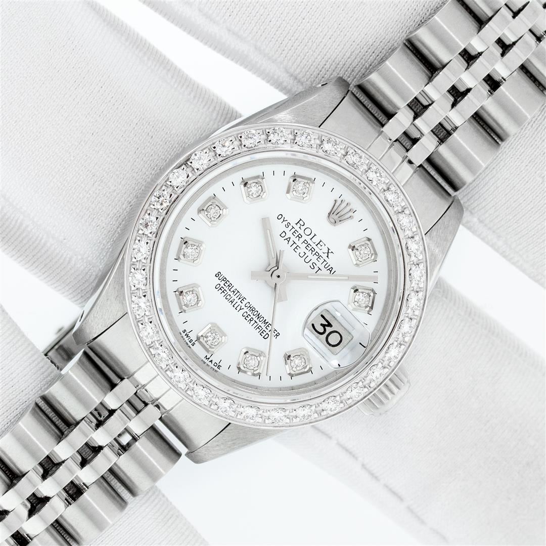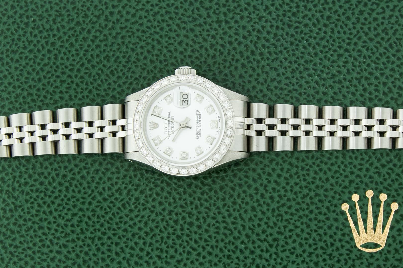 One Ladies Stainless Steel Rolex Datejust Polished Bright with Satin Finish, Serviced & Electronically Tested, Stainless Steel Case: 26mm, Stainless Steel Crown, Custom Bezel: New 18K White Gold Beadset Diamond Bezel, Diamond Count: 32 Diamonds, Total Weight .70 Carat, Clarity: SI-VS, Color: G to H. Custom Crystal: New Synthetic Sapphire Cyclops Lens. Custom Hands: New Luminescent Hands. Movement: Automatic Winding Movement. Custom Dial: White Diamond Dial, Diamond Count: 10 Diamonds In Dial, Color: G To H, Clarity: SI-VS. Date Window: 3 O'Clock Position Date Display, Model: Datejust. Condition: G-6 Extra Fine. Bracelet: Stainless Steel Jubilee. Bright Polish & Satin Finish. 6.0 Inch Length, Adjustable. Standard Clasp, With Rolex Logo. This Watch Has Been Serviced Time Tested And Is In Excellent Condition It Is Free Of All Scratches And Dents. This Watch Comes With A Rolex Box.