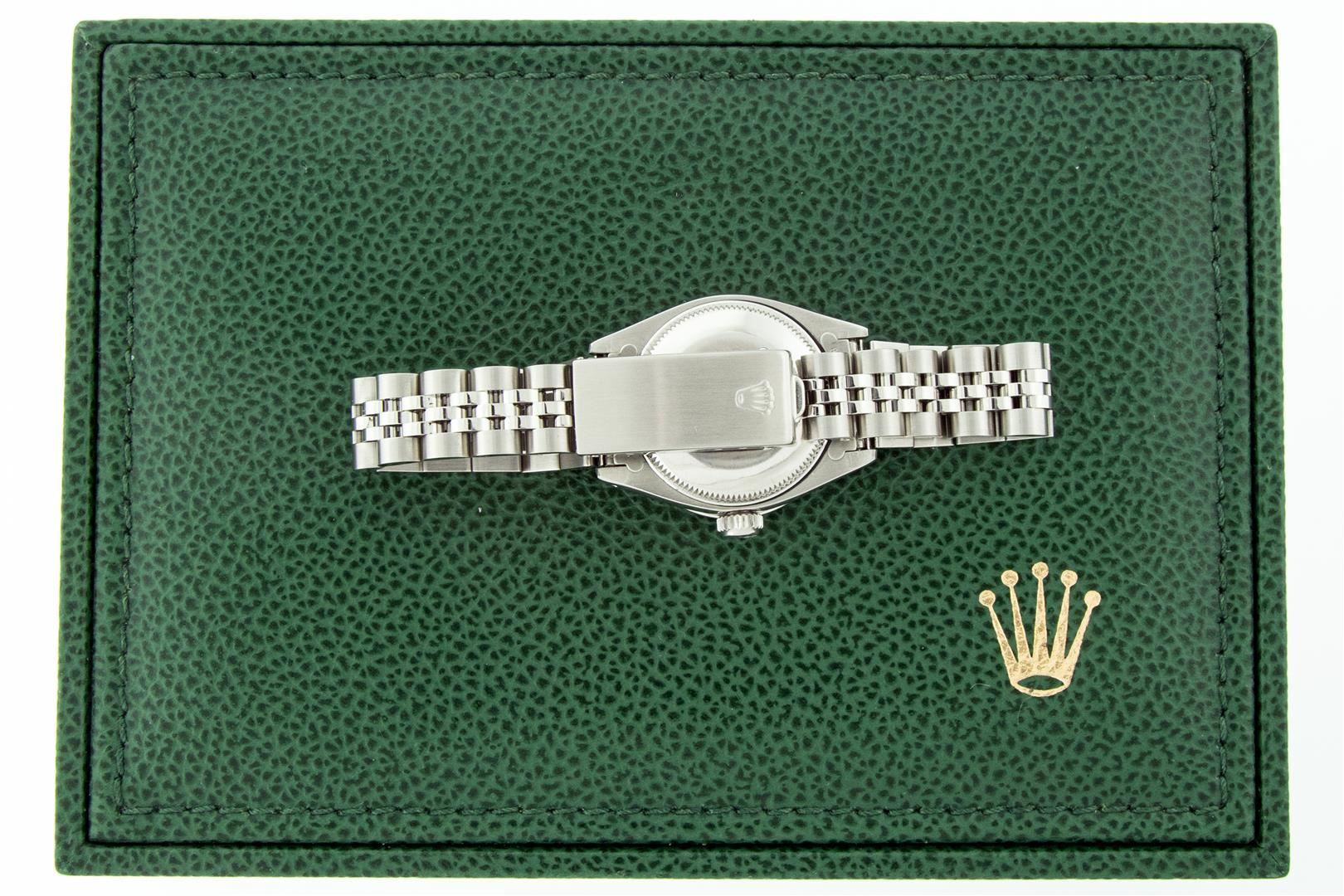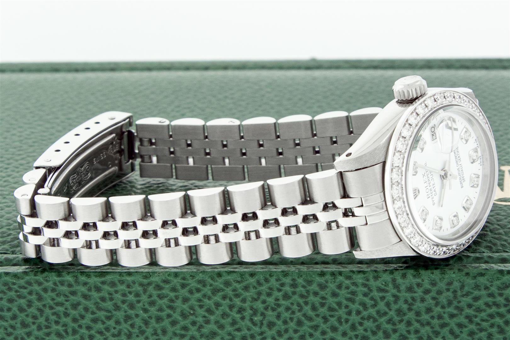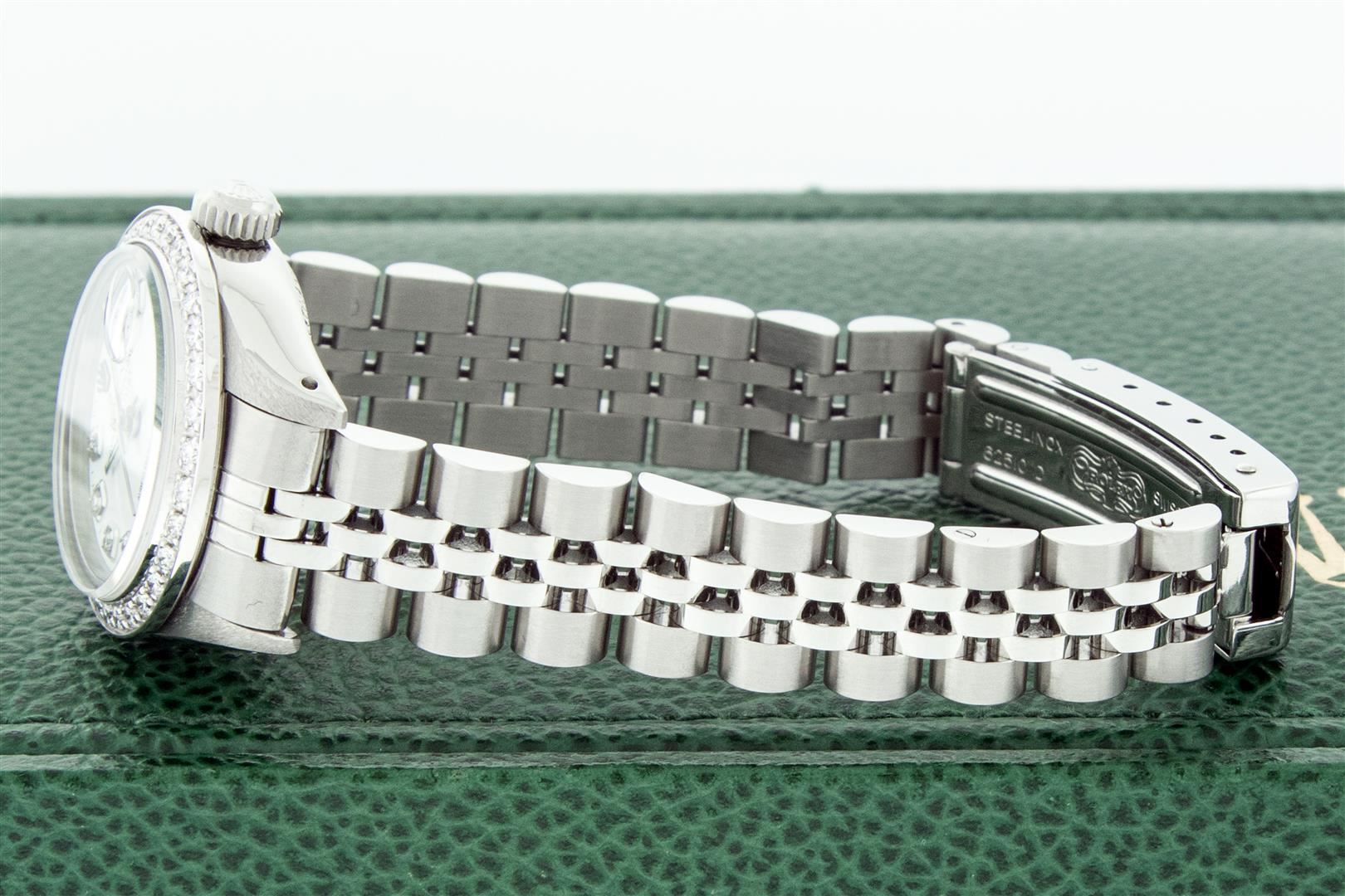 One Ladies Stainless Steel Rolex Datejust Polished Bright with Satin Finish, Serviced & Electronically Tested, Stainless Steel Case: 26mm, Stainless Steel Crown, Custom Bezel: New 18K White Gold Beadset Diamond Bezel, Diamond Count: 32 Diamonds, Total Weight .70 Carat, Clarity: SI-VS, Color: G to H. Custom Crystal: New Synthetic Sapphire Cyclops Lens. Custom Hands: New Luminescent Hands. Movement: Automatic Winding Movement. Custom Dial: White Diamond Dial, Diamond Count: 10 Diamonds In Dial, Color: G To H, Clarity: SI-VS. Date Window: 3 O'Clock Position Date Display, Model: Datejust. Condition: G-6 Extra Fine. Bracelet: Stainless Steel Jubilee. Bright Polish & Satin Finish. 6.0 Inch Length, Adjustable. Standard Clasp, With Rolex Logo. This Watch Has Been Serviced Time Tested And Is In Excellent Condition It Is Free Of All Scratches And Dents. This Watch Comes With A Rolex Box.