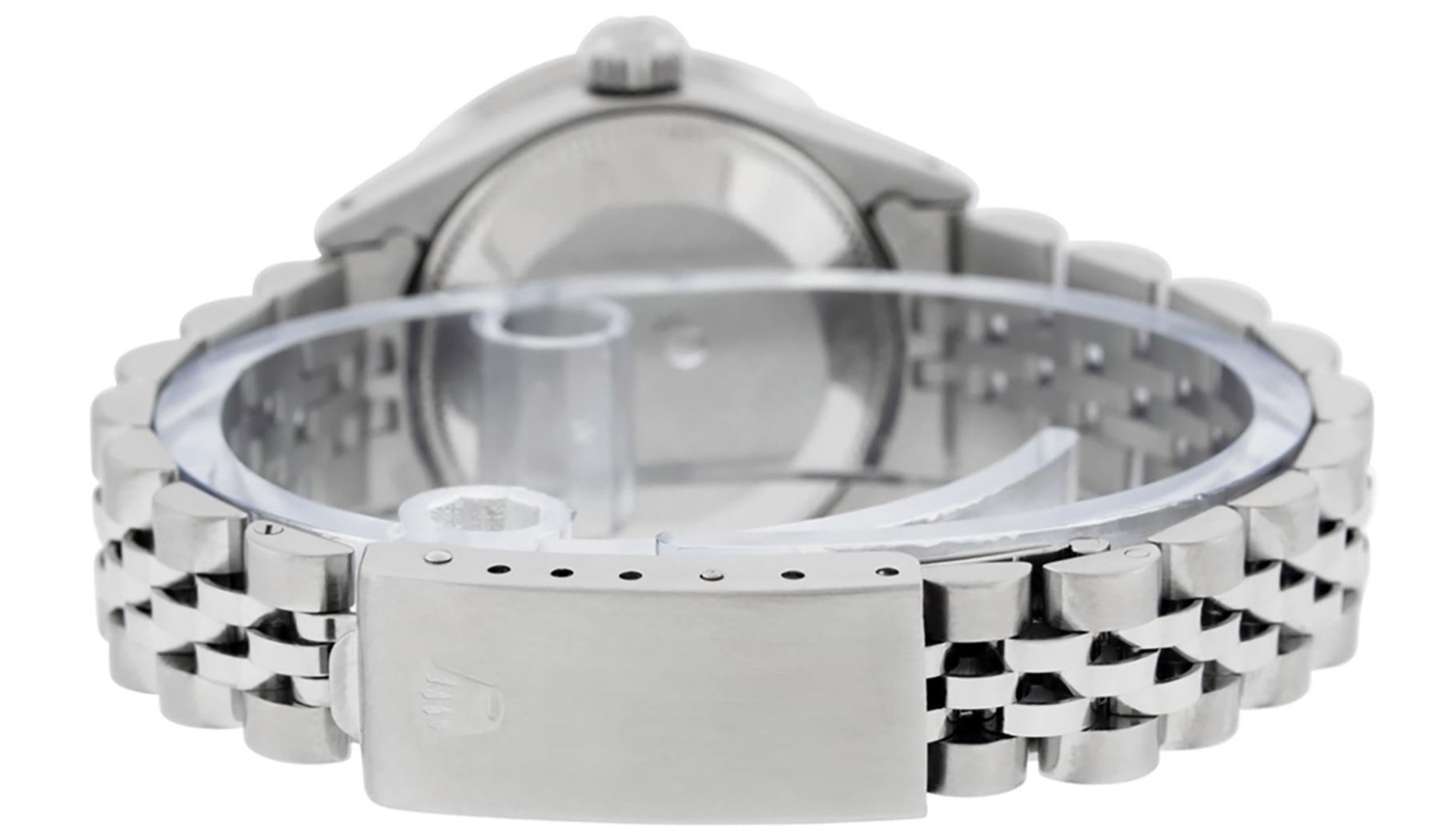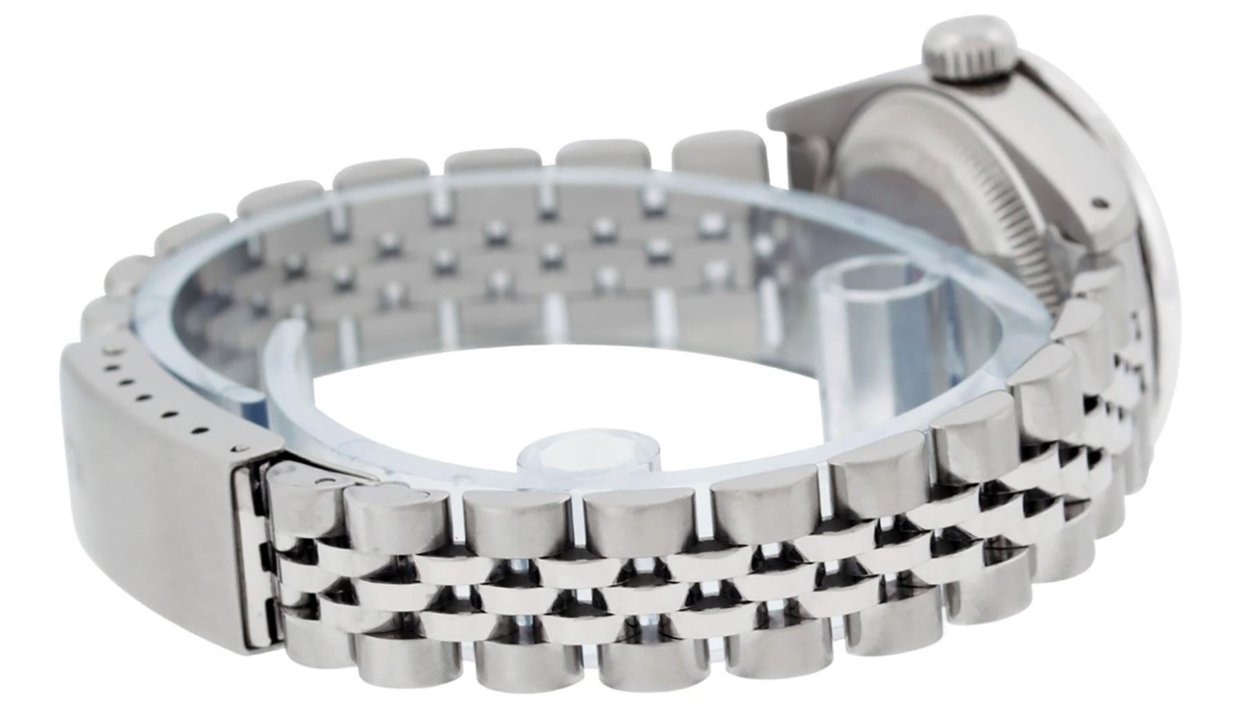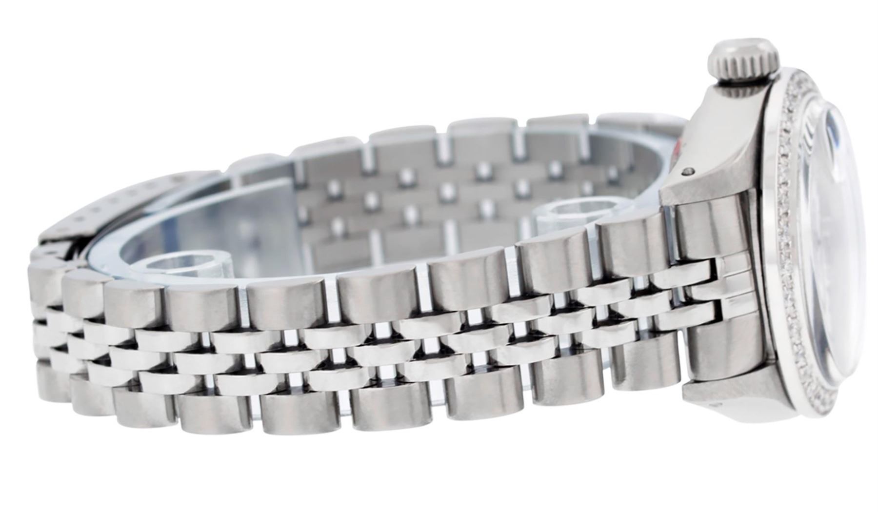 One Ladies Stainless Steel Rolex Datejust Polished Bright with Satin Finish, Serviced & Electronically Tested, Stainless Steel Case: 26mm, Stainless Steel Crown, Custom Bezel: New 18K White Gold Beadset Diamond Bezel, Diamond Count: 32 Diamonds, Total Weight .70 Carat, Clarity: SI-VS, Color: G to H. Custom Crystal: New Synthetic Sapphire Cyclops Lens. Custom Hands: New Luminescent Hands. Movement: Automatic Winding Movement. Custom Dial: White Diamond Dial, Diamond Count: 10 Diamonds In Dial, Color: G To H, Clarity: SI-VS. Date Window: 3 O'Clock Position Date Display, Model: Datejust. Condition: G-6 Extra Fine. Bracelet: Stainless Steel Jubilee. Bright Polish & Satin Finish. 6.0 Inch Length, Adjustable. Standard Clasp, With Rolex Logo. This Watch Has Been Serviced Time Tested And Is In Excellent Condition It Is Free Of All Scratches And Dents.