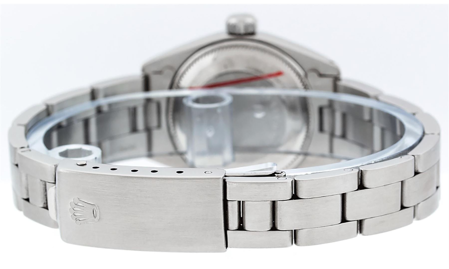 One Ladies Stainless Steel Rolex Wristwatch Polished Bright with Satin Finish, Serviced & Electronically Tested, Stainless Steel Case: 26mm, Stainless Steel Crown, Bezel: White Gold Bezel. Custom Crystal: New Sapphire With Magnified Date Window. Custom Hands: New Luminescent Hands. Rolex Movement: Automatic Winding Movement. Custom Dial: Custom White Dial With Added Diamond Hour Markers, Diamond Count: 10 Diamonds In Dial. Date Window: 3 O'Clock Position Date Display. Condition: G-6 Extra Fine. Rolex Bracelet: Stainless Steel Oyster Band. Bright Polish & Satin Finish. 6.0 Inch Length, Adjustable. Standard Clasp, With Rolex Logo. This Watch Has Been Serviced Time Tested And Is In Excellent Condition It Is Free Of All Scratches And Dents.