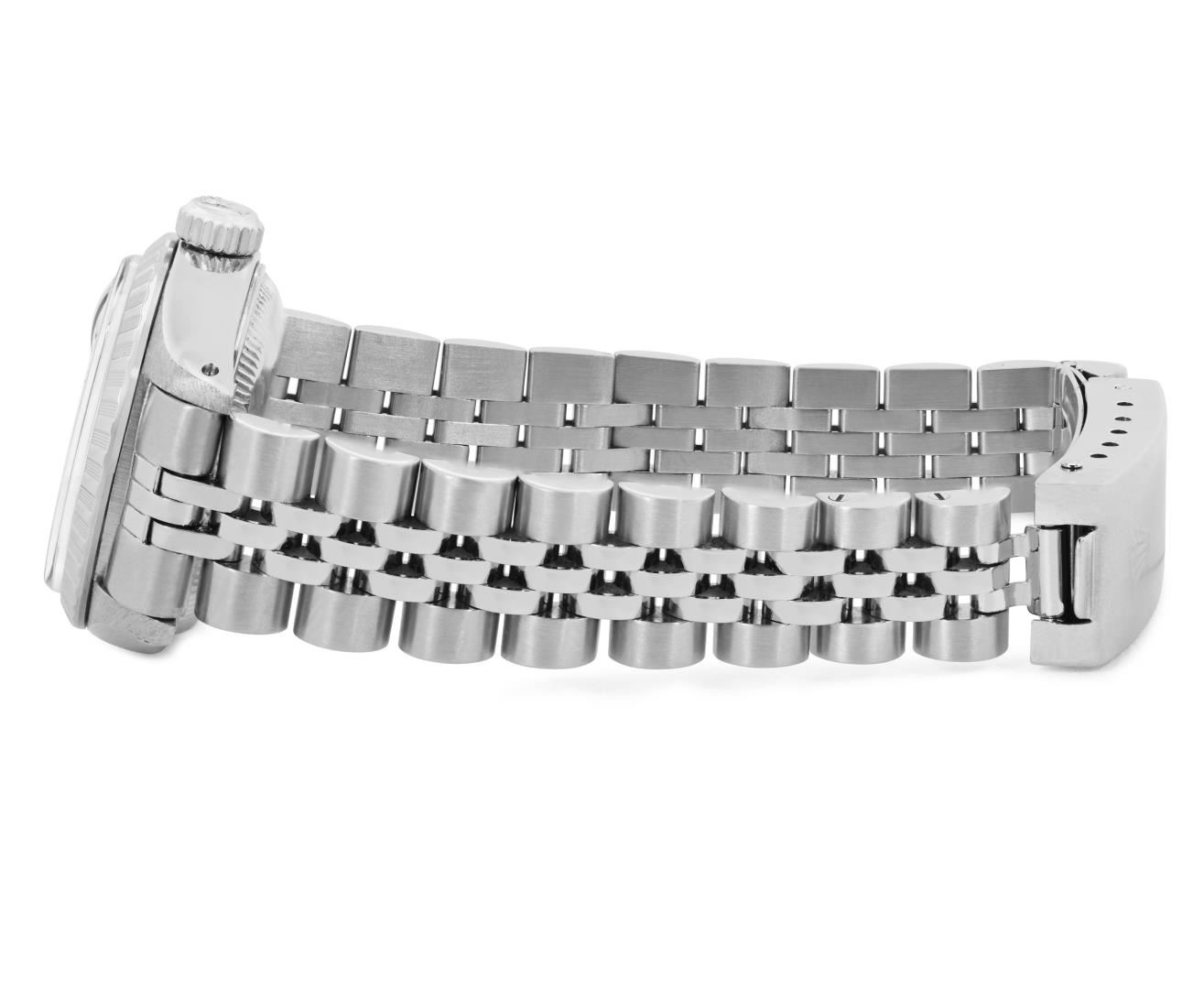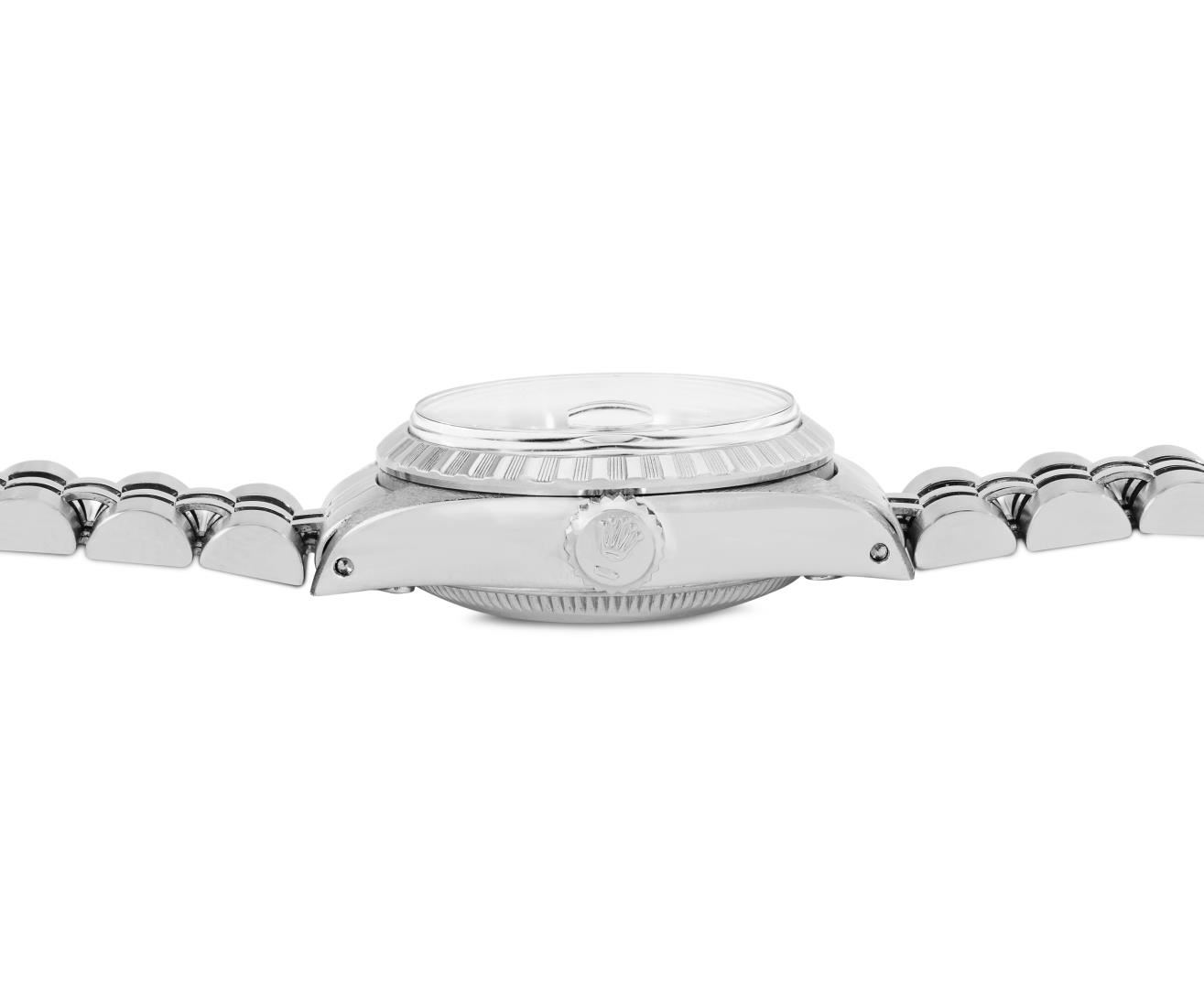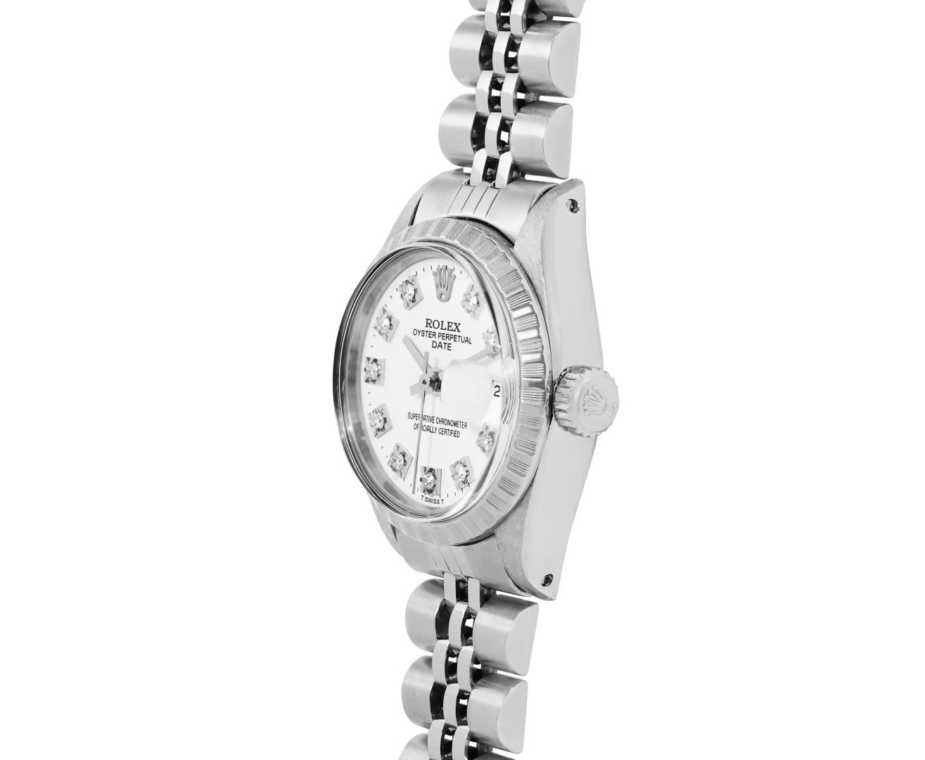 One Rolex Ladies Pre Owned Stainless Steel Date Wristwatch Polished Bright with Satin Finish, Serviced and Electronically Tested, Stainless Steel Case: 26mm, Stainless Steel Crown, Rolex Bezel: Stainless Steel Engine Turn Bezel, Custom Crystal: New Acrylic With Magnifying Date Window. Custom Hands: New Solid Hands. Rolex Movement: Automatic Winding Movement 2035. Custom Dial: Custom White Dial With Added Diamond Hour Markers, Dash Tracks, And Lumi Dots, Diamond Count: 10 Diamonds On Dial. Date Window: 3 O'Clock Position Date Display, Model: Date. Condition: G-6 Extra Fine. Rolex Bracelet: Stainless Steel Jubilee Band. Bright Polish and Satin Finish. 6.0 Inch Length, Adjustable. Standard Clasp, With Rolex Logo. This Watch Has Been Serviced Time Tested And Is In Excellent Condition. It Is Free Of All Scratches And Dents.