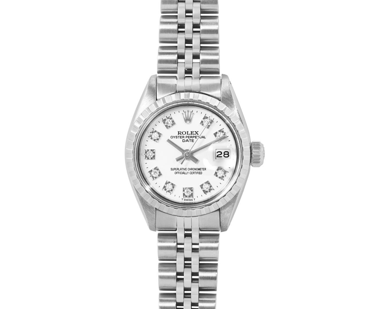 One Rolex Ladies Pre Owned Stainless Steel Date Wristwatch Polished Bright with Satin Finish, Serviced and Electronically Tested, Stainless Steel Case: 26mm, Stainless Steel Crown, Rolex Bezel: Stainless Steel Engine Turn Bezel, Custom Crystal: New Acrylic With Magnifying Date Window. Custom Hands: New Solid Hands. Rolex Movement: Automatic Winding Movement 2035. Custom Dial: Custom White Dial With Added Diamond Hour Markers, Dash Tracks, And Lumi Dots, Diamond Count: 10 Diamonds On Dial. Date Window: 3 O'Clock Position Date Display, Model: Date. Condition: G-6 Extra Fine. Rolex Bracelet: Stainless Steel Jubilee Band. Bright Polish and Satin Finish. 6.0 Inch Length, Adjustable. Standard Clasp, With Rolex Logo. This Watch Has Been Serviced Time Tested And Is In Excellent Condition. It Is Free Of All Scratches And Dents.