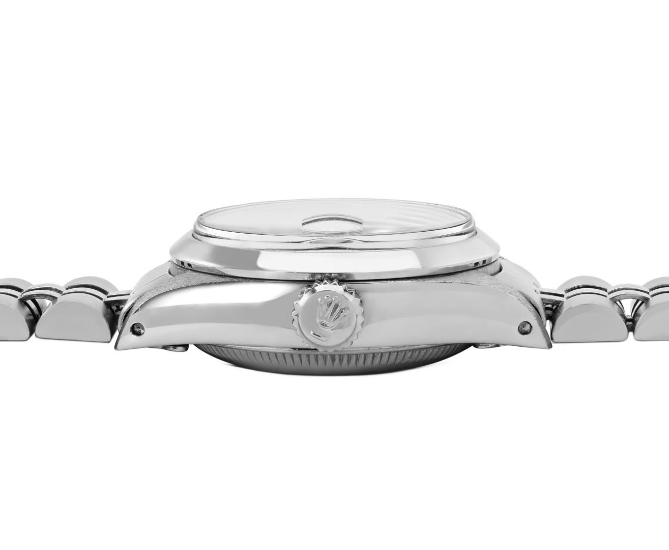 One Rolex Ladies Pre Owned Stainless Steel Date Wristwatch Polished Bright with Satin Finish, Serviced and Electronically Tested, Stainless Steel Case: 26mm, Stainless Steel Crown, Rolex Bezel: Stainless Steel Smooth Bezel, Custom Crystal: New Acrylic With Magnifying Date Window. Custom Hands: New Solid Hands. Rolex Movement: Automatic Winding Movement 2035. Custom Dial: Custom White Dial With Added Diamond Hour Markers, Dash Tracks, And Lumi Dots, Diamond Count: 10 Diamonds On Dial. Date Window: 3 O'Clock Position Date Display, Model: Date. Condition: G-6 Extra Fine. Rolex Bracelet: Stainless Steel Jubilee Band. Bright Polish and Satin Finish. 6.0 Inch Length, Adjustable. Standard Clasp, With Rolex Logo. This Watch Has Been Serviced Time Tested And Is In Excellent Condition. It Is Free Of All Scratches And Dents.