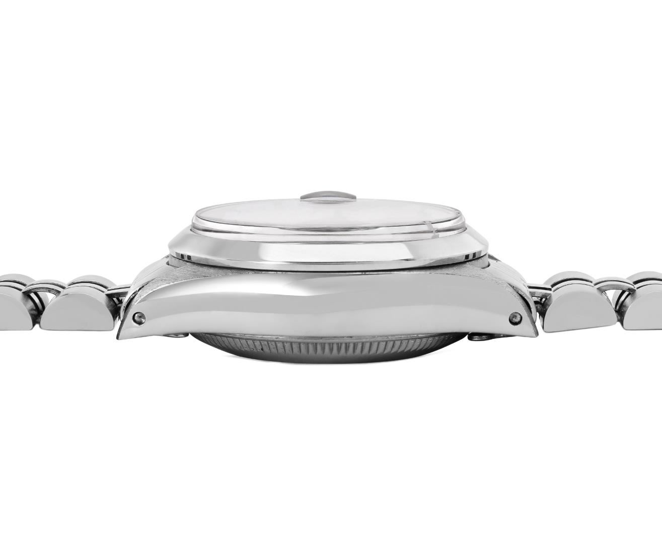 One Rolex Ladies Pre Owned Stainless Steel Date Wristwatch Polished Bright with Satin Finish, Serviced and Electronically Tested, Stainless Steel Case: 26mm, Stainless Steel Crown, Rolex Bezel: Stainless Steel Smooth Bezel, Custom Crystal: New Acrylic With Magnifying Date Window. Custom Hands: New Solid Hands. Rolex Movement: Automatic Winding Movement 2035. Custom Dial: Custom White Dial With Added Diamond Hour Markers, Dash Tracks, And Lumi Dots, Diamond Count: 10 Diamonds On Dial. Date Window: 3 O'Clock Position Date Display, Model: Date. Condition: G-6 Extra Fine. Rolex Bracelet: Stainless Steel Jubilee Band. Bright Polish and Satin Finish. 6.0 Inch Length, Adjustable. Standard Clasp, With Rolex Logo. This Watch Has Been Serviced Time Tested And Is In Excellent Condition. It Is Free Of All Scratches And Dents.