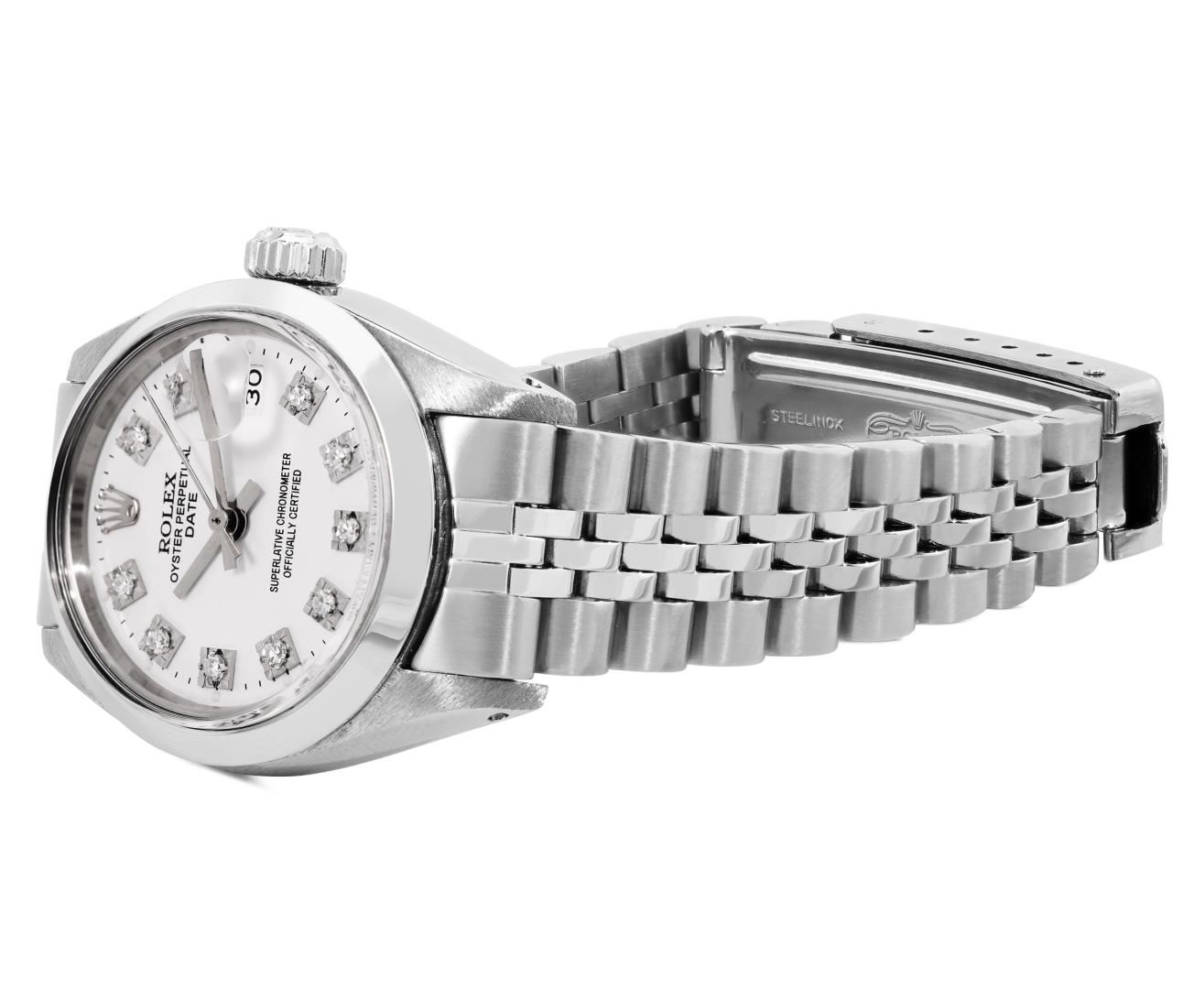 One Rolex Ladies Pre Owned Stainless Steel Date Wristwatch Polished Bright with Satin Finish, Serviced and Electronically Tested, Stainless Steel Case: 26mm, Stainless Steel Crown, Rolex Bezel: Stainless Steel Smooth Bezel, Custom Crystal: New Acrylic With Magnifying Date Window. Custom Hands: New Solid Hands. Rolex Movement: Automatic Winding Movement 2035. Custom Dial: Custom White Dial With Added Diamond Hour Markers, Dash Tracks, And Lumi Dots, Diamond Count: 10 Diamonds On Dial. Date Window: 3 O'Clock Position Date Display, Model: Date. Condition: G-6 Extra Fine. Rolex Bracelet: Stainless Steel Jubilee Band. Bright Polish and Satin Finish. 6.0 Inch Length, Adjustable. Standard Clasp, With Rolex Logo. This Watch Has Been Serviced Time Tested And Is In Excellent Condition. It Is Free Of All Scratches And Dents.