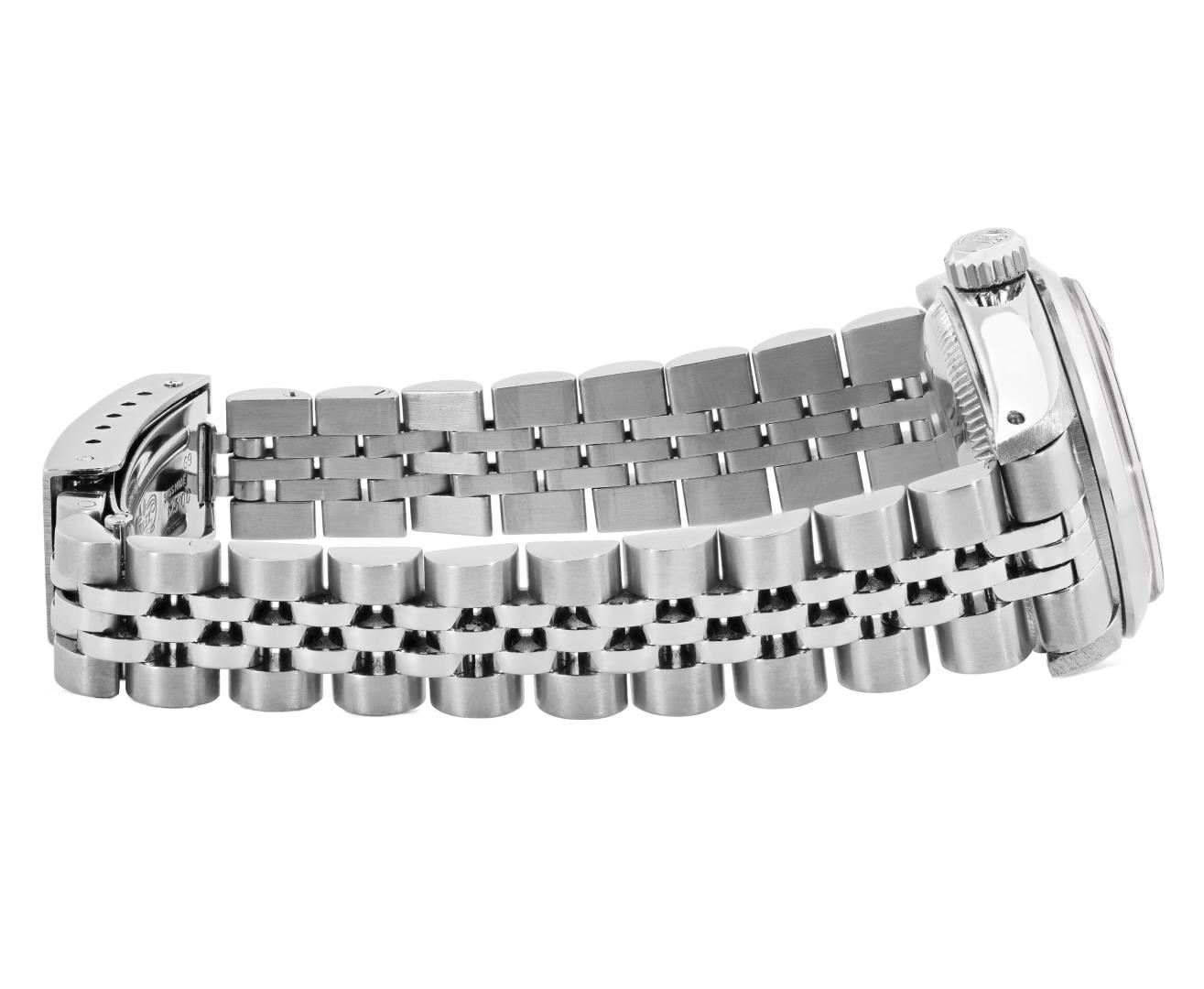 One Rolex Ladies Pre Owned Stainless Steel Date Wristwatch Polished Bright with Satin Finish, Serviced and Electronically Tested, Stainless Steel Case: 26mm, Stainless Steel Crown, Rolex Bezel: Stainless Steel Smooth Bezel, Custom Crystal: New Acrylic With Magnifying Date Window. Custom Hands: New Solid Hands. Rolex Movement: Automatic Winding Movement 2035. Custom Dial: Custom White Dial With Added Diamond Hour Markers, Dash Tracks, And Lumi Dots, Diamond Count: 10 Diamonds On Dial. Date Window: 3 O'Clock Position Date Display, Model: Date. Condition: G-6 Extra Fine. Rolex Bracelet: Stainless Steel Jubilee Band. Bright Polish and Satin Finish. 6.0 Inch Length, Adjustable. Standard Clasp, With Rolex Logo. This Watch Has Been Serviced Time Tested And Is In Excellent Condition. It Is Free Of All Scratches And Dents.
