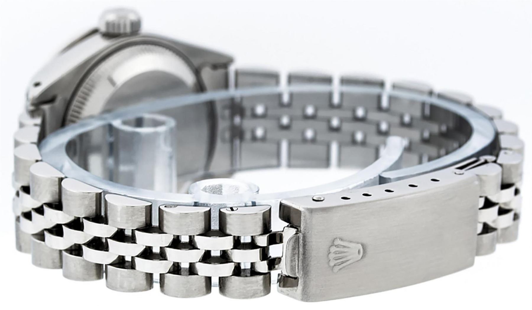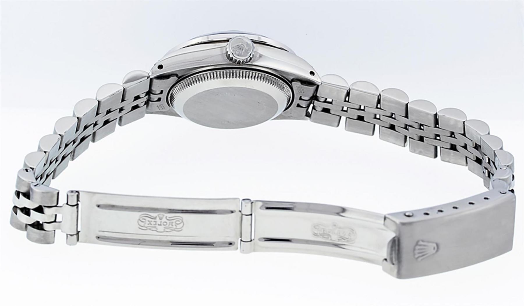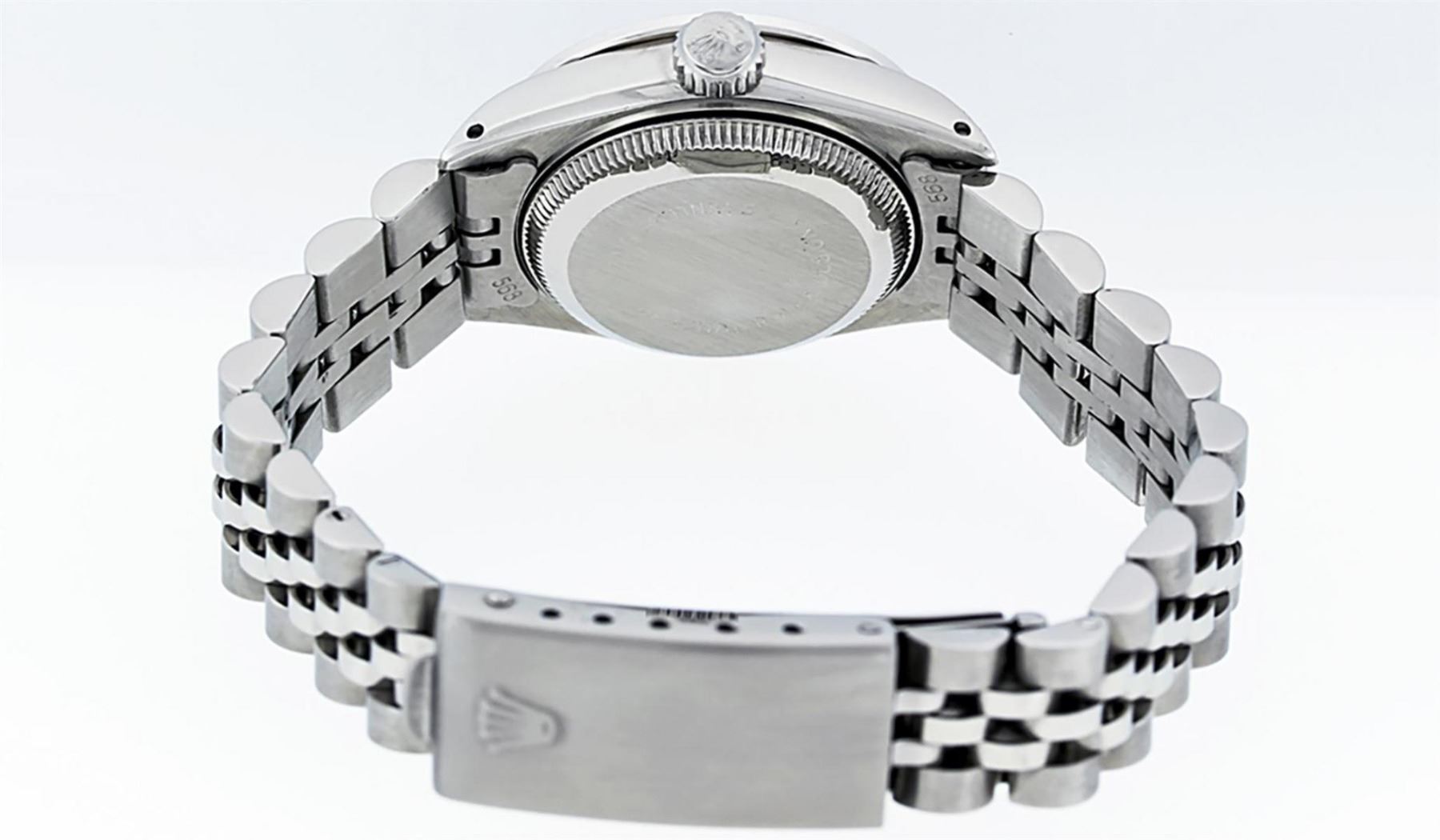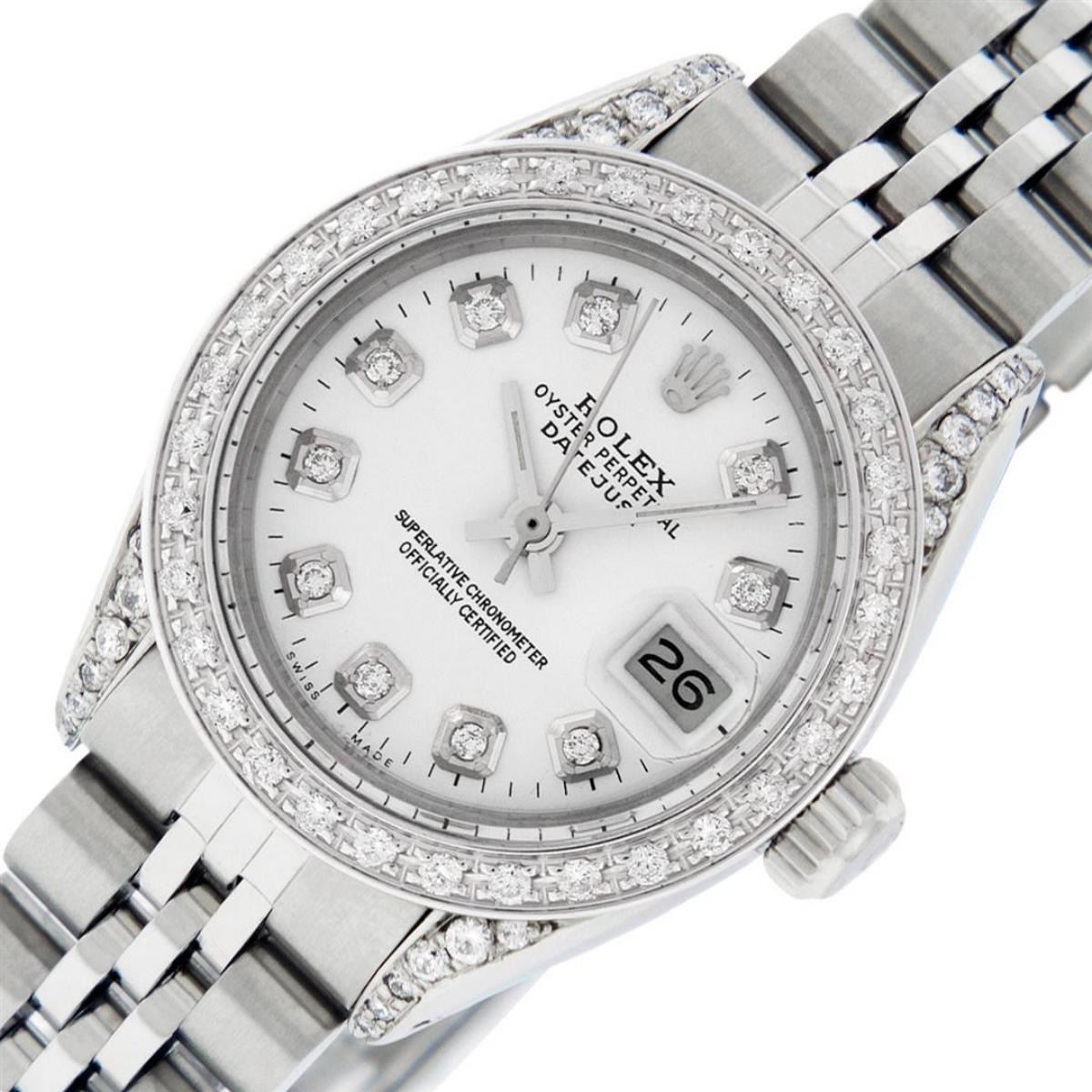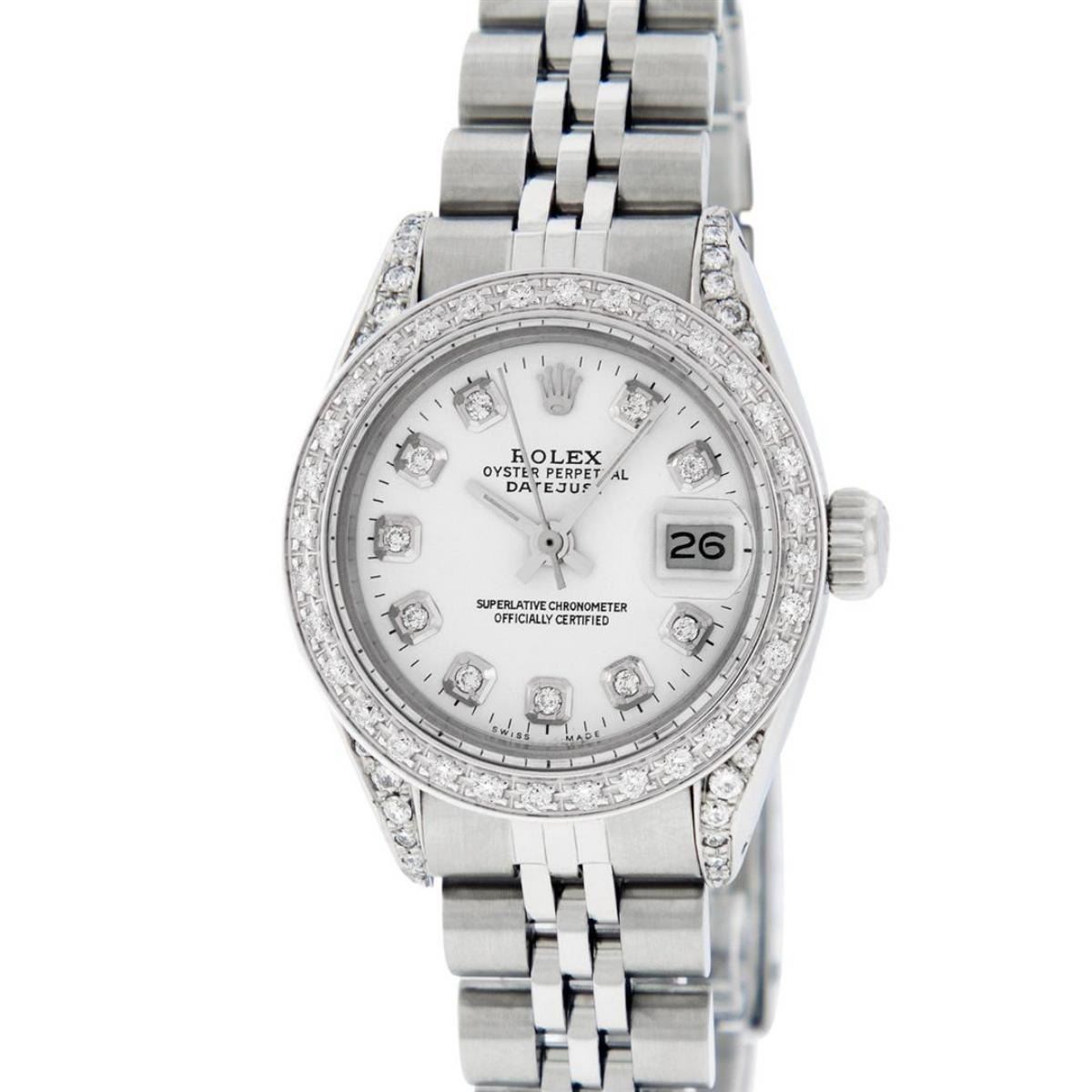 One Ladies Stainless Steel Rolex Datejust Polished Bright with Satin Finish, Serviced & Electronically Tested, Stainless Steel Case: 26mm, Stainless Steel Crown, Diamond Lugs: 24 Diamonds On Lugs, Clarity: SI-VS, Color: G to H. Custom Bezel: New 18K White Gold Diamond Beadset Bezel, Diamond Count: 32 Diamonds, Total Weight .70 Carat, Clarity: SI-VS, Color: G to H. Custom Crystal: New Scratch Resistant Synthetic Sapphire Cyclops Lens. Custom Hands: New Luminescent Hands. Movement: Automatic Winding Movement. Custom Dial: Refinished White Diamond Dial With Dash Track, 10 Diamonds in Dial, G To H In Color, Clarity: SI-VS. Date Window: 3 O'Clock Position Date Display, Model: Datejust Condition: G-6 Extra Fine. Bracelet: Stainless Steel Jubilee Band. Bright Polish & Satin Finish. 6.0 Inch Length, Adjustable. Standard Clasp, With Rolex Logo. This Watch Has Been Serviced Time Tested And Is In Excellent Condition It Is Free Of All Scratches And Dents.