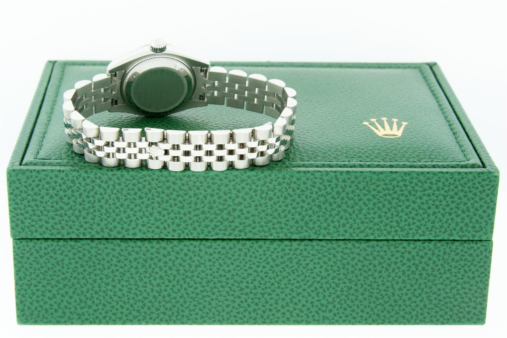 One Ladies Quickset Stainless Steel Rolex Datejust Polished Bright with Satin Finish, Serviced & Electronically Tested, Stainless Steel Case: 26mm, Stainless Steel Crown, Bezel: Stainless Steel Smooth Bezel. Custom Crystal: New Scratch Resistant Sapphire Cyclops Lens. Custom Hands: New Luminescent Hands. Movement: Automatic Winding Movement. Custom Dial: White Single Cut VS Diamond Dial, Diamond Count: 10 Single Cut Diamonds In Dial, Color: G to H, Clarity: VS. Date Window: 3 O'Clock Position Date Display, Model: 179160 Quickset Datejust. Condition: G-6 Extra Fine. Bracelet: Stainless Steel Jubilee Band. Bright Polish & Satin Finish. 6.0 Inch Length, Adjustable. Standard Clasp, With Rolex Logo. This Watch Has Been Serviced Time Tested And Is In Excellent Condition It Is Free Of All Scratches And Dents. This Watch Comes With A Rolex Box.