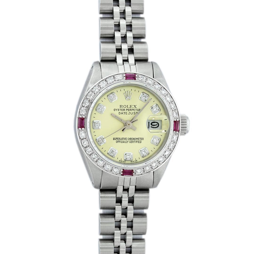 One Ladies Stainless Steel Rolex Datejust Polished Bright with Satin Finish, Serviced & Electronically Tested, Stainless Steel Case: 26mm, Stainless Steel Crown, Custom Bezel: New 18K White Gold Ruby Beadset Diamond Bezel, Diamond + Gem Count: 28 Diamonds + 4 Rubies. Total Weight .70 Carat, Clarity: SI-VS, Color: G to H. Custom Crystal: New Scratch Resistant Synthetic Sapphire Cyclops Lens. Custom Hands: New Luminescent Hands. Movement: Automatic Winding Movement. Custom Dial: Refinished Yellow With Diamond Hour Markers & Dash Tracks, 10 Diamonds in Dial, G To H In Color, Clarity: SI-VS. Date Window: 3 O'Clock Position Date Display, Model: Datejust. Condition: G-6 Extra Fine. Bracelet: Stainless Steel Jubilee Band. Bright Polish & Satin Finish. 6.0 Inch Length, Adjustable. Standard Clasp, With Rolex Logo. This Watch Has Been Serviced Time Tested And Is In Excellent Condition It Is Free Of All Scratches And Dents.