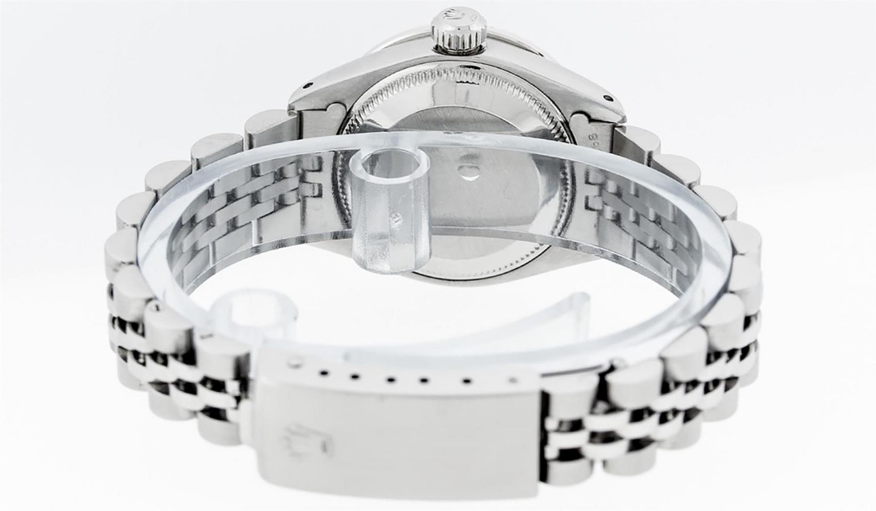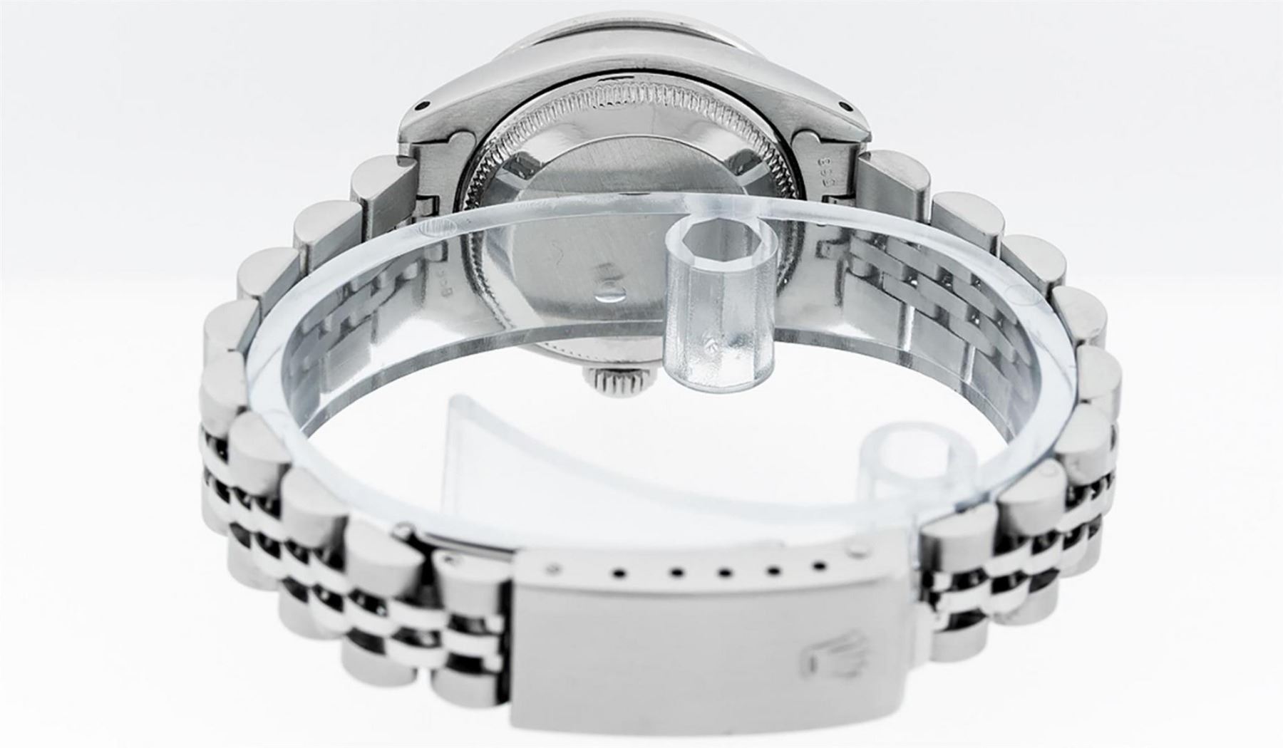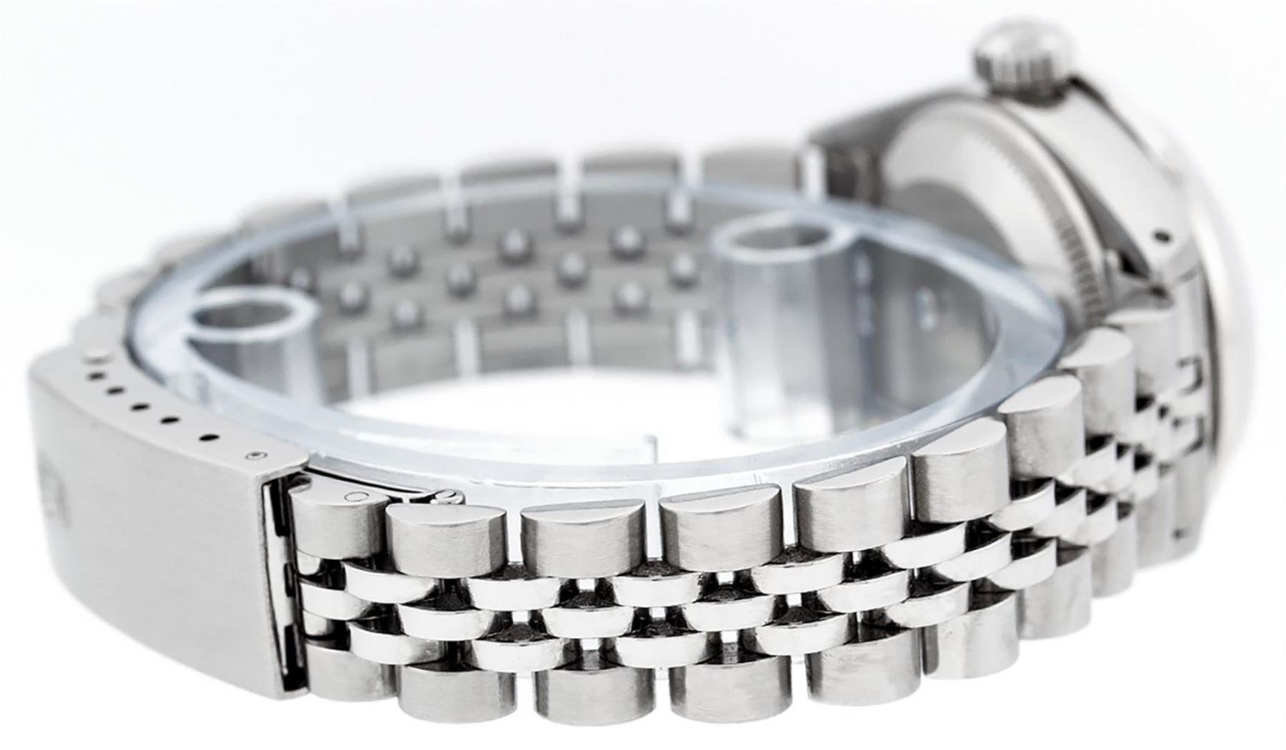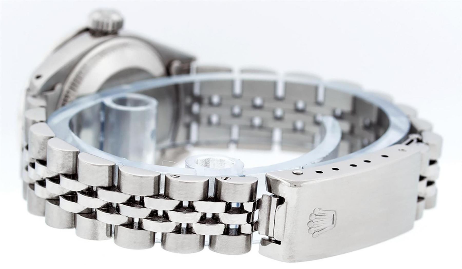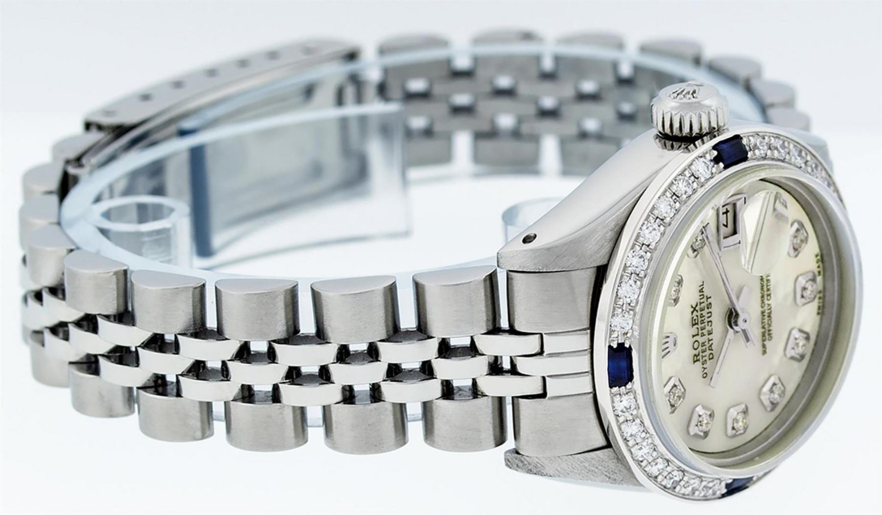 One Ladies Stainless Steel Rolex Datejust Polished Bright with Satin Finish, Serviced & Electronically Tested, Stainless Steel Case: 26mm, Stainless Steel Crown, Custom Bezel: New 18K White Gold Sapphire Beadset Diamond Bezel, Diamond + Gem Count: 28 Diamonds + 4 Sapphires. Total Weight .70 Carat, Clarity: SI-VS, Color: G to H. Custom Crystal: New Scratch Resistant Synthetic Sapphire Cyclops Lens. Custom Hands: New Luminescent Hands. Movement: Automatic Winding Movement. Custom Dial: Refinished Yellow Mother Of Pearl With Diamond Hour Markers, 10 Diamonds in Dial, G To H In Color, Clarity: SI-VS. Date Window: 3 O'Clock Position Date Display, Model: Datejust. Condition: G-6 Extra Fine. Bracelet: Stainless Steel Jubilee Band. Bright Polish & Satin Finish. 6.0 Inch Length, Adjustable. Standard Clasp, With Rolex Logo. This Watch Has Been Serviced Time Tested And Is In Excellent Condition It Is Free Of All Scratches And Dents.