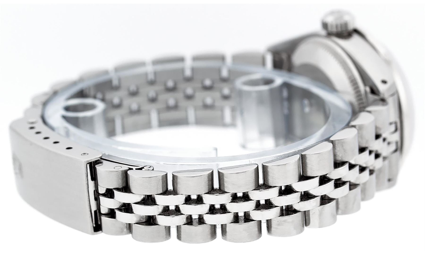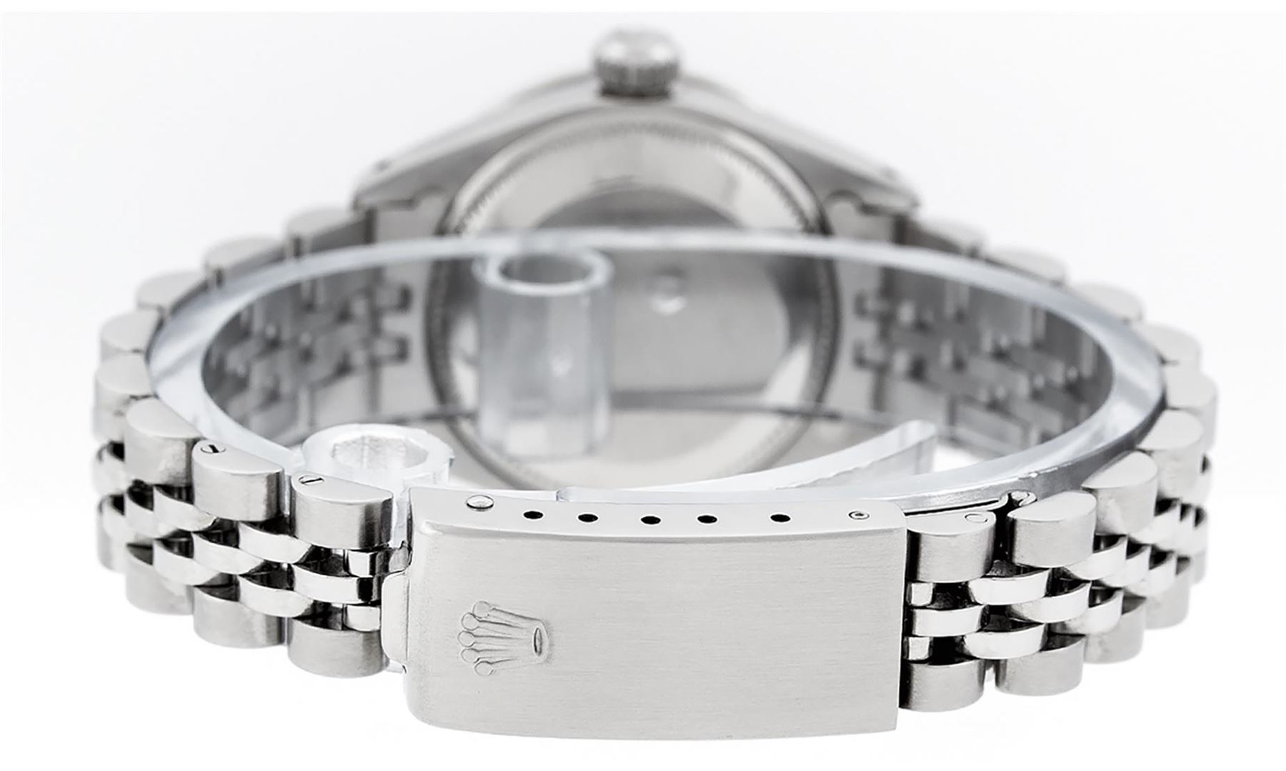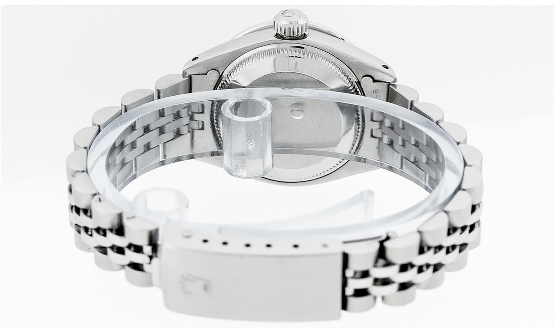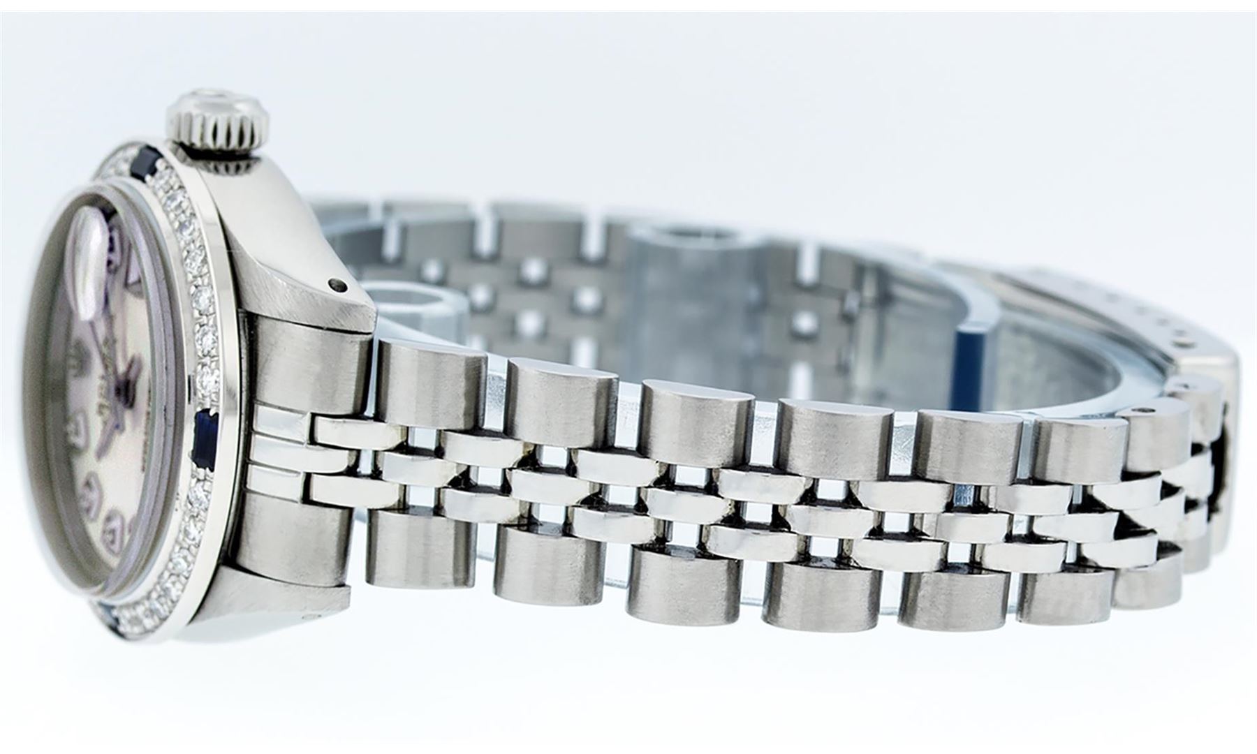 One Ladies Stainless Steel Rolex Datejust Polished Bright with Satin Finish, Serviced & Electronically Tested, Stainless Steel Case: 26mm, Stainless Steel Crown, Custom Bezel: New 18K White Gold Sapphire Beadset Diamond Bezel, Diamond + Gem Count: 28 Diamonds + 4 Sapphires. Total Weight .70 Carat, Clarity: SI-VS, Color: G to H. Custom Crystal: New Scratch Resistant Synthetic Sapphire Cyclops Lens. Custom Hands: New Luminescent Hands. Movement: Automatic Winding Movement. Custom Dial: Refinished Yellow Mother Of Pearl With Diamond Hour Markers, 10 Diamonds in Dial, G To H In Color, Clarity: SI-VS. Date Window: 3 O'Clock Position Date Display, Model: Datejust. Condition: G-6 Extra Fine. Bracelet: Stainless Steel Jubilee Band. Bright Polish & Satin Finish. 6.0 Inch Length, Adjustable. Standard Clasp, With Rolex Logo. This Watch Has Been Serviced Time Tested And Is In Excellent Condition It Is Free Of All Scratches And Dents.