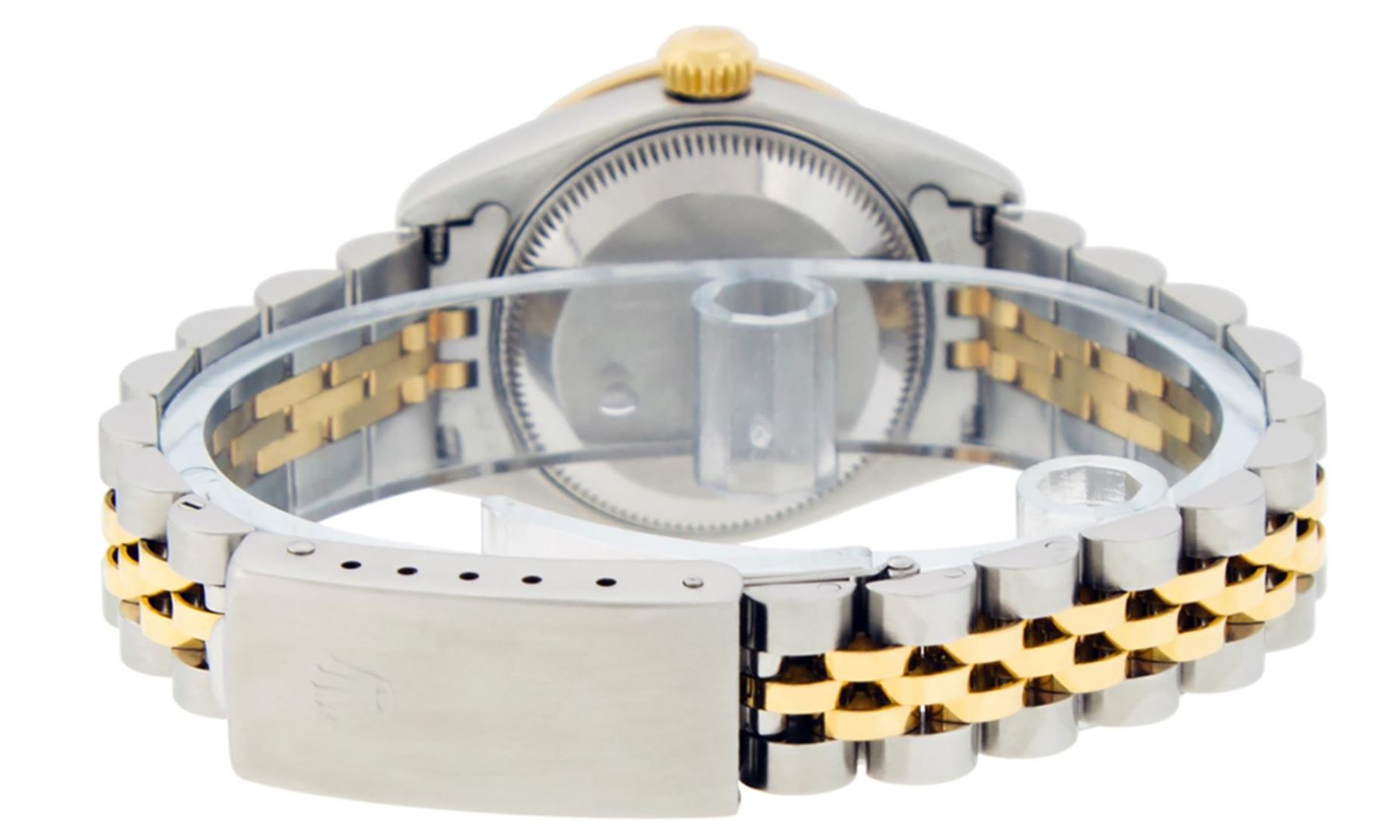 One Ladies Pre Owned 18K Two Tone Yellow Gold And Stainless Steel Rolex Datejust Polished, Serviced And Electronically Tested, 18K Yellow Gold And Stainless Steel Case: 26mm, 18K Yellow Gold Crown, Custom Bezel: New 18K Yellow Gold Emerald Beadset Diamond Bezel, Diamond + Gem Count: 28 Diamonds + 4 Emeralds. Custom Crystal: New Sapphire With Date Window. Custom Hands: New Luminescent Hands. Rolex Movement: Quickset Automatic Winding Movement 2235. Custom Dial: Custom Champagne Dial With Added Diamonds, Diamond Count: 10 On Dial. Date Window: 3 O'Clock Position Date Display, Model: Datejust, Condition: G-6 Extra Fine. Rolex Bracelet: Two Tone 18K Yellow Gold And Stainless Steel Jubilee Band. Bright Polish. 6.0 Inch Length, Adjustable. Standard Clasp, With Rolex Logo. This Watch Has Been Serviced Time Tested And Is In Excellent Condition It Is Free Of All Scratches And Dents.