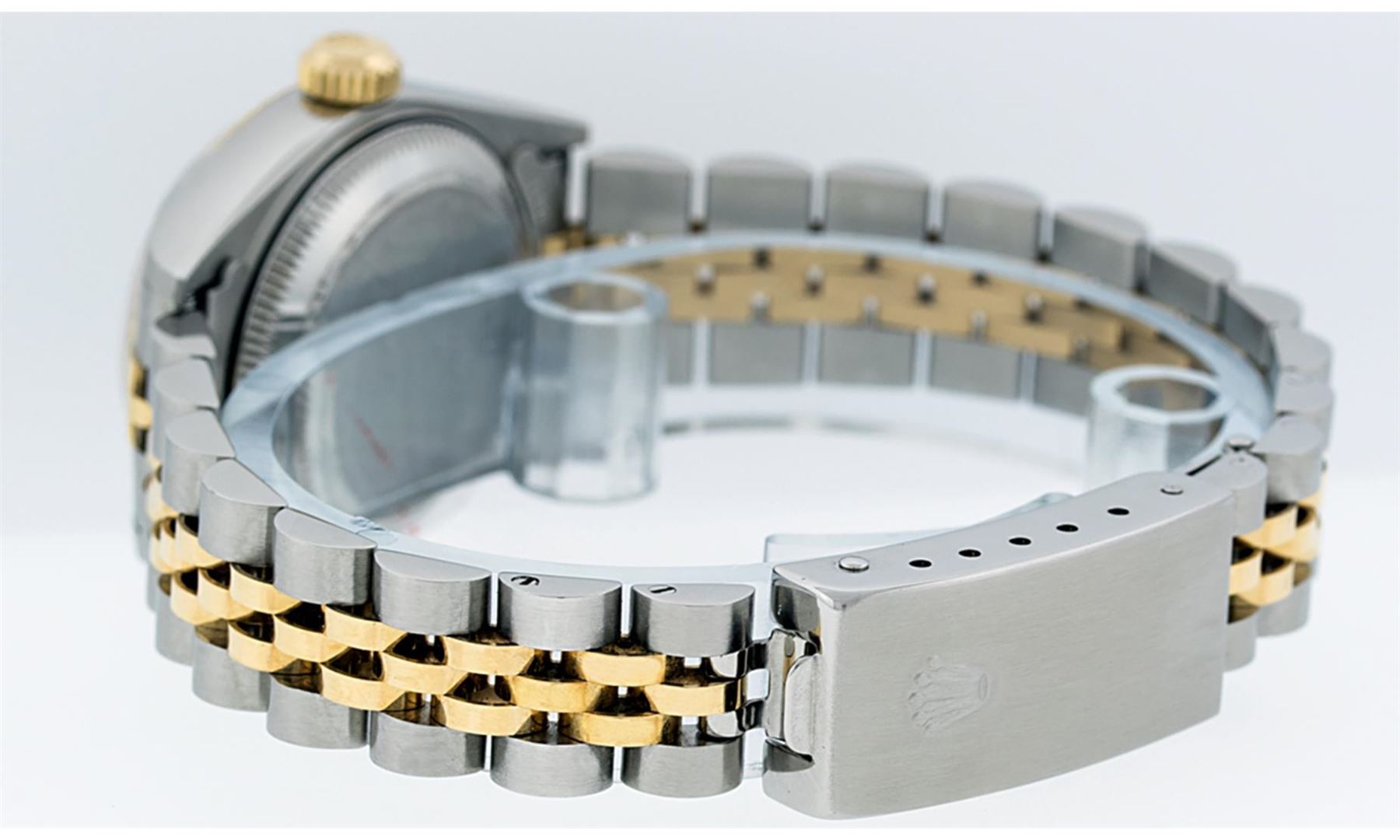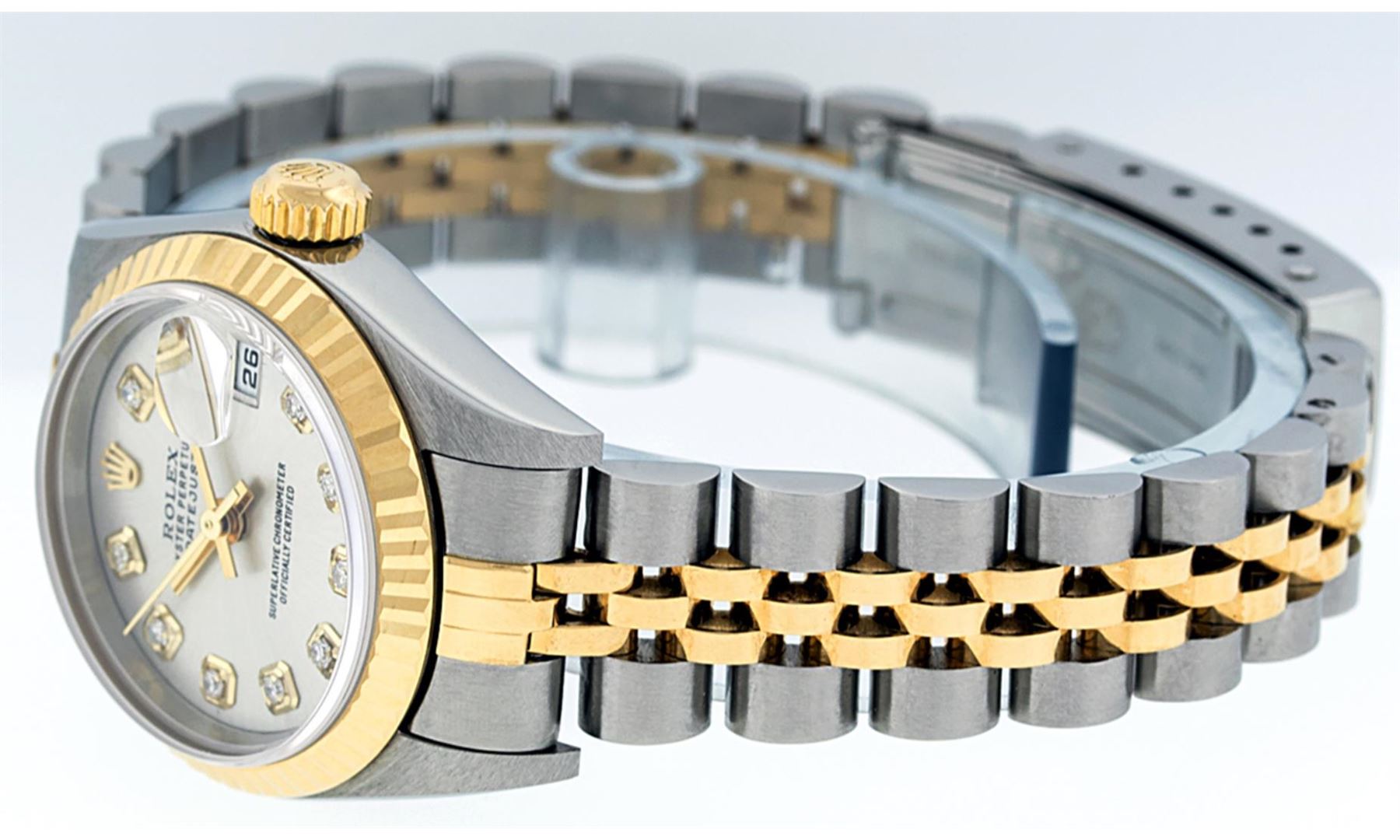 One Ladies Pre Owned 18K Yellow Gold And Stainless Steel Rolex Datejust Polished, Serviced And Electronically Tested, 18K Yellow Gold And Stainless Steel, Case Size: 26mm, 18K Yellow Gold Crown, Rolex Bezel: 18K Yellow Gold Fluted Bezel. Custom Crystal: New Sapphire With Magnified Date Window. Custom Hands: New Luminescent Hands. Rolex Movement: Quickset Automatic Winding Movement 2235. Custom Dial: Custom Silver Dial With Added Diamonds, Diamond Count: 10 Diamonds On Dial. Date Window: 3 O'Clock Position Date Display, Model: Datejust. Condition: G-6 Extra Fine. Rolex Bracelet: Two Tone 18K Yellow Gold And Stainless Steel Jubilee Band. Bright Polish. 6.0 Inch Length, Adjustable. Standard Clasp, With Rolex Logo. This Watch Has Been Serviced Time Tested And Is In Excellent Condition It Is Free Of All Scratches And Dents.