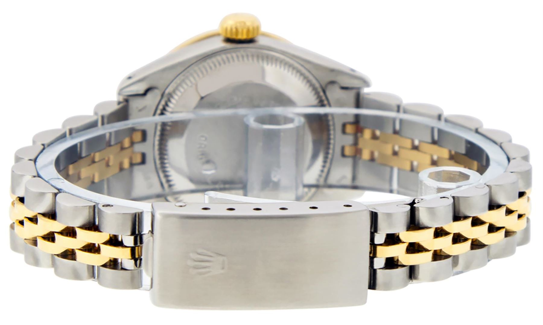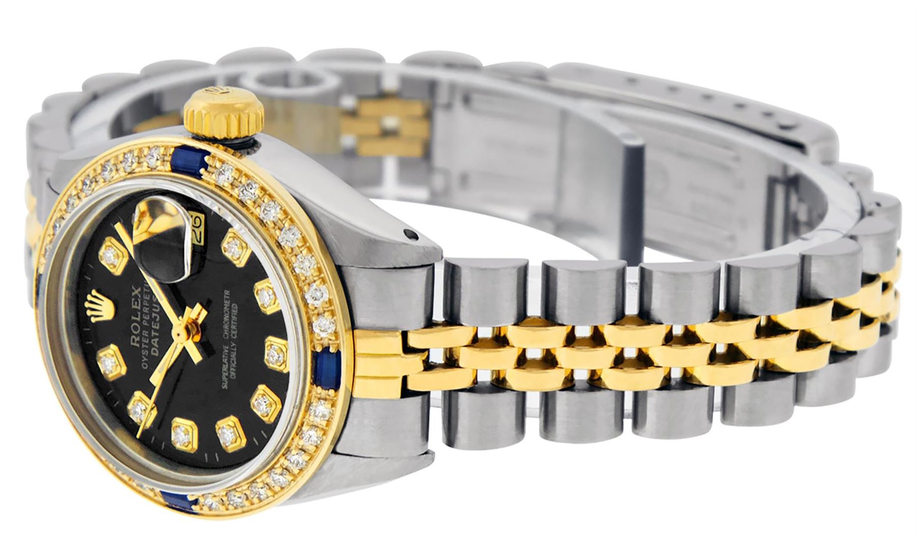 One Ladies Pre Owned Rolex Quickset Two Tone 18K Yellow Gold And Stainless Steel Datejust Polished, Serviced & Electronically Tested, Yellow Gold And Stainless Steel Case: 26mm, Yellow Gold Crown, Custom Bezel: New 18K Yellow Gold Sapphire Beadset Diamond Bezel, Diamond + Gem Count: 28 Diamonds + 4 Sapphires. Custom Crystal: New Sapphire With Date Window. Custom Hands: New Luminescent Hands. Rolex Movement: Automatic Winding Movement 2135. Custom Dial: Custom Black Dial With Added Diamonds, Diamond Count: 10 Diamond in Dial. Date Window: 3 O'Clock Position Date Display, Model: Quickset Datejust, Condition: G-6 Extra Fine. Rolex Bracelet: Two Tone 18K Yellow Gold & Stainless Steel Jubilee Band. Bright Polish. 6.0 Inch Length, Adjustable. Standard Clasp, With Rolex Logo. This Watch Has Been Serviced Time Tested And Is In Excellent Condition It Is Free Of All Scratches And Dents.