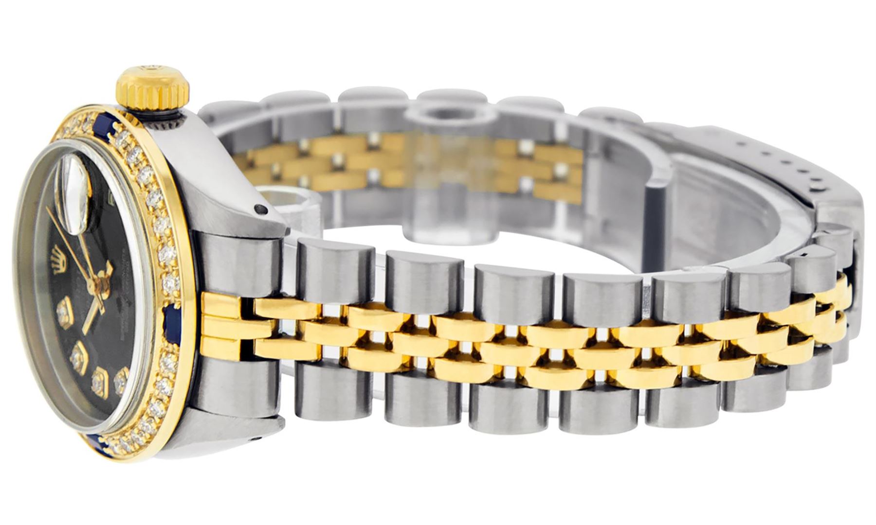 One Ladies Pre Owned Rolex Quickset Two Tone 18K Yellow Gold And Stainless Steel Datejust Polished, Serviced & Electronically Tested, Yellow Gold And Stainless Steel Case: 26mm, Yellow Gold Crown, Custom Bezel: New 18K Yellow Gold Sapphire Beadset Diamond Bezel, Diamond + Gem Count: 28 Diamonds + 4 Sapphires. Custom Crystal: New Sapphire With Date Window. Custom Hands: New Luminescent Hands. Rolex Movement: Automatic Winding Movement 2135. Custom Dial: Custom Black Dial With Added Diamonds, Diamond Count: 10 Diamond in Dial. Date Window: 3 O'Clock Position Date Display, Model: Quickset Datejust, Condition: G-6 Extra Fine. Rolex Bracelet: Two Tone 18K Yellow Gold & Stainless Steel Jubilee Band. Bright Polish. 6.0 Inch Length, Adjustable. Standard Clasp, With Rolex Logo. This Watch Has Been Serviced Time Tested And Is In Excellent Condition It Is Free Of All Scratches And Dents.