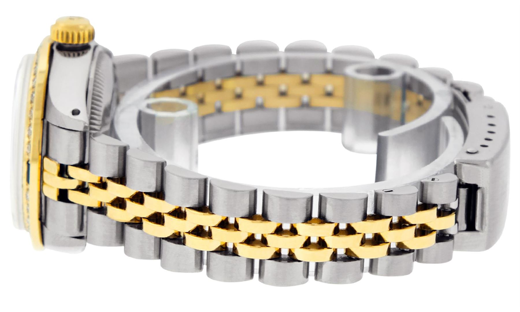 One Ladies Pre Owned Rolex Quickset Two Tone 18K Yellow Gold And Stainless Steel Datejust Polished, Serviced & Electronically Tested, Yellow Gold And Stainless Steel Case: 26mm, Yellow Gold Crown, Custom Bezel: New 18K Yellow Gold Sapphire Beadset Diamond Bezel, Diamond + Gem Count: 28 Diamonds + 4 Sapphires. Custom Crystal: New Sapphire With Date Window. Custom Hands: New Luminescent Hands. Rolex Movement: Automatic Winding Movement 2135. Custom Dial: Custom Black Dial With Added Diamonds, Diamond Count: 10 Diamond in Dial. Date Window: 3 O'Clock Position Date Display, Model: Quickset Datejust, Condition: G-6 Extra Fine. Rolex Bracelet: Two Tone 18K Yellow Gold & Stainless Steel Jubilee Band. Bright Polish. 6.0 Inch Length, Adjustable. Standard Clasp, With Rolex Logo. This Watch Has Been Serviced Time Tested And Is In Excellent Condition It Is Free Of All Scratches And Dents.