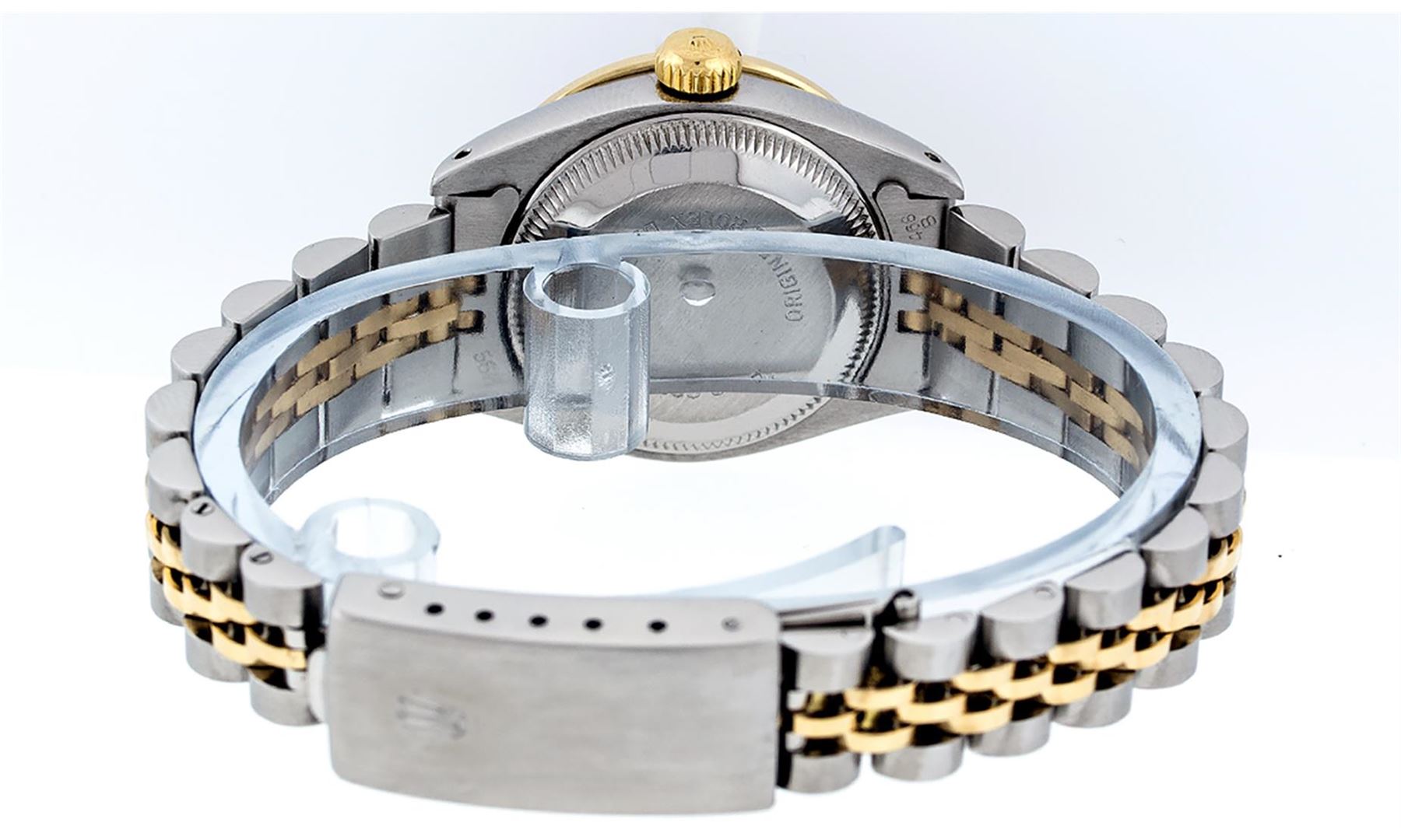 One Ladies Pre Owned Rolex Quickset Two Tone 18K Yellow Gold And Stainless Steel Datejust Polished, Serviced & Electronically Tested, Rolex Yellow Gold & Stainless Steel Case: 26mm, Rolex Yellow Gold Crown, Custom Bezel: New 18K Yellow Gold Sapphire Beadset Diamond Bezel, Diamond + Gem Count: 28 Diamonds + 4 Sapphires. Custom Crystal: New Sapphire With Magnified Date. Custom Hands: New Luminescent Hands. Rolex Movement: Automatic Winding Movement 2135. Custom Dial: Custom Blue Vignette Dial Set With Added Diamond Hour Markers, Diamond Count: 10 Diamond in Dial. Date Window: 3 O'Clock Position Date Display, Model: Quickset Datejust, Condition: G-6 Extra Fine. Rolex Bracelet: Two Tone Yellow Gold & Stainless Steel Jubilee Band. Bright Polish. 6.0 Inch Length, Adjustable. Standard Clasp, With Rolex Logo. This Watch Has Been Serviced Time Tested And Is In Excellent Condition It Is Free Of All Scratches And Dents.