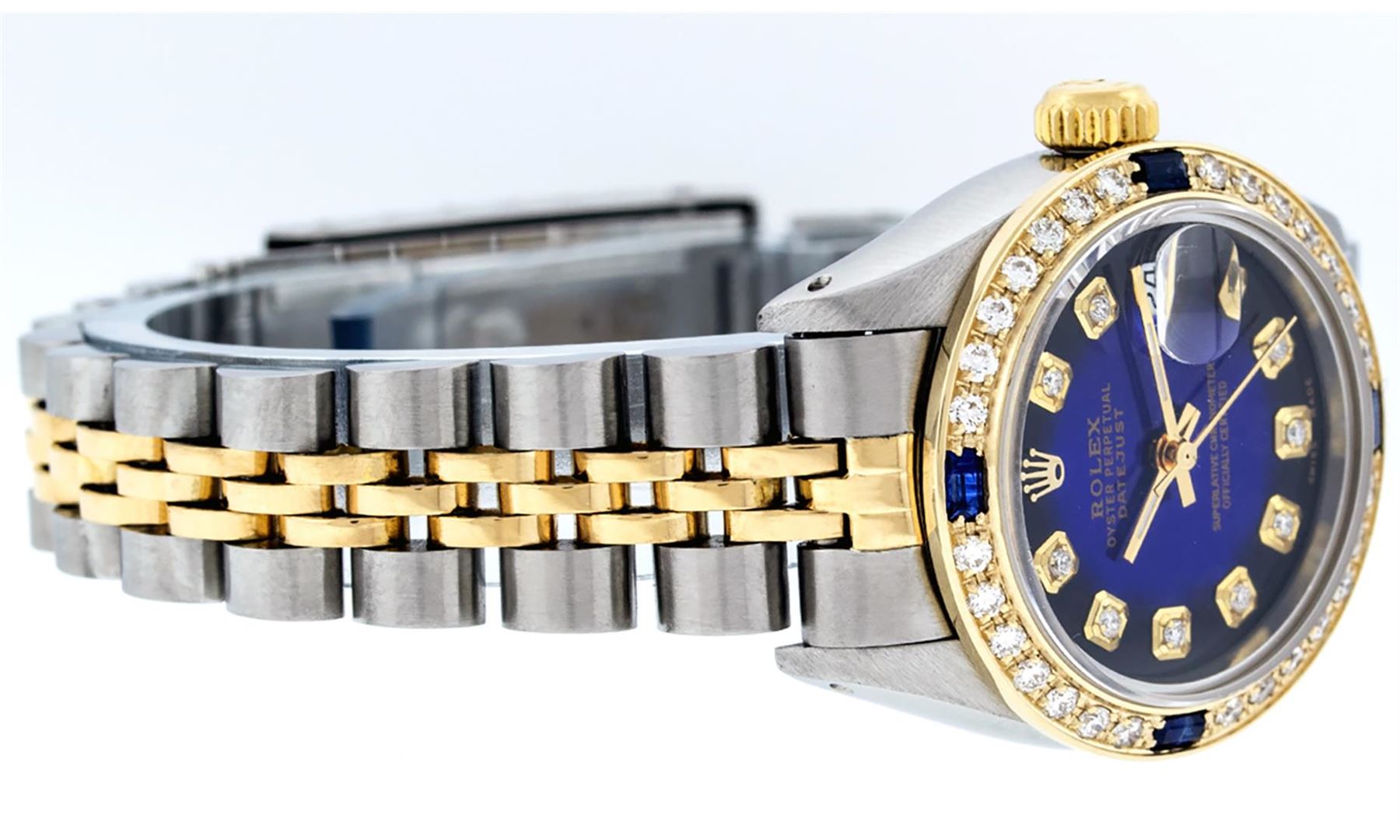 One Ladies Pre Owned Rolex Quickset Two Tone 18K Yellow Gold And Stainless Steel Datejust Polished, Serviced & Electronically Tested, Rolex Yellow Gold & Stainless Steel Case: 26mm, Rolex Yellow Gold Crown, Custom Bezel: New 18K Yellow Gold Sapphire Beadset Diamond Bezel, Diamond + Gem Count: 28 Diamonds + 4 Sapphires. Custom Crystal: New Sapphire With Magnified Date. Custom Hands: New Luminescent Hands. Rolex Movement: Automatic Winding Movement 2135. Custom Dial: Custom Blue Vignette Dial Set With Added Diamond Hour Markers, Diamond Count: 10 Diamond in Dial. Date Window: 3 O'Clock Position Date Display, Model: Quickset Datejust, Condition: G-6 Extra Fine. Rolex Bracelet: Two Tone Yellow Gold & Stainless Steel Jubilee Band. Bright Polish. 6.0 Inch Length, Adjustable. Standard Clasp, With Rolex Logo. This Watch Has Been Serviced Time Tested And Is In Excellent Condition It Is Free Of All Scratches And Dents.