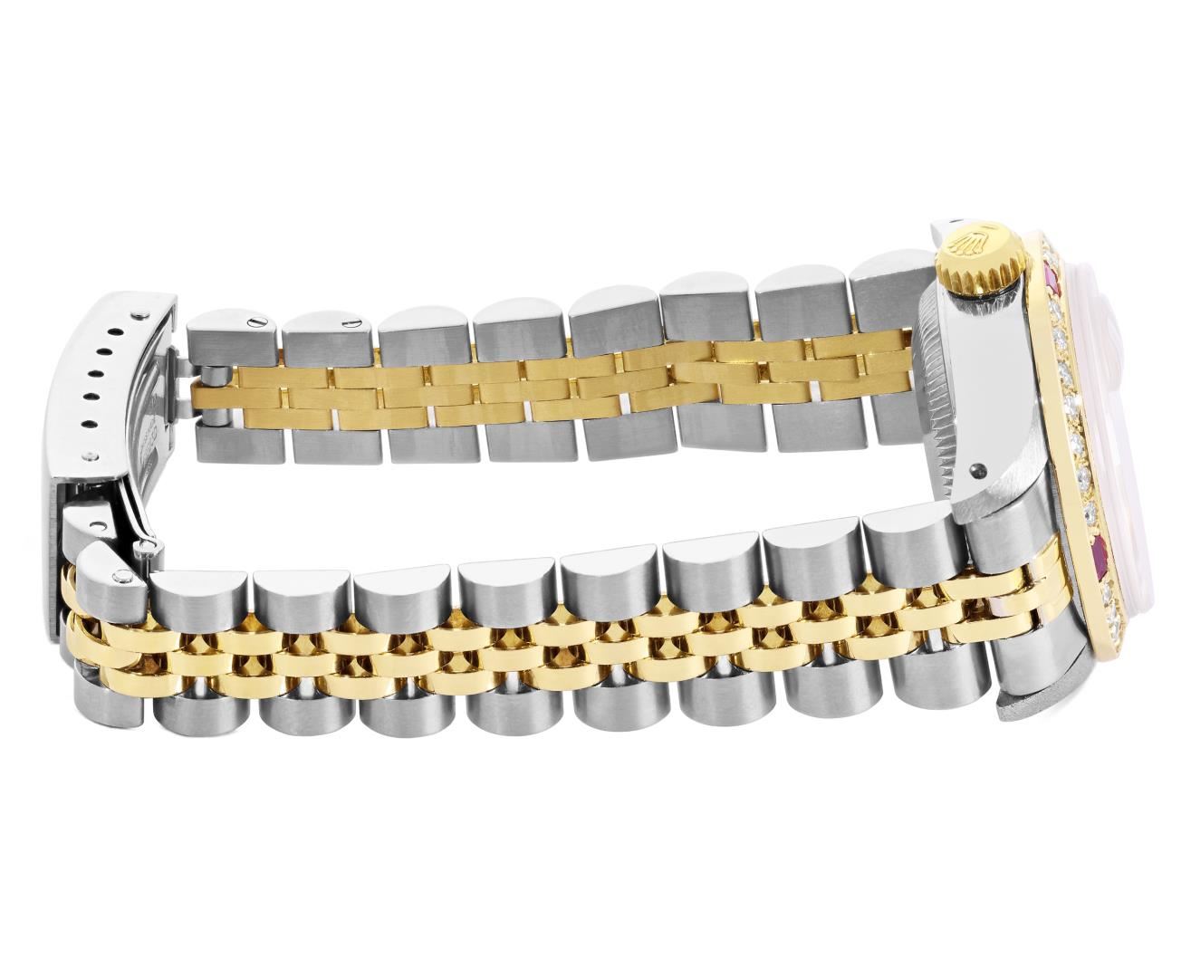 One Rolex Ladies Pre Owned Two Tone 14K Yellow Gold And Stainless Steel Rolex Date Polished, Serviced & Electronically Tested, Rolex Yellow Gold And Stainless Steel Case: 26mm, Rolex Yellow Gold Crown, Custom Bezel: New 18K Yellow Gold Ruby Beadset Diamond Bezel, Diamond + Gem Count: 36 Diamonds + 4 Rubies. Custom Crystal: New Acrylic With Magnifying Date Window. Custom Hands: New Luminescent Hands. Rolex Movement: Automatic Winding Movement 2035. Rolex Factory Dial: Champagne With Index Hour Markers And Dash Track. Date Window: 3 O'Clock Position Date Display, Condition: G-6 Extra Fine. Rolex Bracelet: Two Tone 14K Yellow Gold And Stainless Steel Jubilee Band. Bright Polish And Satin Finish. 6.0 Inch Length, Adjustable. Standard Clasp, With Rolex Logo. This Watch Has Been Serviced Time Tested And Is In Excellent Condition It Is Free Of All Scratches And Dents.