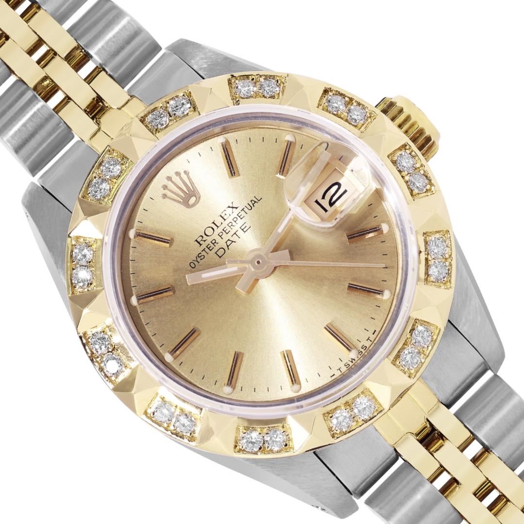 One Rolex Ladies Pre Owned Two Tone 14K Yellow Gold And Stainless Steel Rolex Date Polished, Serviced And Electronically Tested, Rolex Yellow Gold And Stainless Steel Case: 26mm, Rolex Yellow Gold Crown. Custom Bezel: New 18K Yellow Gold Pyramid Diamond Bezel, Diamond Count: 24 Diamonds On Bezel. Custom Crystal: New Sapphire Crystal With Date Window. Custom Hands: New Luminescent Hands. Rolex Movement: Automatic Winding Movement 2035. Rolex Factory Dial: Champagne With Index Hour Markers, Dash Track, and Lumi Dots. Date Window: 3 O'Clock Position Date Display, Condition: G-6 Extra Fine. Rolex Bracelet: Two Tone 14K Yellow Gold And Stainless Steel Jubilee Band. Bright Polish & Satin Finish. 6.0 Inch Length, Adjustable. Standard Clasp, With Rolex Logo. This Watch Has Been Serviced Time Tested And Is In Excellent Condition It Is Free Of All Scratches And Dents. This Watch Comes With A Rolex Box.