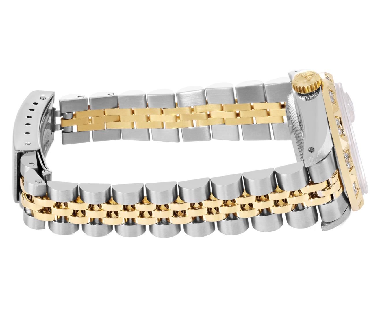 One Rolex Ladies Pre Owned Two Tone 14K Yellow Gold And Stainless Steel Rolex Date Polished, Serviced And Electronically Tested, Rolex Yellow Gold And Stainless Steel Case: 26mm, Rolex Yellow Gold Crown. Custom Bezel: New 18K Yellow Gold Pyramid Diamond Bezel, Diamond Count: 24 Diamonds On Bezel. Custom Crystal: New Sapphire Crystal With Date Window. Custom Hands: New Luminescent Hands. Rolex Movement: Automatic Winding Movement 2035. Rolex Factory Dial: Champagne With Index Hour Markers, Dash Track, and Lumi Dots. Date Window: 3 O'Clock Position Date Display, Condition: G-6 Extra Fine. Rolex Bracelet: Two Tone 14K Yellow Gold And Stainless Steel Jubilee Band. Bright Polish & Satin Finish. 6.0 Inch Length, Adjustable. Standard Clasp, With Rolex Logo. This Watch Has Been Serviced Time Tested And Is In Excellent Condition It Is Free Of All Scratches And Dents. This Watch Comes With A Rolex Box.