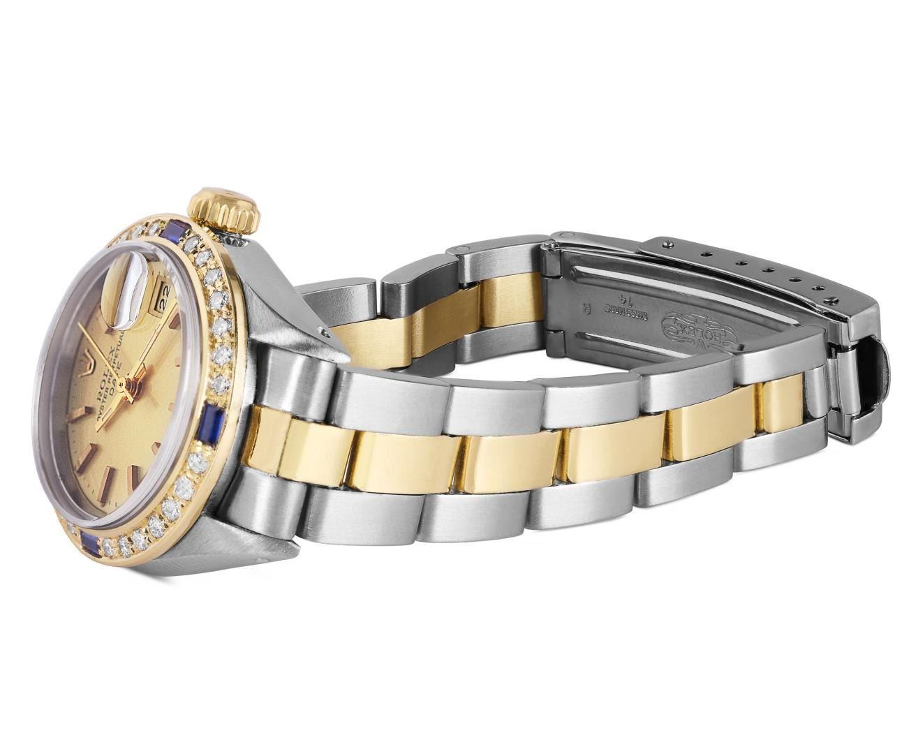 One Rolex Ladies Pre Owned Two Tone Yellow Gold And Stainless Steel Rolex Date Polished, Serviced & Electronically Tested, Rolex Yellow Gold And Stainless Steel Case: 26mm, Rolex Yellow Gold Crown. Custom Bezel: New 18K Yellow Gold Sapphire Diamond Bezel, Diamond Count: 28 Diamonds + 4 Sapphire. Crystal: Custom Sapphire Crystal With Date Window. Hands: Custom Luminescent Hands. Rolex Movement: 2035 Automatic Winding Movement. Rolex Factory Dial: Champagne Dial With Dash Track & Lumi Dots, Date Window: 3 O'Clock Position Date Display, Condition: G-6 Extra Fine. Rolex Bracelet: Two Tone 14K Yellow Gold And Stainless Steel Oyster Band. Bright Polish. 6.0 Inch Length, Adjustable. Standard Clasp, With Rolex Logo. This Watch Has Been Serviced Time Tested And Is In Excellent Condition It Is Free Of All Scratches And Dents. This Watch Comes With A Rolex Box.