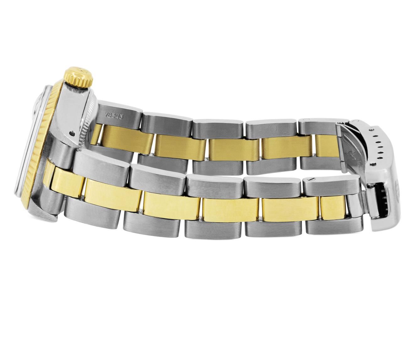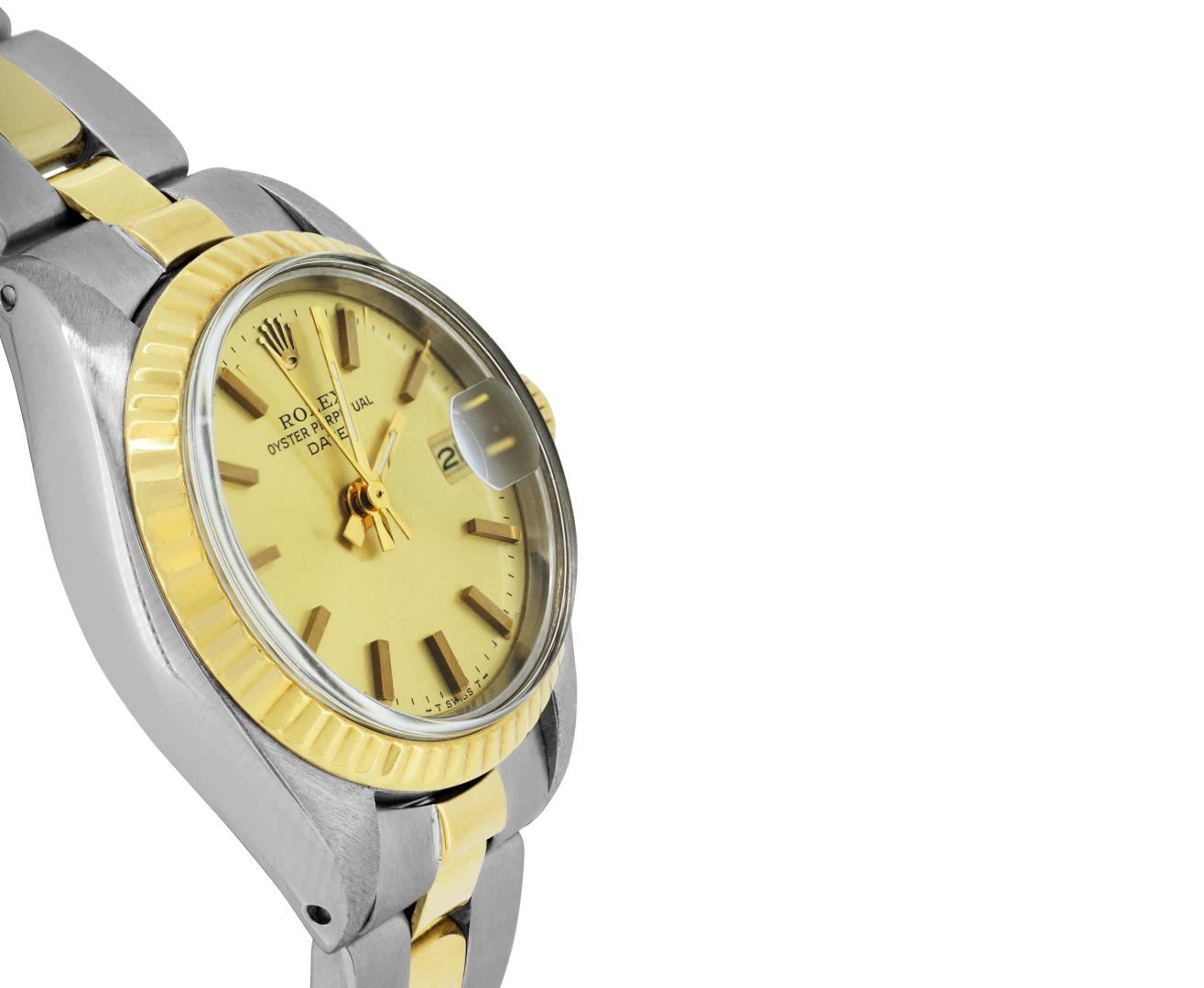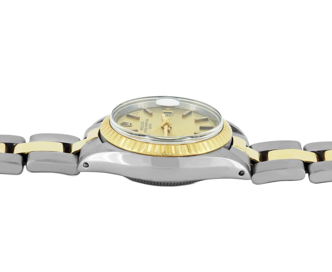 One Rolex Ladies Pre Owned Two Tone Yellow Gold And Stainless Steel Rolex Date Polished, Serviced & Electronically Tested, Rolex Yellow Gold And Stainless Steel Case: 26mm, Rolex Yellow Gold Crown. Rolex Bezel: 14K Yellow Gold Fluted Bezel. Custom Crystal: New Sapphire Crystal With Date Window. Hands: Custom Luminescent Hands. Rolex Movement: 2035 Automatic Winding Movement. Rolex Dial: Factory Champagne With Index Hour Markers, Dash Tracks, And Lumi Dots. Date Window: 3 O'Clock Position Date Display, Condition: G-6 Extra Fine. Rolex Bracelet: Two Tone Yellow Gold And Stainless Steel Oyster Band. Bright Polish And Satin Finish. 6.0 Inch Length, Adjustable. Standard Clasp, With Rolex Logo. This Watch Has Been Serviced Time Tested And Is In Excellent Condition It Is Free Of All Scratches And Dents. This Watch Comes With A Rolex Box.