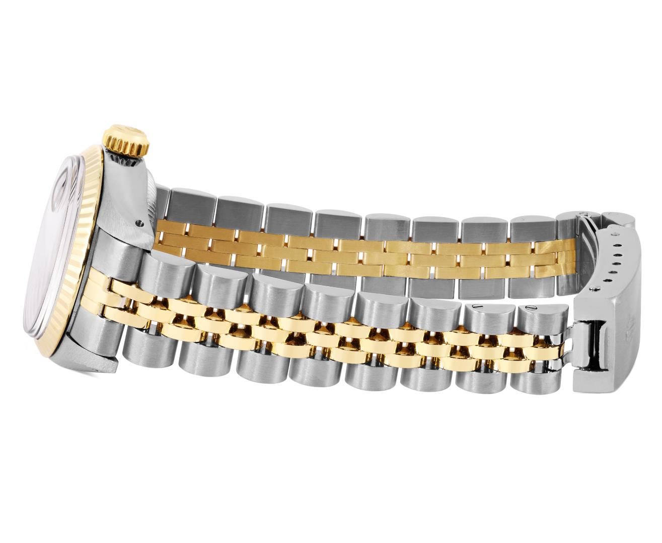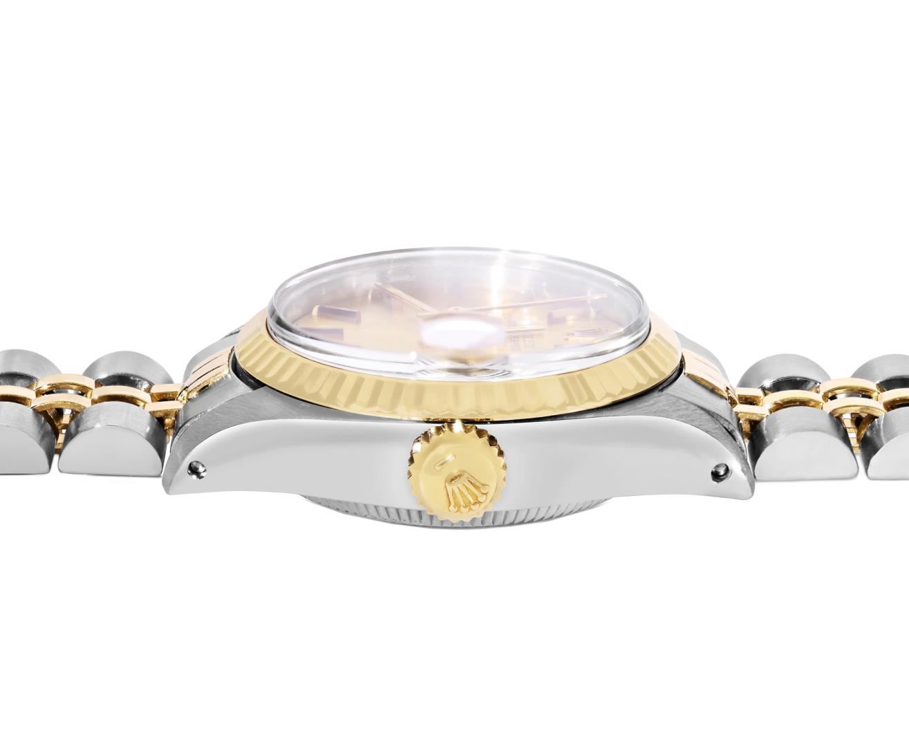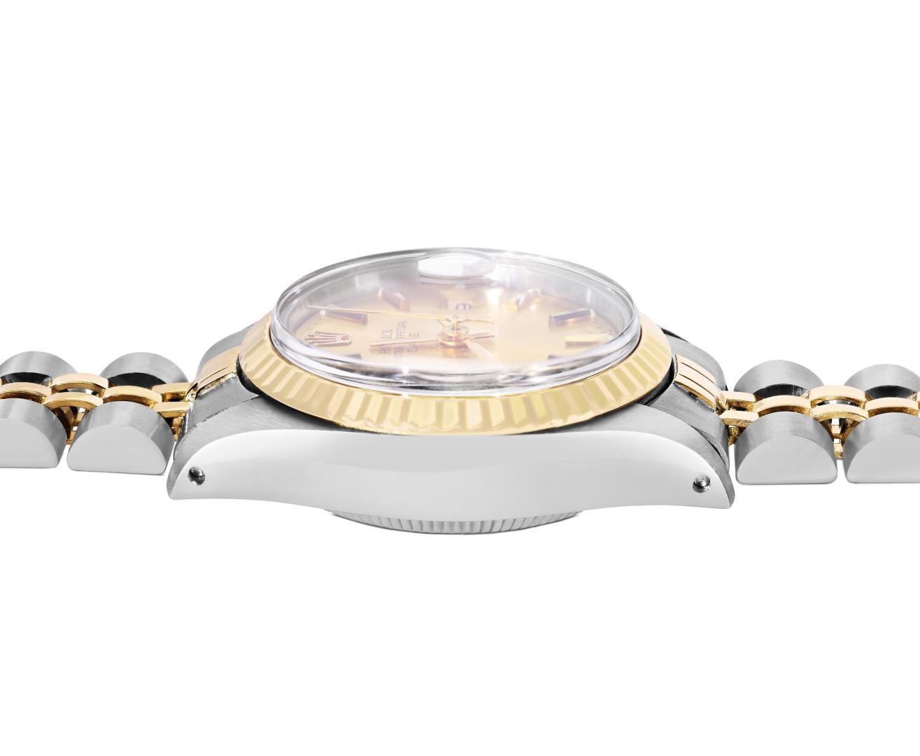 One Rolex Ladies Pre Owned Two Tone Yellow Gold And Stainless Steel Rolex Date Polished, Serviced & Electronically Tested, Rolex Yellow Gold & Stainless Steel Case: 26mm, Rolex Yellow Gold Crown, 14K Rolex Yellow Gold Fluted Bezel. Custom Crystal: New Acrylic With Magnifying Date Window. Custom Hands: Luminescent Hands. Rolex Movement: 2035 Automatic Winding Movement. Rolex Factory Dial: Champagne With Diamond Hour Markers And Dash Track. Date Window: 3 O'Clock Position Date Display, Condition: G-6 Extra Fine. Rolex Bracelet: Two Tone 14K Yellow Gold And Stainless Steel Jubilee Band. Bright Polish & Satin Finish. 6.0 Inch Length, Adjustable. Standard Clasp, With Rolex Logo. This Watch Has Been Serviced Time Tested And Is In Excellent Condition It Is Free Of All Scratches And Dents. This Watch Comes With A Rolex Box.