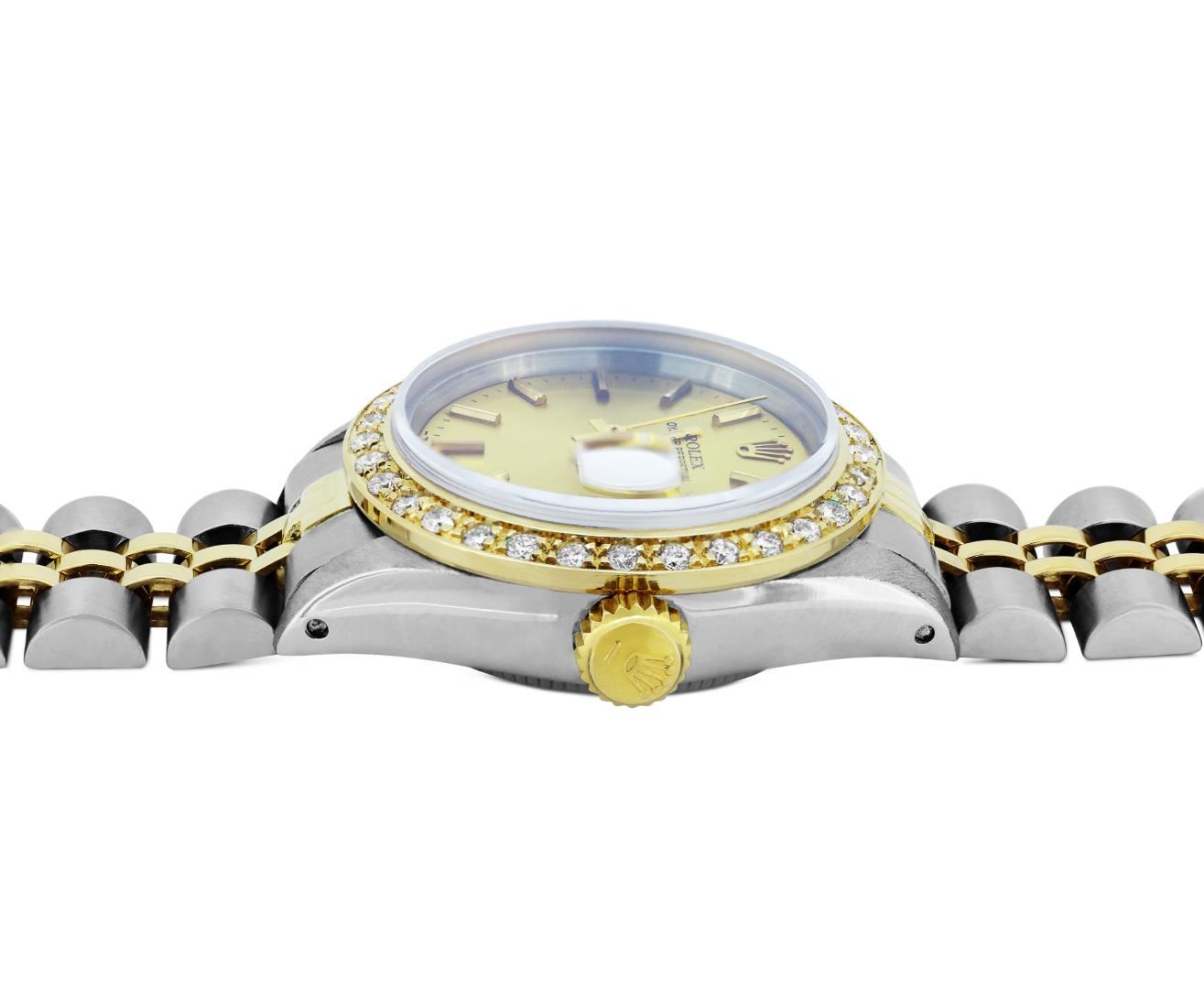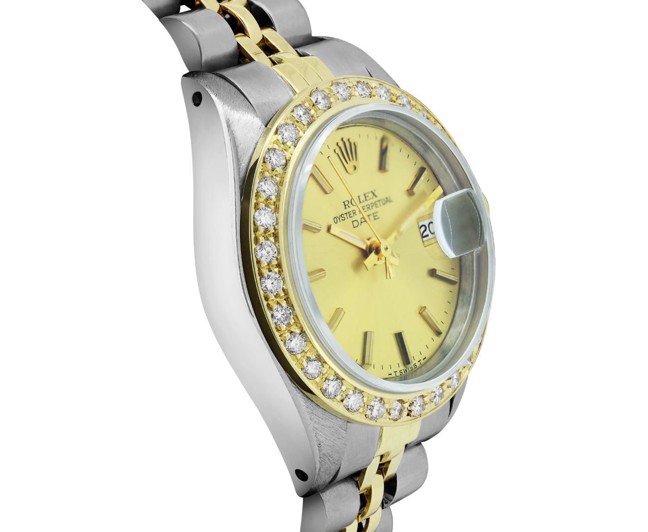 One Rolex Ladies Pre Owned Two Tone Yellow Gold And Stainless Steel Rolex Date Polished, Serviced & Electronically Tested, Rolex Yellow Gold And Stainless Steel Case: 26mm, Rolex Yellow Gold Crown. Custom Bezel: New 18K Yellow Gold Beadset Diamond Bezel, Diamond Count: 32 Diamonds On Bezel. Custom Crystal: Sapphire Crystal With Date Window. Custom Hands: Luminescent Hands. Rolex Movement: Automatic Winding Movement 2035. Rolex Factory Dial: Champagne With Index Hour Markers And Dash Track. Date Window: 3 O'Clock Position Date Display, Condition: G-6 Extra Fine. Rolex Bracelet: Two Tone 18K Yellow Gold And Stainless Steel Jubilee Band. Bright Polish & Satin Finish. 6.0 Inch Length, Adjustable. Standard Clasp, With Rolex Logo. This Watch Has Been Serviced Time Tested And Is In Excellent Condition It Is Free Of All Scratches And Dents. This Watch Comes With A Rolex Box.