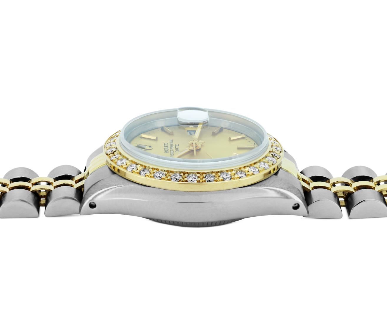 One Rolex Ladies Pre Owned Two Tone Yellow Gold And Stainless Steel Rolex Date Polished, Serviced & Electronically Tested, Rolex Yellow Gold And Stainless Steel Case: 26mm, Rolex Yellow Gold Crown. Custom Bezel: New 18K Yellow Gold Beadset Diamond Bezel, Diamond Count: 32 Diamonds On Bezel. Custom Crystal: Sapphire Crystal With Date Window. Custom Hands: Luminescent Hands. Rolex Movement: Automatic Winding Movement 2035. Rolex Factory Dial: Champagne With Index Hour Markers And Dash Track. Date Window: 3 O'Clock Position Date Display, Condition: G-6 Extra Fine. Rolex Bracelet: Two Tone 18K Yellow Gold And Stainless Steel Jubilee Band. Bright Polish & Satin Finish. 6.0 Inch Length, Adjustable. Standard Clasp, With Rolex Logo. This Watch Has Been Serviced Time Tested And Is In Excellent Condition It Is Free Of All Scratches And Dents. This Watch Comes With A Rolex Box.