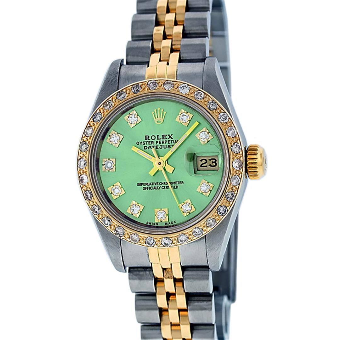 One Ladies Two Tone Rolex Datejust Polished, Serviced & Electronically Tested, 14K Yellow Gold & Stainless Steel Case:26mm, 14K Yellow Gold Crown, Custom Bezel: 18K Yellow Gold Beadset Diamond Bezel, Diamond Count: 32 Diamonds. Total Weight .70 Carat, Clarity: Si-VS, Color: G to H. Custom Crystal: Synthetic Sapphire Cyclops Lens. Movement: Automatic Winding Movement Caliber 2030. Custom Dial: Ice Green Single Cut VS Diamond Dial. Stone Count: 10 Diamonds In Dial, Clarity: VS, Color: G to H. Date Window: 3 O'Clock Position Date Display, Model: Datejust. Condition: G-6 Extra Fine. Bracelet: Two Tone 14K Yellow Gold & Stainless Steel Jubilee Band. Bright Polish. 6.0 Inch Length, Adjustable. Standard Clasp, With Rolex Logo.