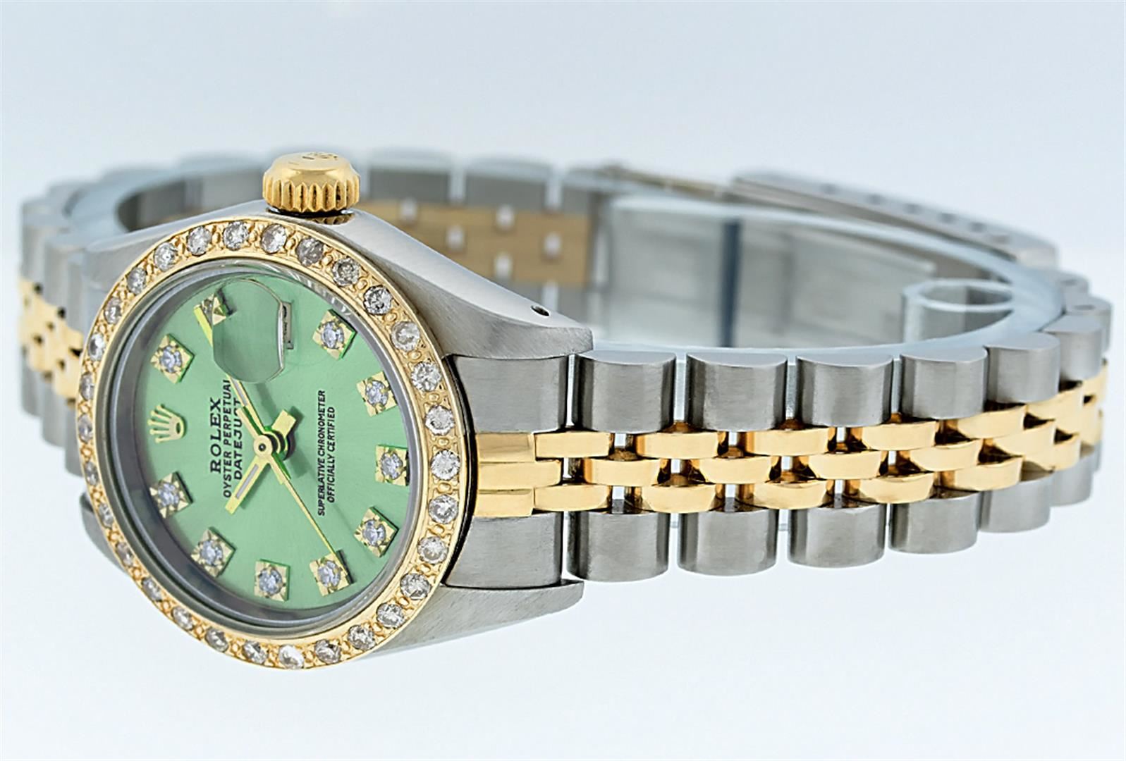 One Ladies Two Tone Rolex Datejust Polished, Serviced & Electronically Tested, 14K Yellow Gold & Stainless Steel Case:26mm, 14K Yellow Gold Crown, Custom Bezel: 18K Yellow Gold Beadset Diamond Bezel, Diamond Count: 32 Diamonds. Total Weight .70 Carat, Clarity: Si-VS, Color: G to H. Custom Crystal: Synthetic Sapphire Cyclops Lens. Movement: Automatic Winding Movement Caliber 2030. Custom Dial: Ice Green Single Cut VS Diamond Dial. Stone Count: 10 Diamonds In Dial, Clarity: VS, Color: G to H. Date Window: 3 O'Clock Position Date Display, Model: Datejust. Condition: G-6 Extra Fine. Bracelet: Two Tone 14K Yellow Gold & Stainless Steel Jubilee Band. Bright Polish. 6.0 Inch Length, Adjustable. Standard Clasp, With Rolex Logo.
