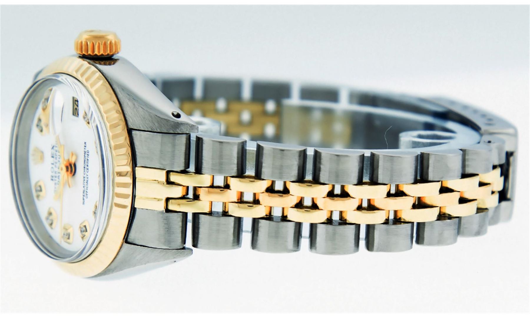 One Ladies Two Tone Rolex Datejust Polished, Serviced & Electronically Tested, 14K Yellow Gold & Stainless Steel Case:26mm, 14K Yellow Gold Crown, Bezel: 14K Yellow Gold Fluted Bezel. Custom Crystal: Acrylic Cyclops Lens. Movement: Automatic Winding Movement Caliber 2030. Custom Dial: Mother Of Pearl With Diamond Hour Markers, Diamond Count: 10 Diamonds, Color: G to H, Clarity: VS2-SI1. Date Window: 3 O'Clock Position Date Display, Non Quickset, Model: Datejust. Condition: G-6 Extra Fine. Bracelet: Two Tone 14K Yellow Gold & Stainless Steel Jubilee. Bright Polish. 6.0 Inch Length, Adjustable. Standard Clasp, With Rolex Logo.