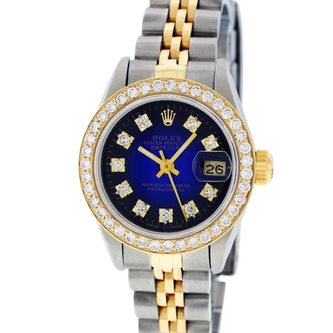 One Ladies Pre Owned Quickset Two Tone Yellow Gold And Stainless Steel Rolex Datejust Polished, Serviced And Electronically Tested, Yellow Gold and Stainless Steel Case: 26mm, Yellow Gold Crown, Custom Bezel: New 18K 1ctw Yellow Gold Beadset Diamond Bezel, Diamond Count: 42 Diamonds, Total Weight 1.00 Carat. Custom Crystal: New Sapphire With Magnified Date. Custom Hands: New Luminescent Hands. Rolex Movement: Automatic Winding Movement 2135. Custom Dial: Custom Blue Vignette Dial With Added Diamonds, Diamond Count: 10 Single Cut Diamonds On Dial. Date Window: 3 O'Clock Position Date Display, Model: Datejust, Condition: G-6 Extra Fine. Rolex Bracelet: Two Tone Yellow Gold And Stainless Steel Jubilee Band. Bright Polish. 6.0 Inch Length, Adjustable. Standard Clasp, With Rolex Logo. This Watch Has Been Serviced Time Tested And Is In Excellent Condition It Is Free Of All Scratches And Dents.