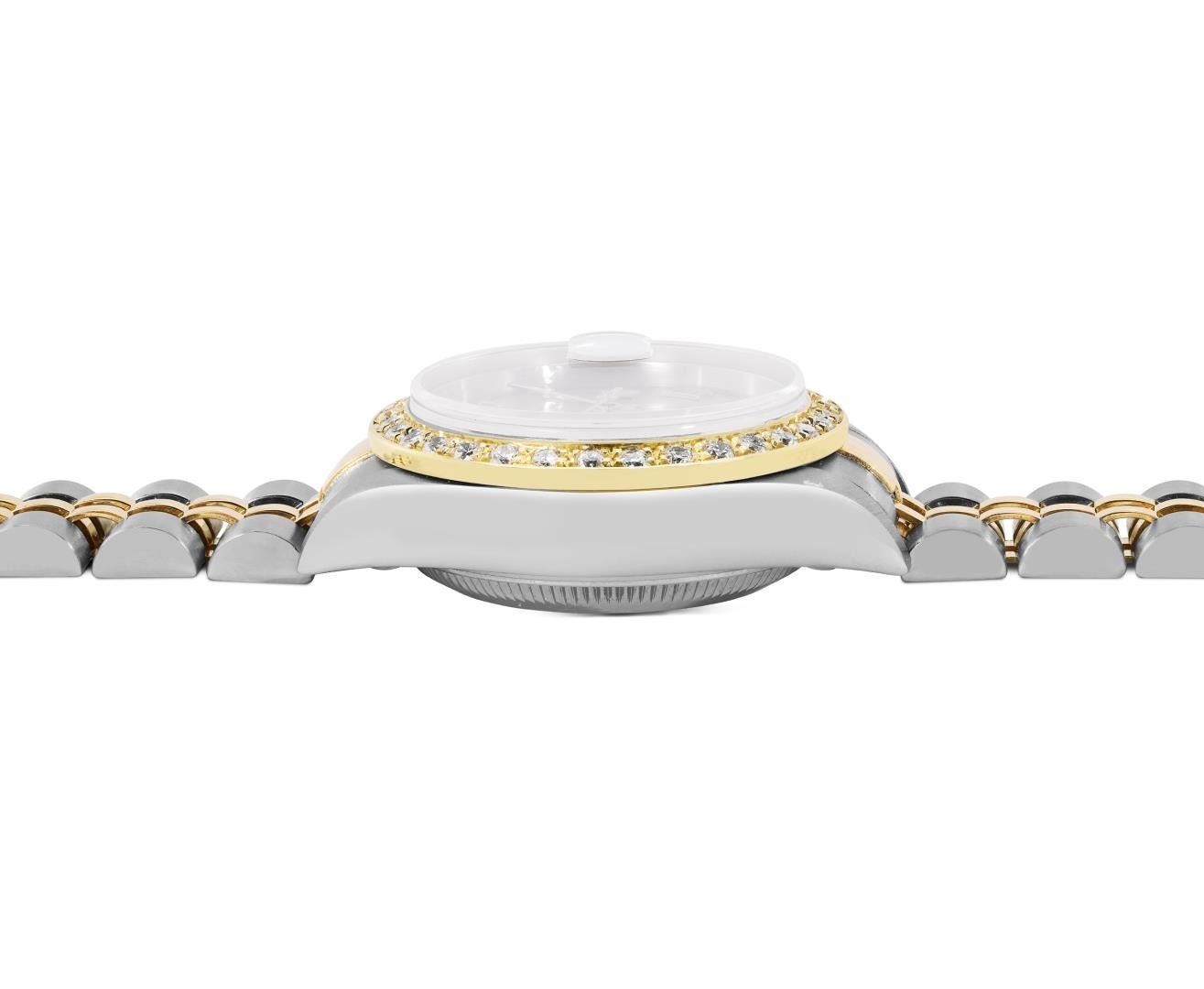 Rolex Ladies Pre Owned Sapphire Quickset Two Tone 18K Yellow Gold and Stainless Steel Datejust Polished Bright with Satin Finish, Serviced And Electronically Tested, Rolex Stainless Steel Case: 26mm, Rolex 18K Yellow Gold Crown, Custom Bezel: New 18K Yellow Gold Beadset Diamond Bezel, Diamond Count: 32 Diamonds On Bezel. Custom Crystal: New Sapphire With Magnified Date Window. Custom Hands: New Luminescent Hands. Rolex Movement: Automatic Winding Movement 2235. Rolex Dial: Factory Champagne With Roman Hour Markers And Square Track. Date Window: 3 O'Clock Position Date Display, Model: Quickset Datejust, Condition: G-6 Extra Fine. Rolex Bracelet: 18K Yellow Gold And Stainless Steel Jubilee Band. Bright Polish And Satin Finish. 6.0 Inch Length, Adjustable. Standard Clasp, With Rolex Logo. This Watch Has Been Serviced Time Tested And Is In Excellent Condition It Is Free Of All Scratches And Dents.