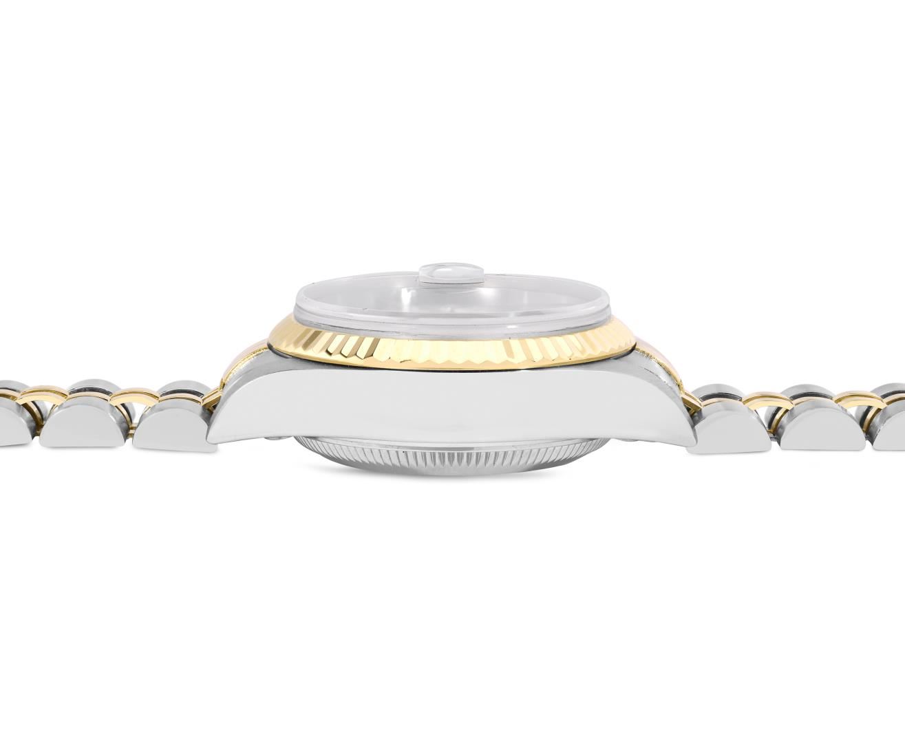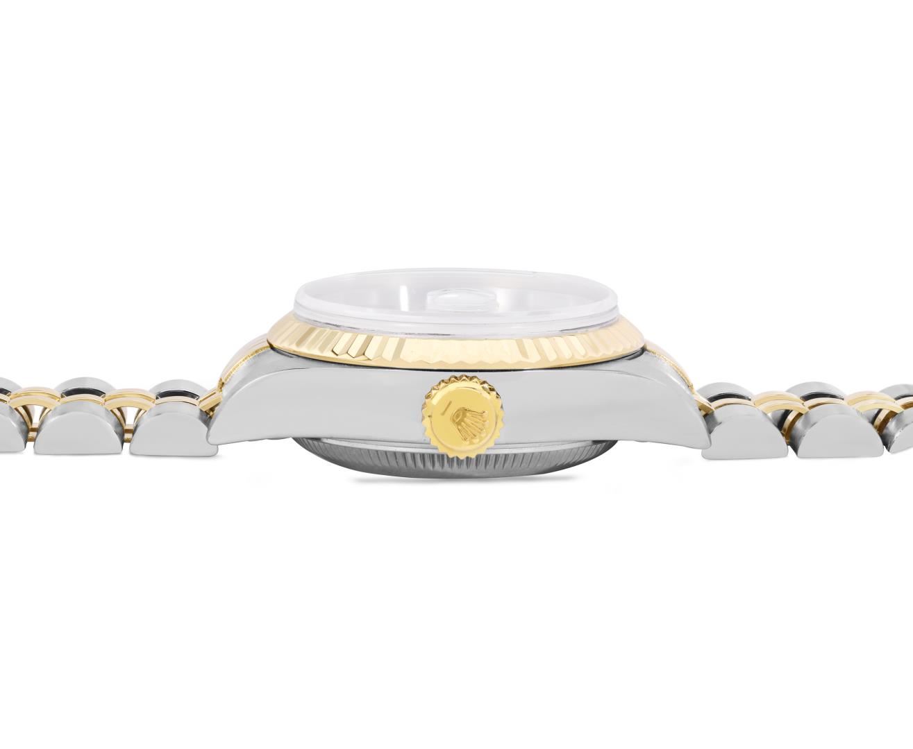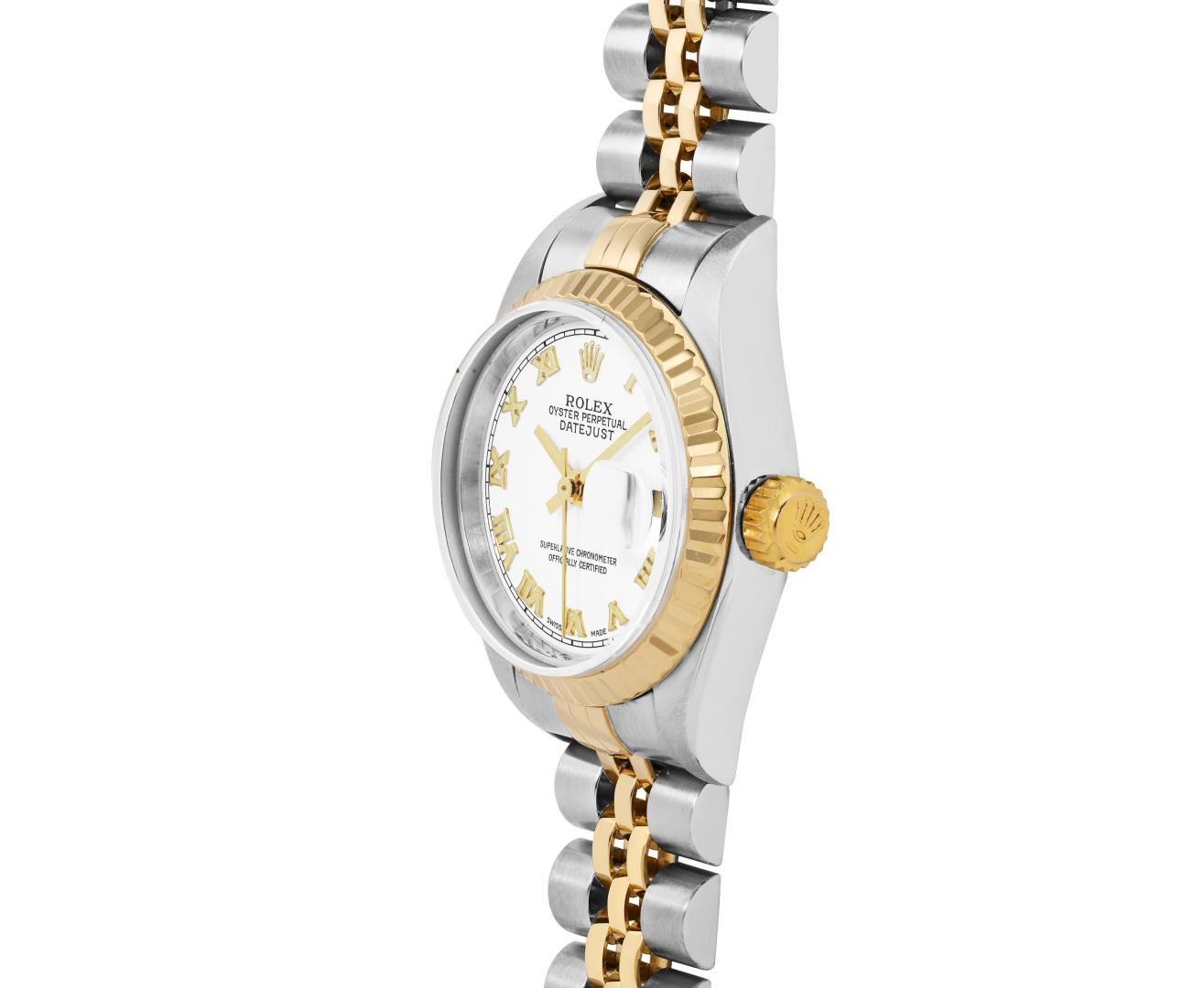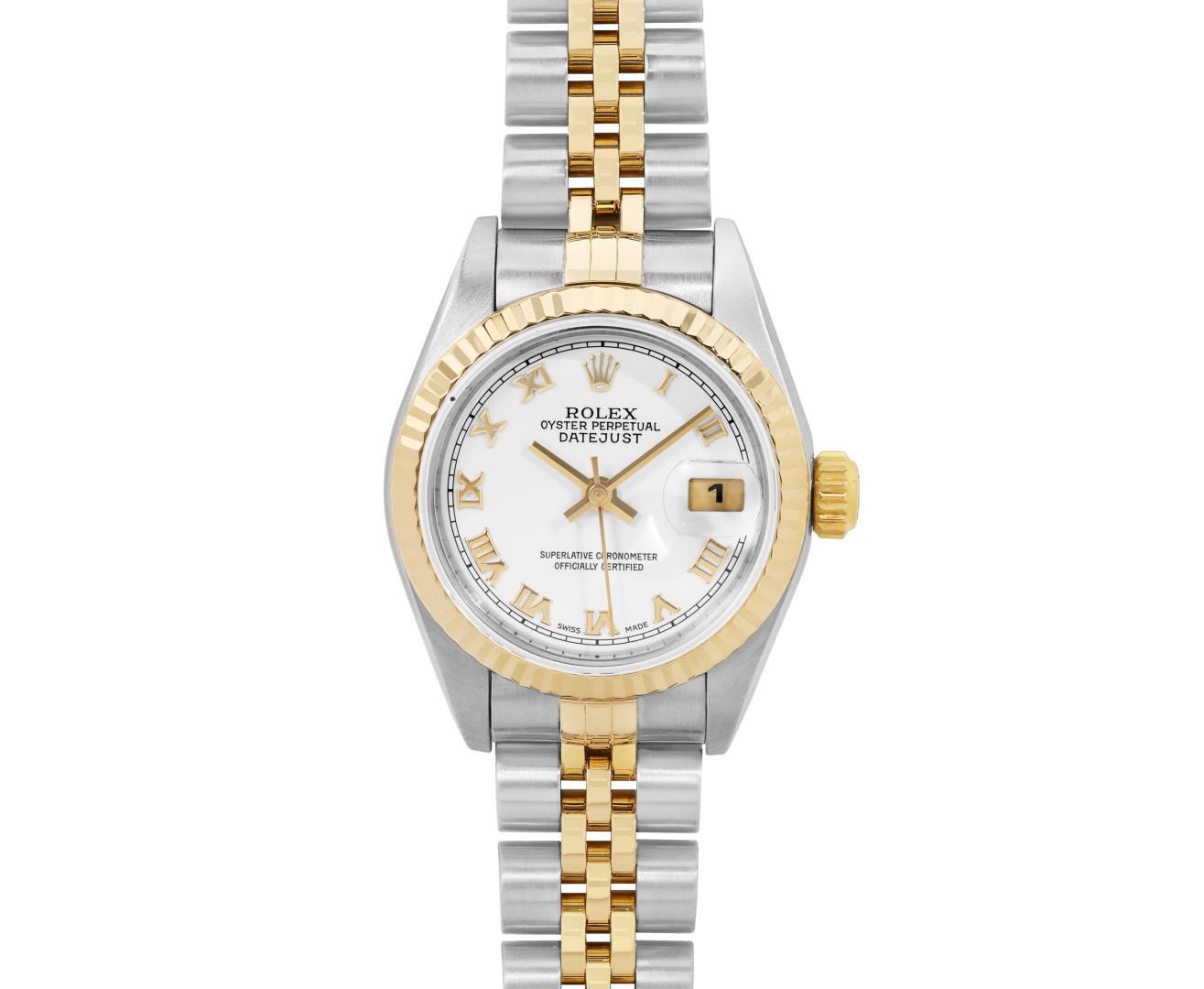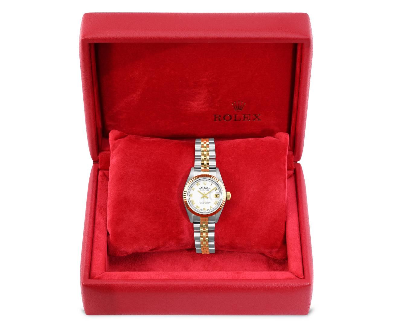 One Ladies Pre Owned Quickset Two Tone 18K Yellow Gold And Stainless Steel Sapphire Quickset Rolex Datejust Polished Bright with Satin Finish, Serviced And Electronically Tested, Rolex Stainless Steel Case: 26mm, Rolex 18K Yellow Gold Crown, Rolex Bezel: 18K Yellow Gold Fluted Bezel. Crystal: Sapphire With Magnified Date Window. Hands: Solid Hands. Rolex Movement: Automatic Winding Movement 2235. Rolex Dial: White Roman With Square Track. Date Window: 3 O'Clock Position Date Display, Model: Sapphire Quickset Datejust. Condition: G-6 Extra Fine. Rolex Bracelet: 18K Yellow Gold And Stainless Steel Jubilee Band. Bright Polish And Satin Finish. 6.0 Inch Length, Adjustable. Standard Clap, With Rolex Logo. This Watch Has Been Serviced Time Tested And Is In Excellent Condition It Is Free Of All Scratches And Dents. This Watch Comes With A Rolex Box.