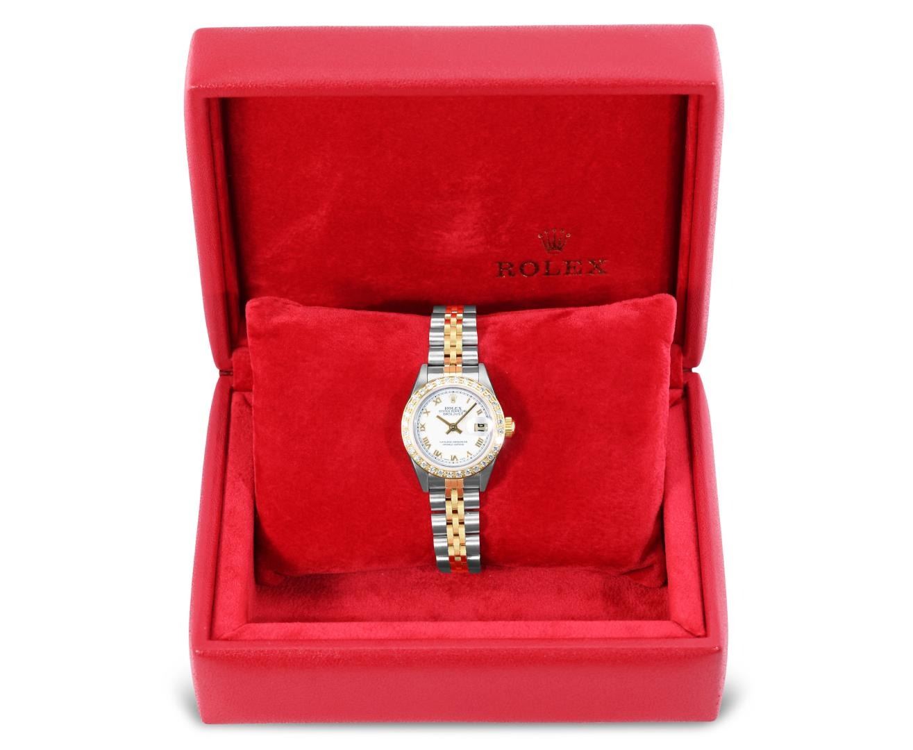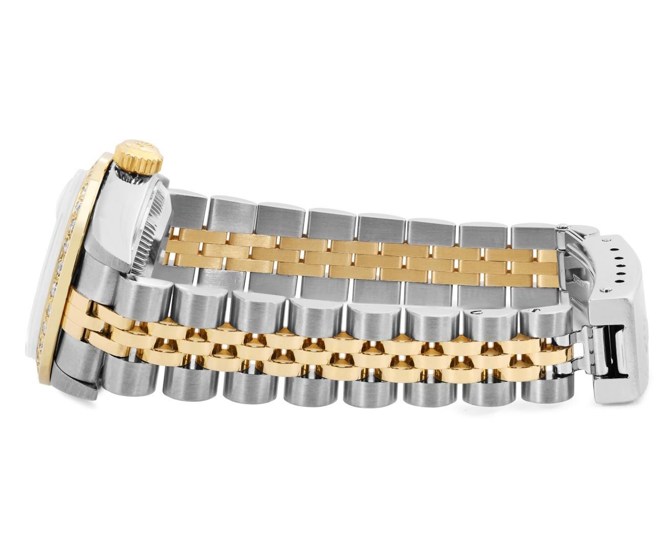 Rolex Ladies Pre Owned Sapphire Quickset 18K Yellow Gold and Stainless Steel Two Tone Datejust Polished Bright with Satin Finish, Serviced And Electronically Tested, Rolex Stainless Steel Case: 26mm, Rolex 18K Yellow Gold Crown, Custom Bezel: New 18K Yellow Gold Beadset Diamond Bezel, Diamond Count: 32 Diamonds On Bezel. Custom Crystal: New Sapphire With Magnified Date Window. Custom Hands: New Hands. Rolex Movement: Automatic Winding Movement 2235. Rolex Dial: Factory White With Roman Hour Markers And Square Track. Date Window: 3 O'Clock Position Date Display, Model: Quickset Datejust, Condition: G-6 Extra Fine. Rolex Bracelet: 18K Yellow Gold And Stainless Steel Jubilee Band. Bright Polish And Satin Finish. 6.0 Inch Length, Adjustable. Standard Clasp, With Rolex Logo. This Watch Has Been Serviced Time Tested And Is In Excellent Condition It Is Free Of All Scratches And Dents. This Watch Comes With A Rolex Box.